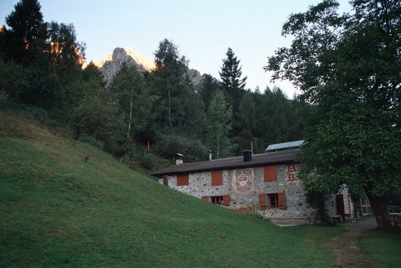 Dalej ścieżka – już fragment Alta Via Orobie Orientale -Sentiero No. 6- wspinała się przez łąki i stromy, zarośnięty cyklamenami las. Oznakowanie pojawiało się czasem ale było sporo miejsc gdzie błądziłyśmy. Jedyny spotkany facet- motocyklista, chyba pasterz- też nie miał mapy i nie mówił w żadnym znanym nam języku. Miałyśmy zamiar kupić mapę w schronisku… ale okazało się zamknięte. A w zasadzie nawet otwarte tylko puste. Takim jak my zostawiono całą jadalnię i jeszcze nie zakręcony na zimę kran. Na drzwiach wisiała kartka „sala zimowa”. Refugio Baito Iseo chociaż położone nisko (zaledwie na 1335 metrów nad poziomem morza) było klubowe i najwyraźniej stosowało się do przyjętych zwyczajów.