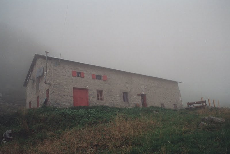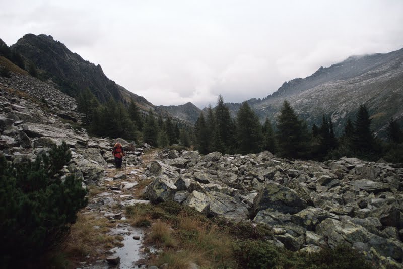 Szliśmy potem razem przez jakiś czas. Padało i wiał porywisty wiatr. Widoczność była kiepska, a moja znajomość Adamello jednak niewystarczająca. Zdecydowałyśmy się trzymać grupy i tak było już sporo wrażeń jak na pierwszy dzień. Przewodnik odradził nam trasę, która z geograficznego punktu widzenia wydawała się najbardziej sensowna, a podobno przebijała przez gęste krzaki na bardzo kruchym i stromym. Zeszłyśmy więc razem z Włochami do drogi w Val de Savoire, poszłyśmy na piwo, a potem korzystając z pomocy Santi (pogadał z pasterzami- pochodził z tej miejscowości) rozbiłyśmy namiot (daszek) na hali z widokiem na próg Doliny Adame.