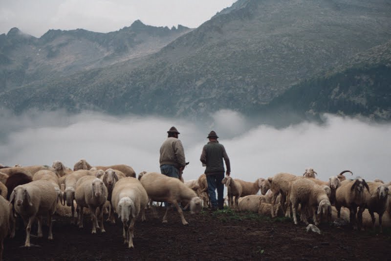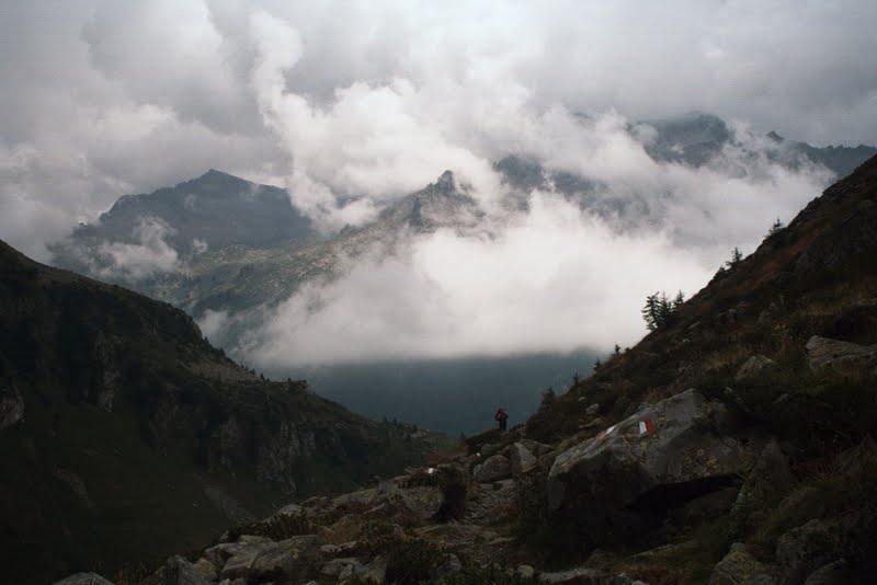 Najpierw zgubił aparat, który znalazł się później w spodniach, potem grzebiąc w plecaku w poszukiwaniu aparatu wyciągnął gdzieś i zostawił w trawie sandała… jakiegoś znalazł, ale był inny- jego czarny a znaleziony brązowy… potem chyba jednak odszukał swój i w końcu nawet jakby przyśpieszył i nas na chwilkę wyminął, ale i tak spotkałyśmy go znów za przełęczą. Dorwała nas burzowa chmura, wiało okropnie i zaczął padać śnieg. Schowałyśmy się na chwilkę, a Santi (bo tak się przedstawił) postanowił gonić swoich i z daleka widziałyśmy jak znów coś zgubił i potem wracał.