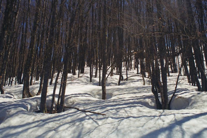 Wróciłam do lasu i szybko pogubiłam się w plątaninie gruntowych dróg, pozakopywałam w śniegu, pokręciłam w kółko i zamiast w Sansanet wylądowałam na szosie tylko kawałeczek poniżej Col de Somport- przy stacji narciarskiej. Zeszłam potem kilkaset metrów asfaltem i znalazłam zasypany GR65. Idzie przez łąki i las. Jak już się człowiek wydobędzie z zasp to całkiem przyjemna droga. Szosę niestety czasami widać. Nic nie jechało więc niewielka szkoda.