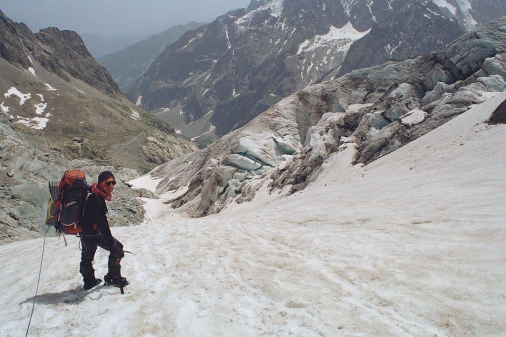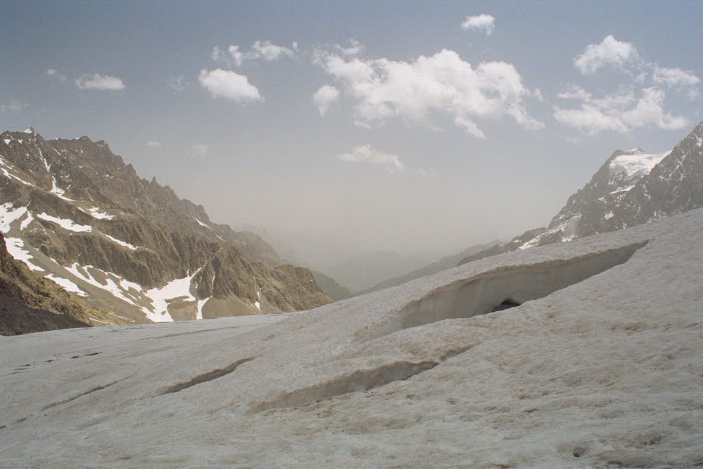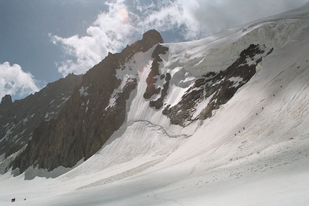 Fajna ścieżka idąca wąską grzędą nad bardzo stromym urwiskiem. Po zboczu co chwila osypywał się piach, opadając na zasypany kamieniami Czarny Lodowiec. To właśnie opadającym na lód pyłom zawdzięcza swą nazwę Glacier Noir. Jest brudny. Pyły zabarwiają nawet stary lód.