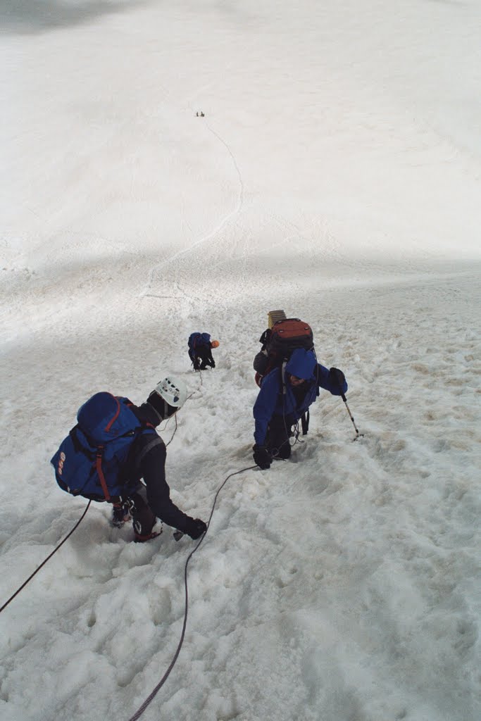 Kiedy podeszliśmy pod stromiznę lodowca pierwsi zdobywcy już schodzili. Na podejściu zrobił się prawdziwy tłok. Zabawnie było obserwować grupy związanych ze sobą ludzi, przewracające się kolejno jak kostki domina. Nikt jakoś nie walczył. Ten lodowiec kończy się wypłaszczeniem więc ryzyka wielkiego nie było.