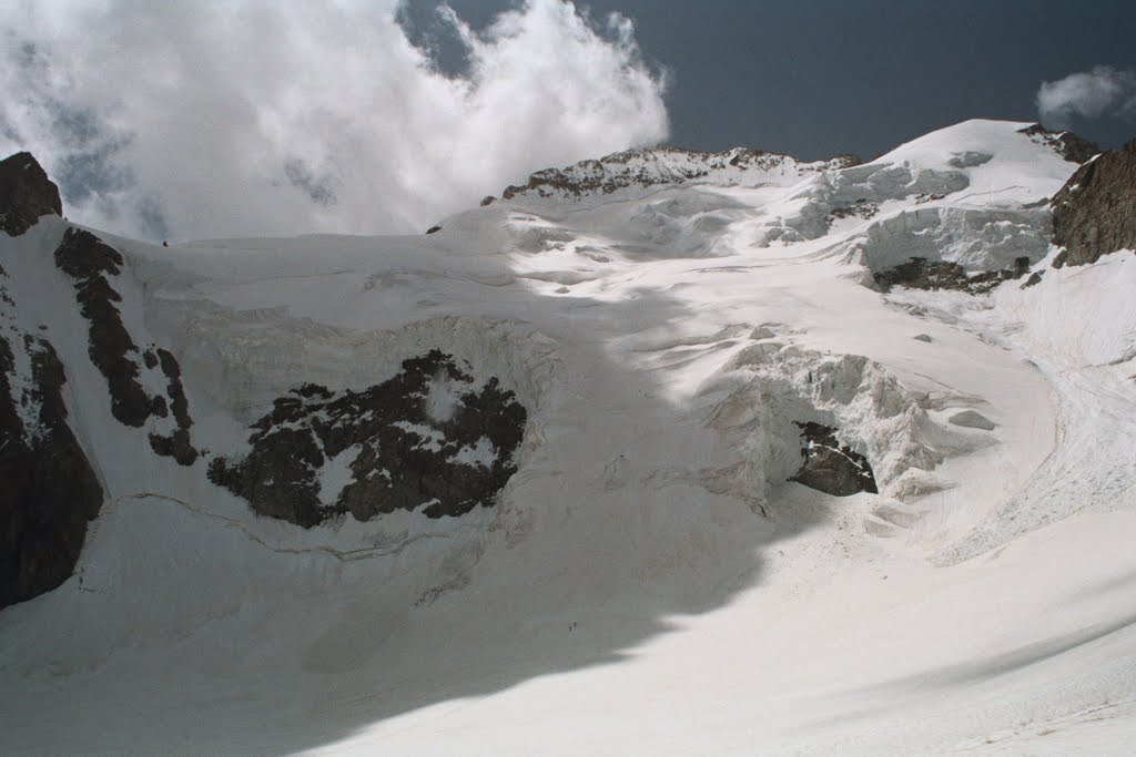 Weszliśmy tylko ponad niższe seraki. Ludzie schodzący z góry powiedzieli, że śnieg już za bardzo rozmiękł i nie uda nam się przejść śnieżnych mostów nad szczelinami, które są wyżej. Trochę szkoda, bo przeszliśmy już największą stromiznę (nie wiem kiedy oberwał się serak po prawej, ale zabrał bardziej płaską ścieżkę i teraz jest tylko jedna- na wprost pomiędzy obrywami-bardzo stroma).