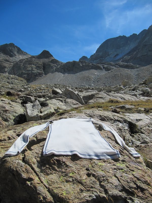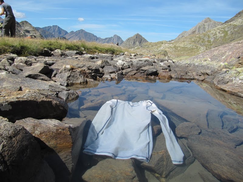 Koszulka sprawiła mi dużo radości. Chodziłam w niej kiedy zaczynało się ochładzać wieczorem i rano zanim jeszcze zrobił się skwar. W nocy kiedy we wrześniu w górach niemal codziennie był mróz zakładałam na nią jeszcze powerstretcha. Testowo przez kilka nocy w niej spałam, a żeby nie spać w brudnej uprałam ją raz w potoku.