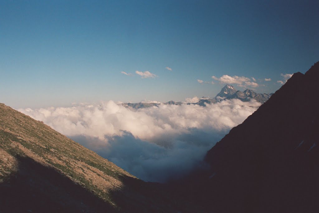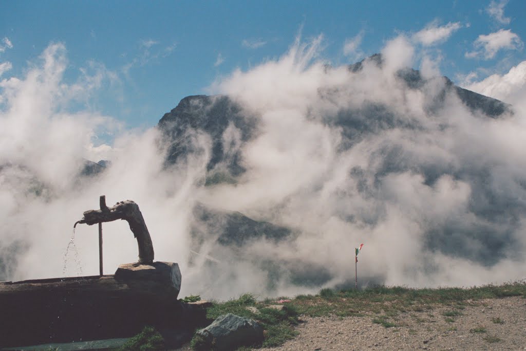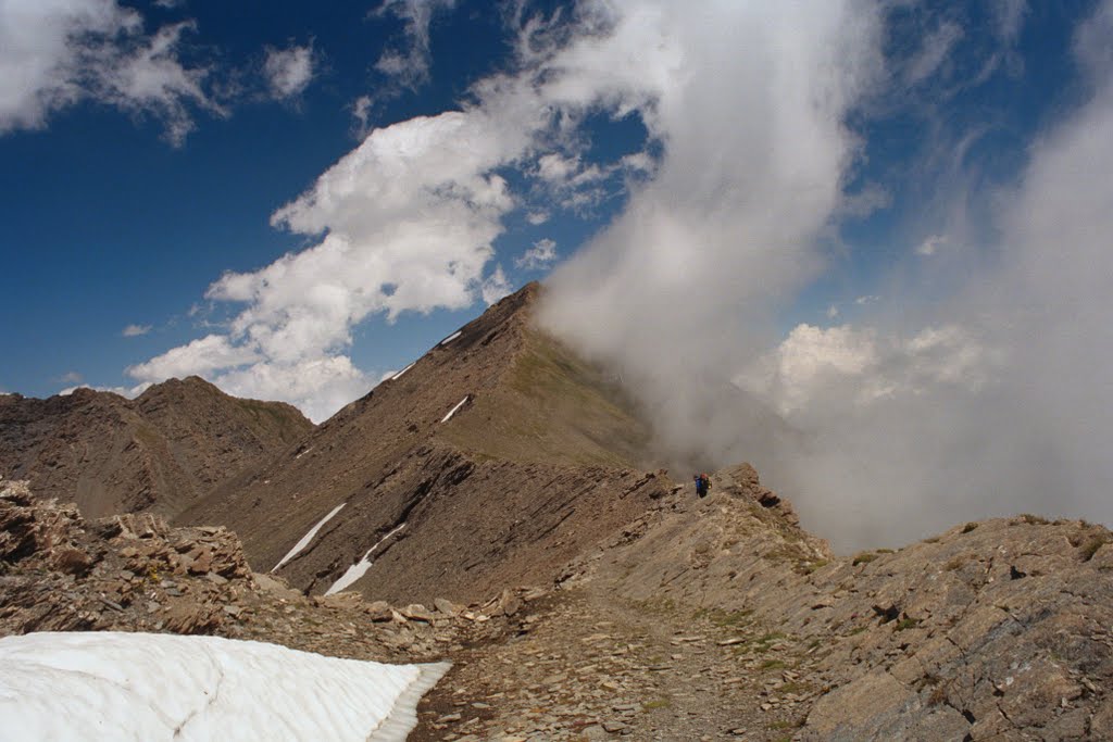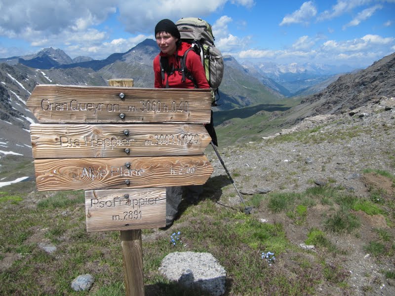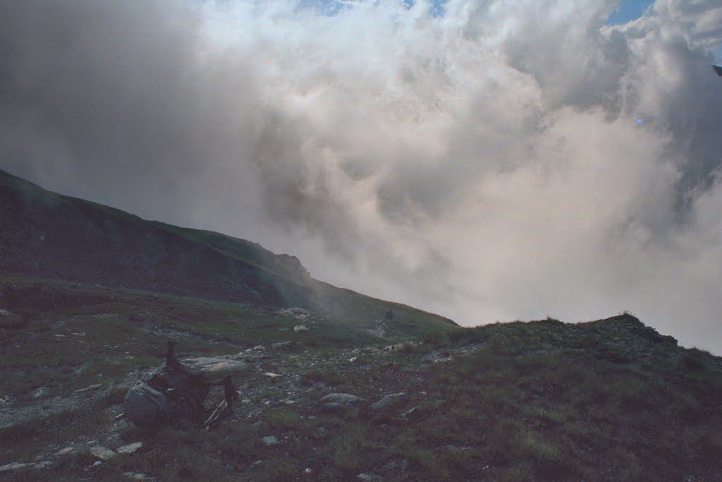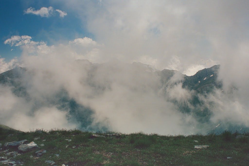 Na grani dopadła nas gęsta mgła i straciliśmy trochę czasu, ale co jakiś czas chmury rozwiewały się więc dotarliśmy na Passo Rous. Okropnie wiało.