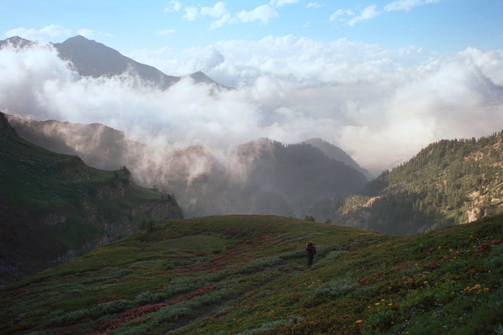 Zejście zaczęło się niewinnie- szeroka wojskowa droga, która potem znienacka skończyła się bez uprzedzenia. Mieliśmy bardzo mało czasu więc po szybkim rzucie oka na mapę ( niezbyt pouczającym bo znów otuliła nas mgła) pobiegliśmy według biało czerwonych znaków w dół ignorując ewidentny brak ścieżki. Było stromo, było krucho, było raczej bez sensu- do tego zupełnie inaczej niż na mapie, ale było już za późno żeby kombinować. Następnego dnia w południe musieliśmy już być w Bergamo.