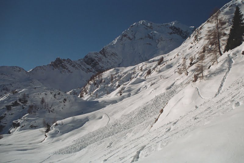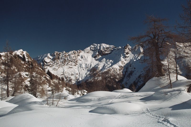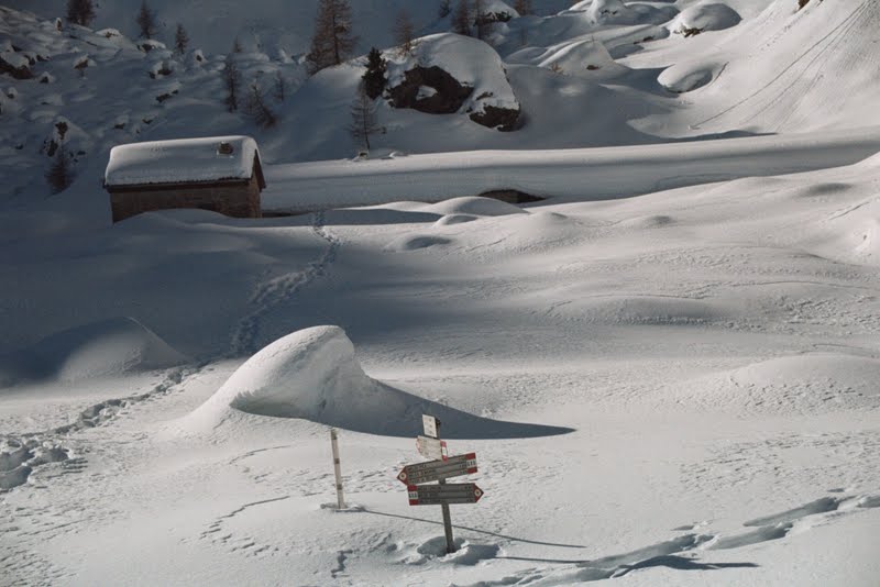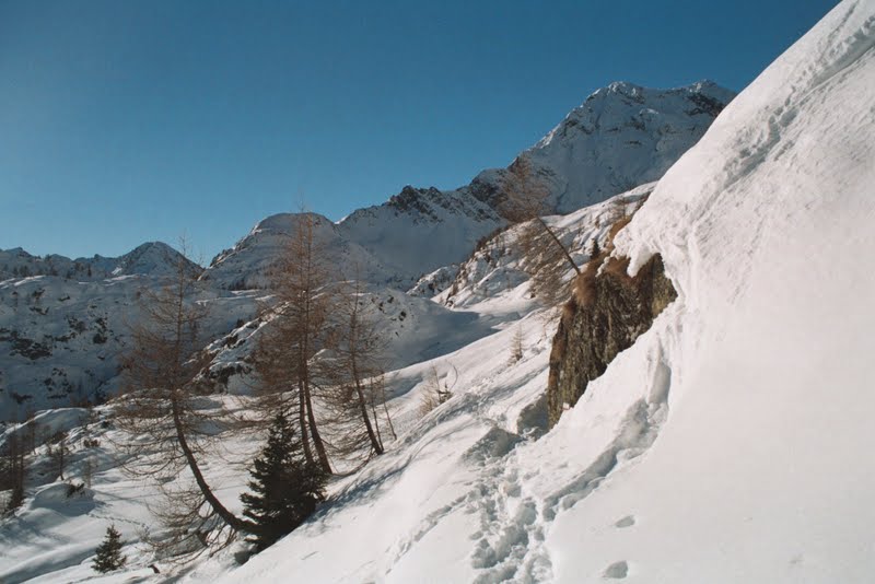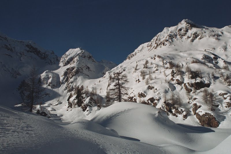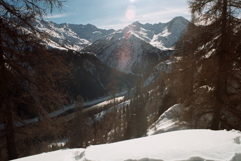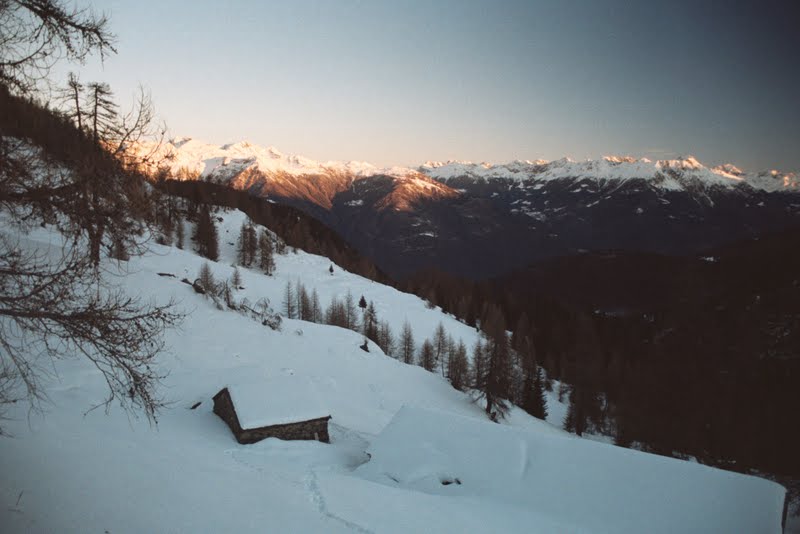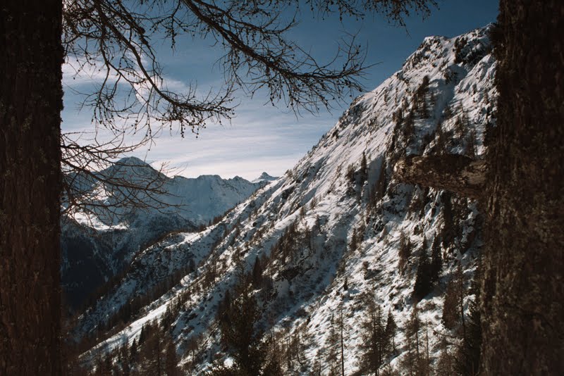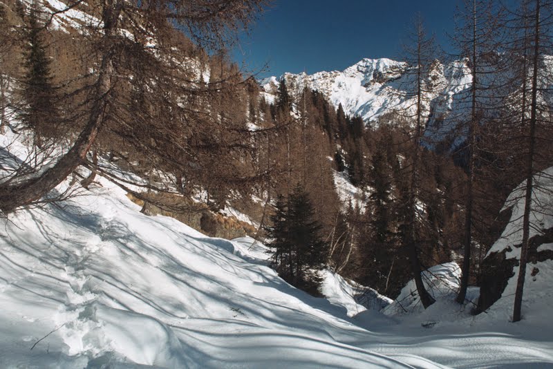 To w zasadzie koniec najbardziej dzikiej części. Zeszłam szybko, nie zajęło to pewnie więcej niż dwie godziny. Poszłam potem w dół drogą, aż do miejsca gdzie w poniedziałek zostawiliśmy samochód, a potem inną drogą, zaśnieżoną tak, że szłam w rakietach, trawersem do bezludnego zimą miasteczka Carona. Obejrzałam sąsiednią dolinę… przenocowałam całkiem wygodnie, wyszłam na wysoką halę i z braku innych możliwości wróciłam…mam sporo ładnych zdjęć. Nie opuściło mnie już uczucie zadowolenia. Podobało mi się w zasadzie wszystko. Postaram się o tym jeszcze napisać, ale nie dzisiaj bo późno. W ten weekend będziemy na targach nurkowych w Warszawie. Są w Pałacu Kultury (Podwodna Przygoda, stoisko 45), gdyby ktokolwiek miał ochotę się z nami spotkać- zapraszam!