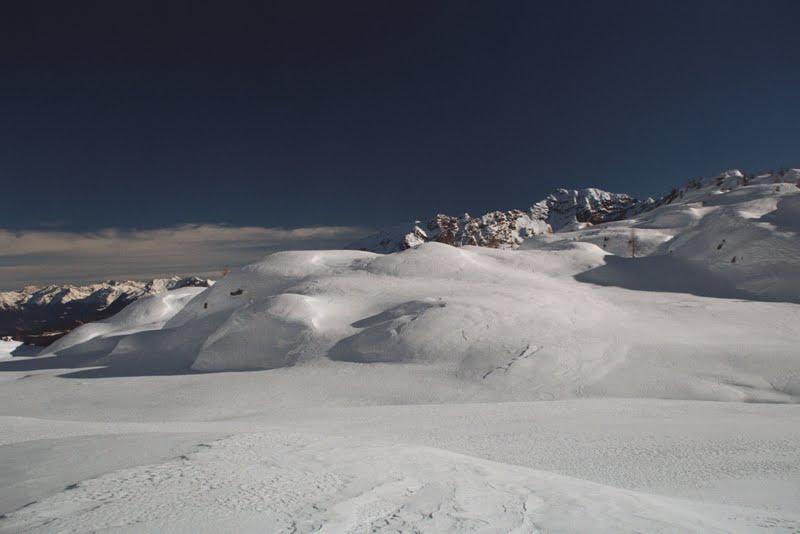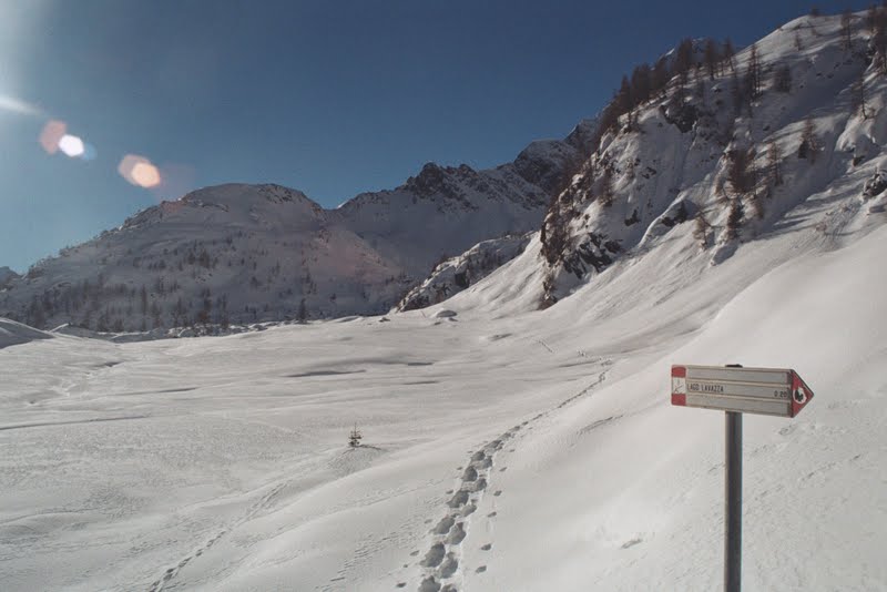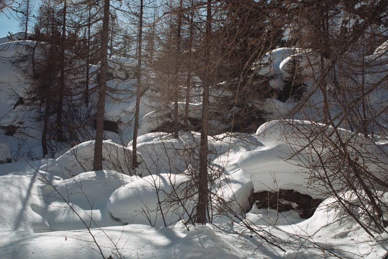 Szybko minęłam Casa del Caccia ( wciąż ani śladu skrótu) i zeszłam po śladach narciarzy przebijających się na wprost przez las. Aż dziwne jak fajnie trzymają w sypkim śniegu rakiety. Schodzi się znacznie łatwiej niż w marcu, kiedy śnieg jest zbity i ciężki.