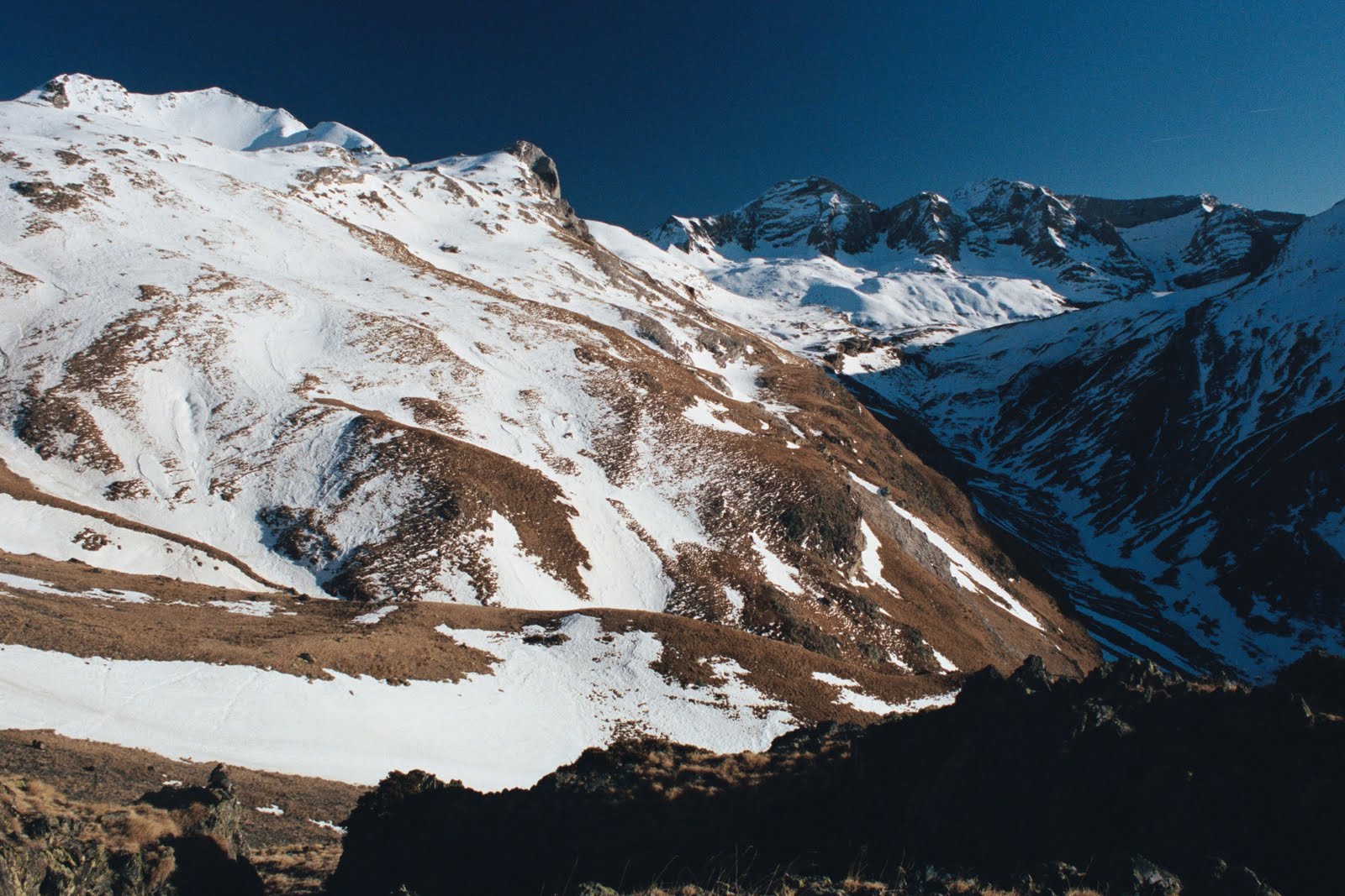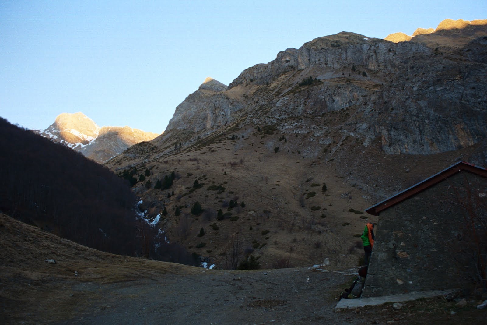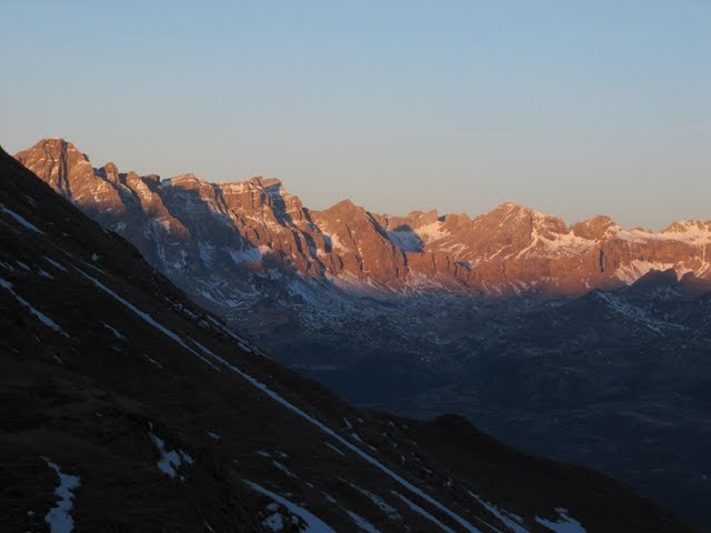 … Właściwie miałam zamiar tego nie opisywać ( tak jak nie zdradza się zakończenia powieści- gdyby ktoś w Was chciał powtórzyć tę trasę zimą, niech lepiej dalszego kawałka nie czyta :)) Poszukiwanie zejścia z Espelunzy okazało się fascynującą układanką, troszkę wkurzającą bo z wolna robiło się coraz później. Ścieżka wyszła na oblodzone zbocze i zamiast schodzić zaczęła piąć się pod górę po przeciwległym stoku.Śnieg zgrabnie ukrywał wszelkie znaki i długo kluczyliśmy poszukując zejścia w paskudnej stromiźnie. Być może latem, kiedy widać gdzie iść, jest tam całkiem łatwo. Zimą, w gęstniejącym zmroku było trudno. Nieoznakowana ścieżka schodzi samym grzbietem malowniczego uskoku, na krawędzi wypiętrzonych ukośnie skałek. Bardzo proste jak już się to wie:)