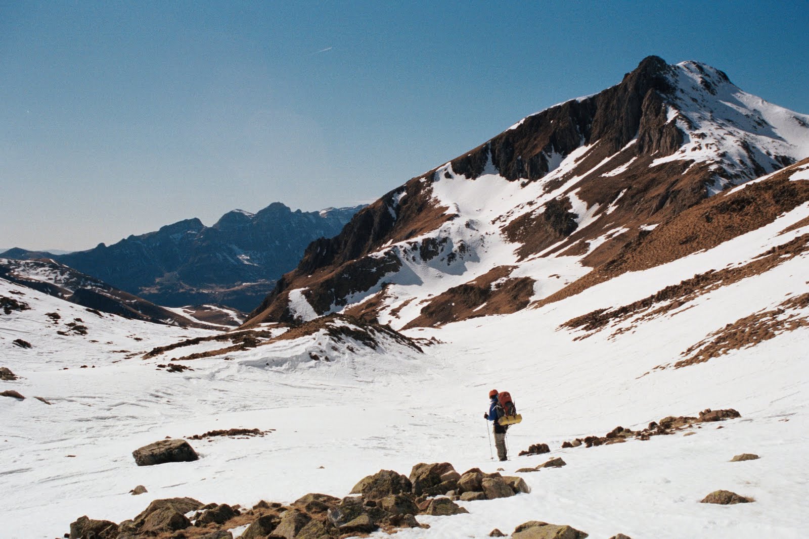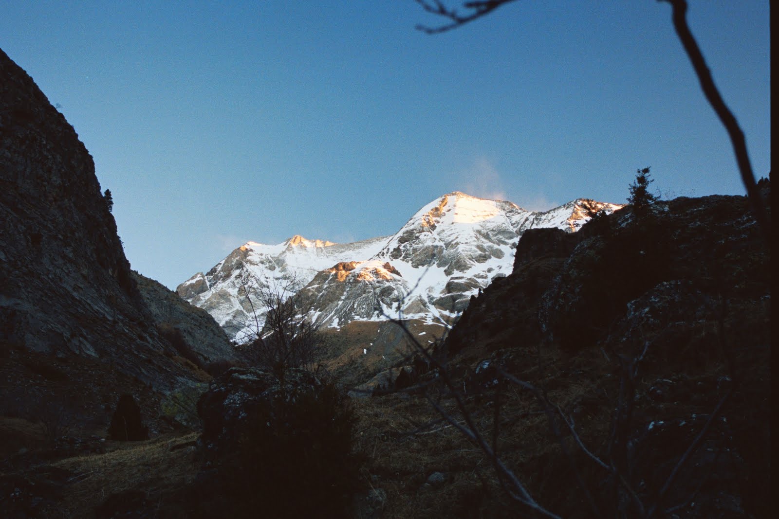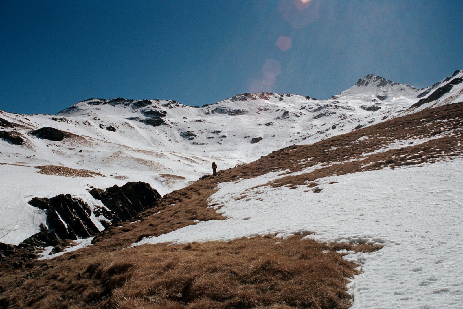 … Właściwie miałam zamiar tego nie opisywać ( tak jak nie zdradza się zakończenia powieści- gdyby ktoś w Was chciał powtórzyć tę trasę zimą, niech lepiej dalszego kawałka nie czyta :)) Poszukiwanie zejścia z Espelunzy okazało się fascynującą układanką, troszkę wkurzającą bo z wolna robiło się coraz później. Ścieżka wyszła na oblodzone zbocze i zamiast schodzić zaczęła piąć się pod górę po przeciwległym stoku.Śnieg zgrabnie ukrywał wszelkie znaki i długo kluczyliśmy poszukując zejścia w paskudnej stromiźnie. Być może latem, kiedy widać gdzie iść, jest tam całkiem łatwo. Zimą, w gęstniejącym zmroku było trudno. Nieoznakowana ścieżka schodzi samym grzbietem malowniczego uskoku, na krawędzi wypiętrzonych ukośnie skałek. Bardzo proste jak już się to wie:)