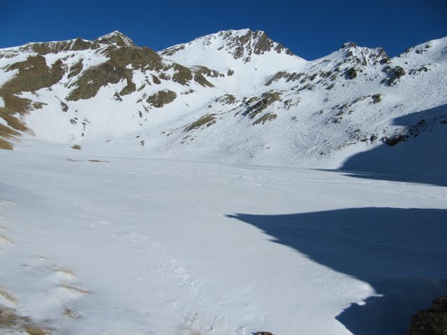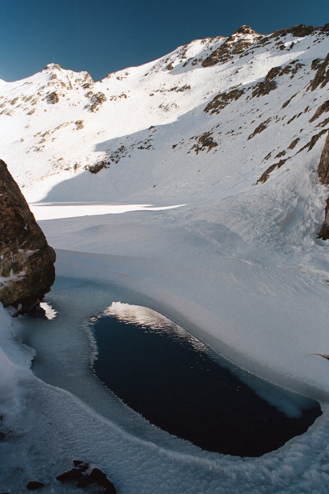 Pod przełęczą był wysoki i płaski balkon, a potem zaczęły się schody… Bez problemu znaleźliśmy zejście z uskoku stromym, ale niegroźnym żlebem po prawej stronie. Wyszliśmy na wysoki trawers pięknego zamarzniętego jeziora. Ścieżka chwilami wylazła już spod śniegu i drogę znaczyły podejrzanie gęsto ustawione kopczyki.