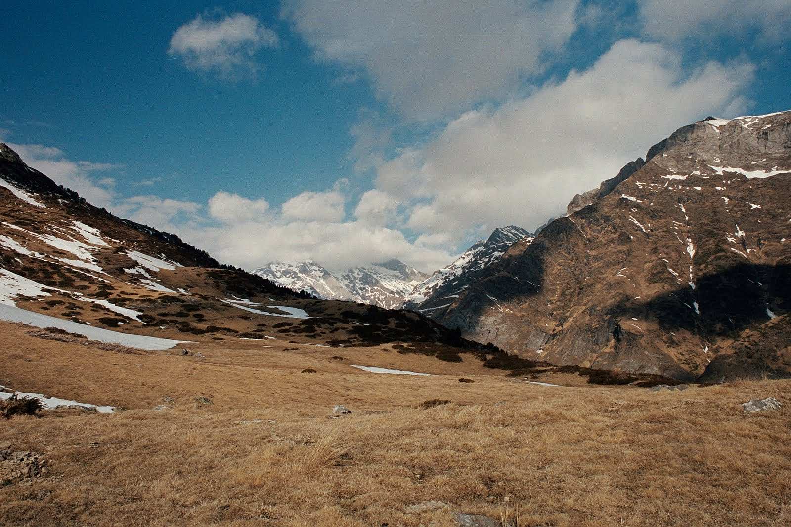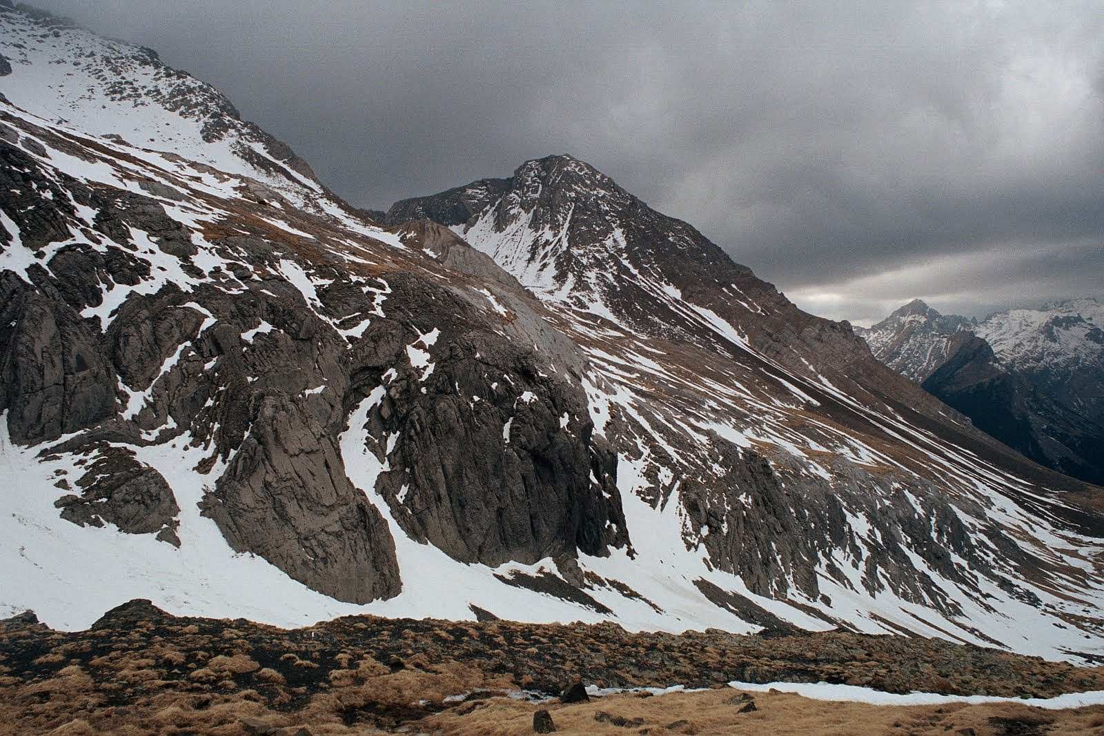 Puerto Bujaruelo wyglądał tak jak zapamiętałam z lata. Śnieg w żlebie, a poza tym dużo traw. W śniegu pełno mocno wydeptanych śladów, to popularny szlak. Nie potrzebowaliśmy już ani rakiet ani raków.