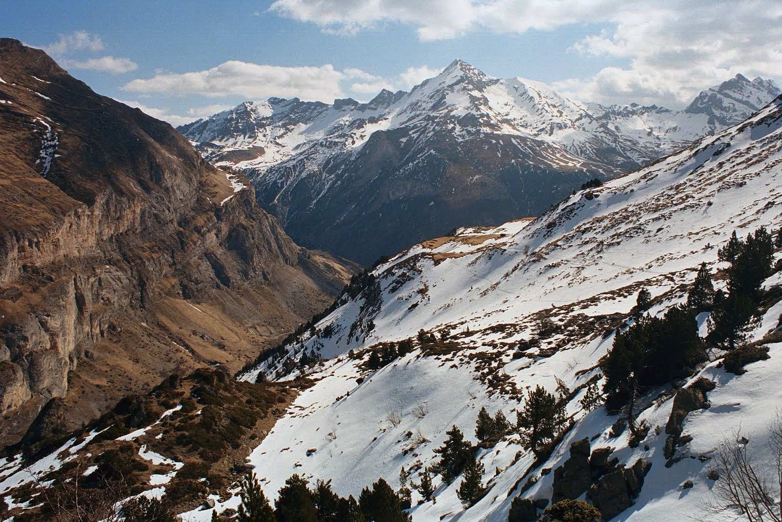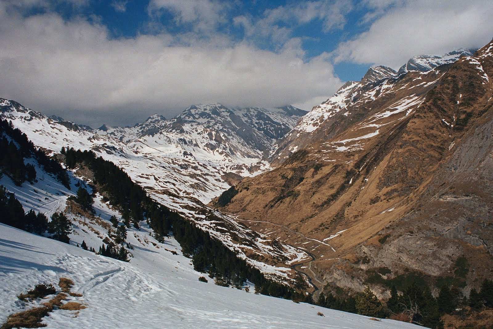 Ścieżki, na której zniknęli Francuzi nie było na mapach, ale był śnieg więc zostawili nam ślad. Podchodziliśmy szybko, daleko w dole pojawiła się stacja narciarska i zarys drogi na Col de Tentes, teraz użytkowanej jako nartostrada. Mieliśmy nadzieję, że uda nam się przejść tamtędy na Puerto Bujaruelo. Byliśmy już wysoko i szkoda by było schodzić. Nie sądziliśmy żeby Francuzi zaplanowali powrót tą samą trasą w najgorszym razie spodziewaliśmy się więc zejścia gdzieś przy wyciągach. Zachmurzyło się i zaczęło jeszcze mocniej wiać. Dość szybko dogoniliśmy Francuzów. Nie mówili po angielsku ale pokazali, że ścieżka prowadzi na Puerto Bujaruelo… przynajmniej tak nam się wydawało. Przeszliśmy jeszcze kawałek, za żebro grani. Na południowym zboczu śnieg zanikł. Słabo widoczna błotnista dróżka trawersowała stok, a potem przechodziła przez skalny grzebień. Na wezbranym wodospadzie był wątły śniegowy most. Wszystko to z przepięknym widokiem, spaskudzonym przez wyciągi.