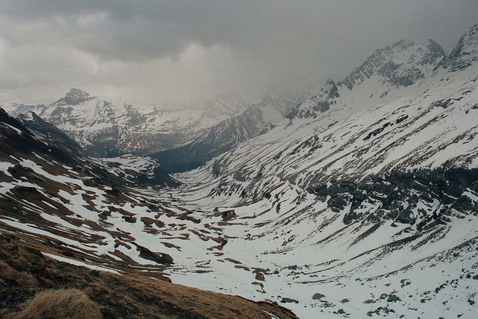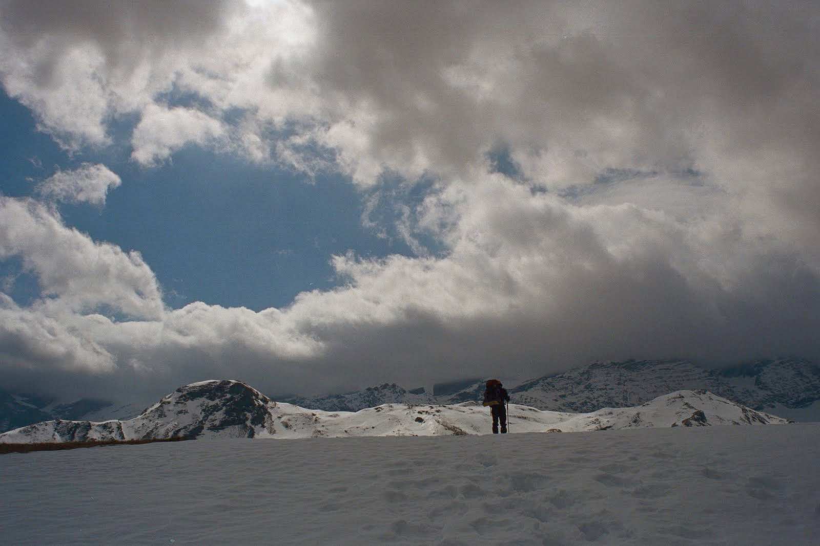 Uwierzyć w śnieg było trudno. Świeciło słonce, a po niebie snuły się tylko niewinne białe obłoczki. Mieliśmy nadzieje, że uda nam się uciec do Hiszpanii jeszcze przy pięknej pogodzie. Wyszliśmy GR10, w kierunku Barrage d’ Ossoue, z zamiarem przejścia do Doliny Ara przez Puerto del Plana del Alba. Wprawdzie zejście było zaznaczone tylko na jednej z naszych licznych map (a wejście wyłącznie jako zimowe) , ale logistycznie bardzo nam pasowało. Moglibyśmy przenocować w cabanie Labaza i wrócić do Banos de Panticosa przez Cuello Brazato.