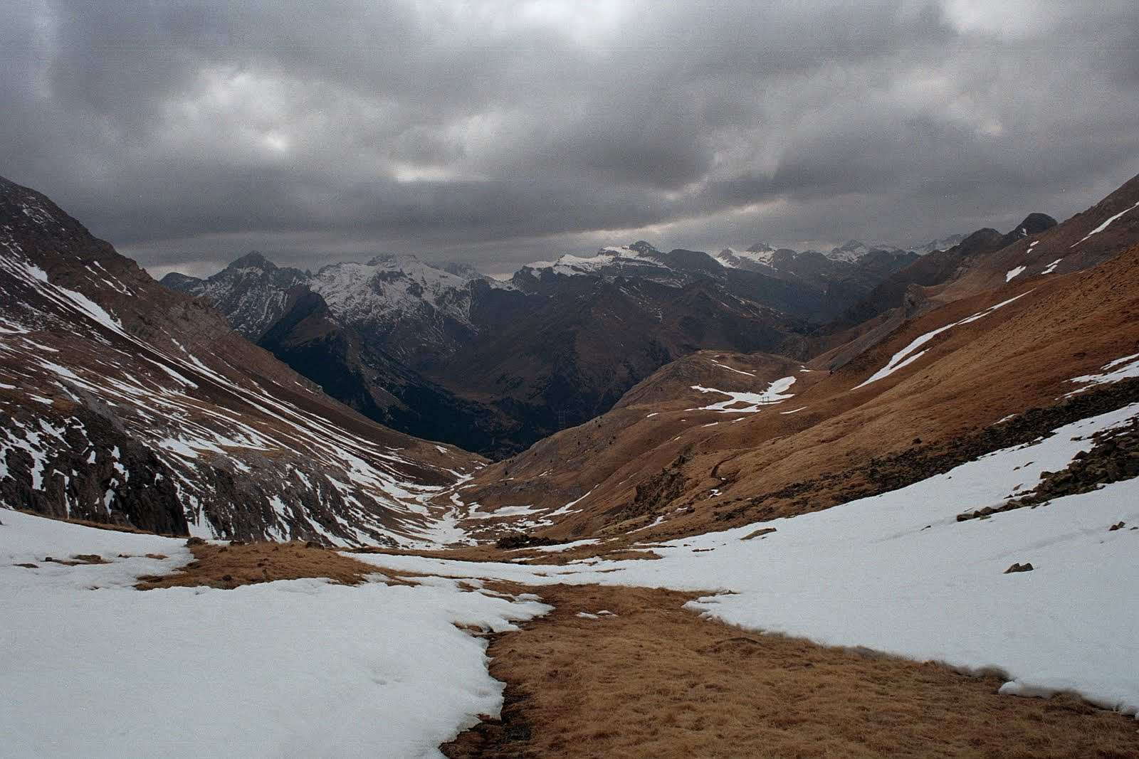 Za kolejnym zakrętem zobaczyliśmy cały szlak. Trawers w większej części był jeszcze pod śniegiem. Biały był też zarówno Port Alba jaki i Port de Bernatuero- nasze awaryjne przejście do Hiszpanii. Trawers z ciągłym zdejmowanie raków nie poszedł by szybko. Śnieg miękł i pewnie za chwilę, na fragmentach potrzebne byłyby też rakiety, ścieżka szła przez przysypane rododendrony… W schronisku ocenili tę trasę na jakieś 10 godzin. Gdybyśmy nie zdążyli- wypadłby nam kolejny biwak pod gołym niebem, tym razem przy bardzo złej pogodzie. Nad granią gromadziły się śniegowe chmury i co gorsze w Hiszpanii musiało być jeszcze gorzej.