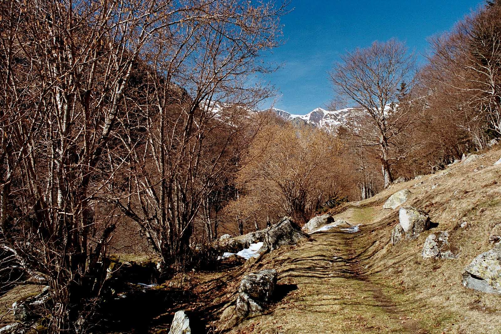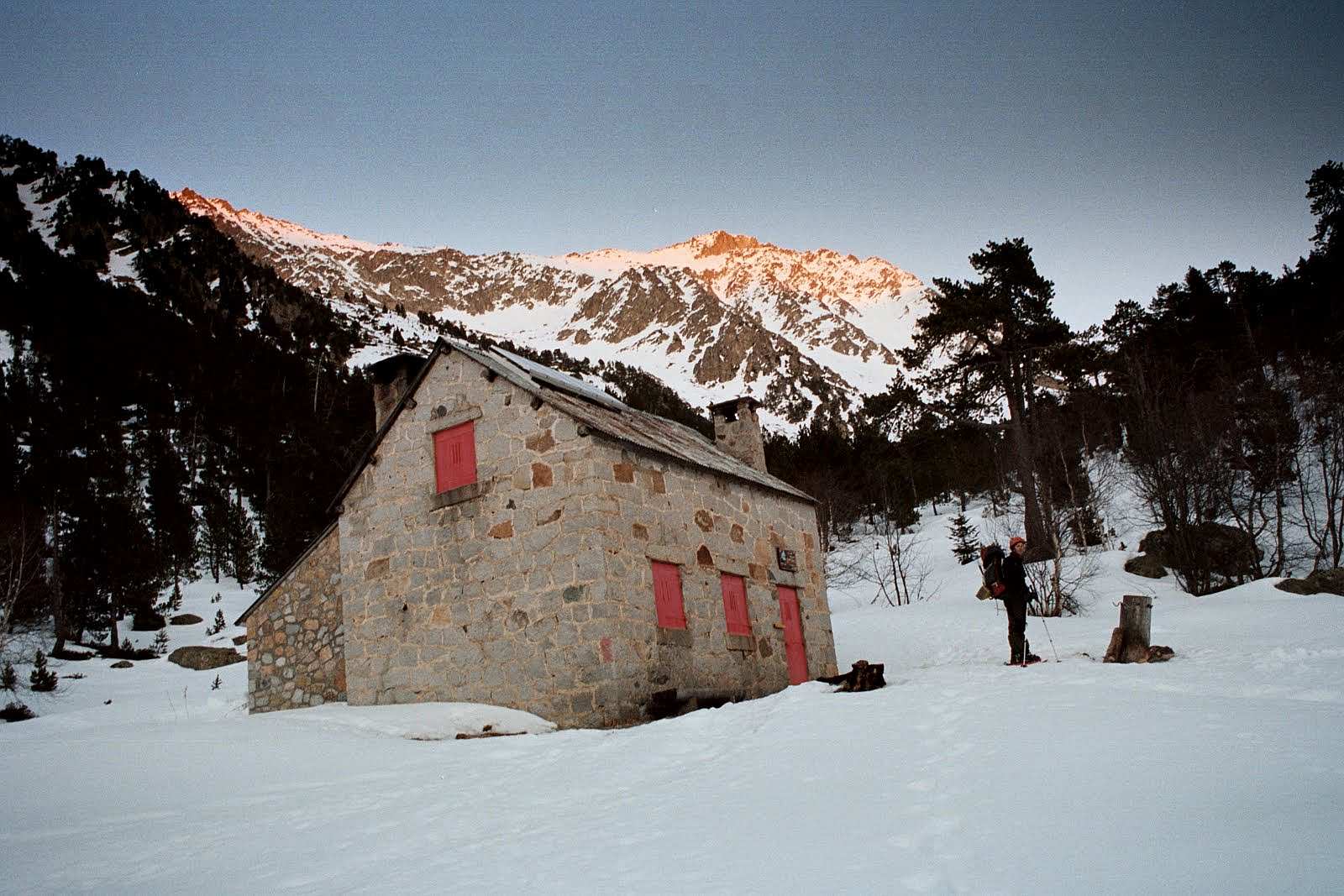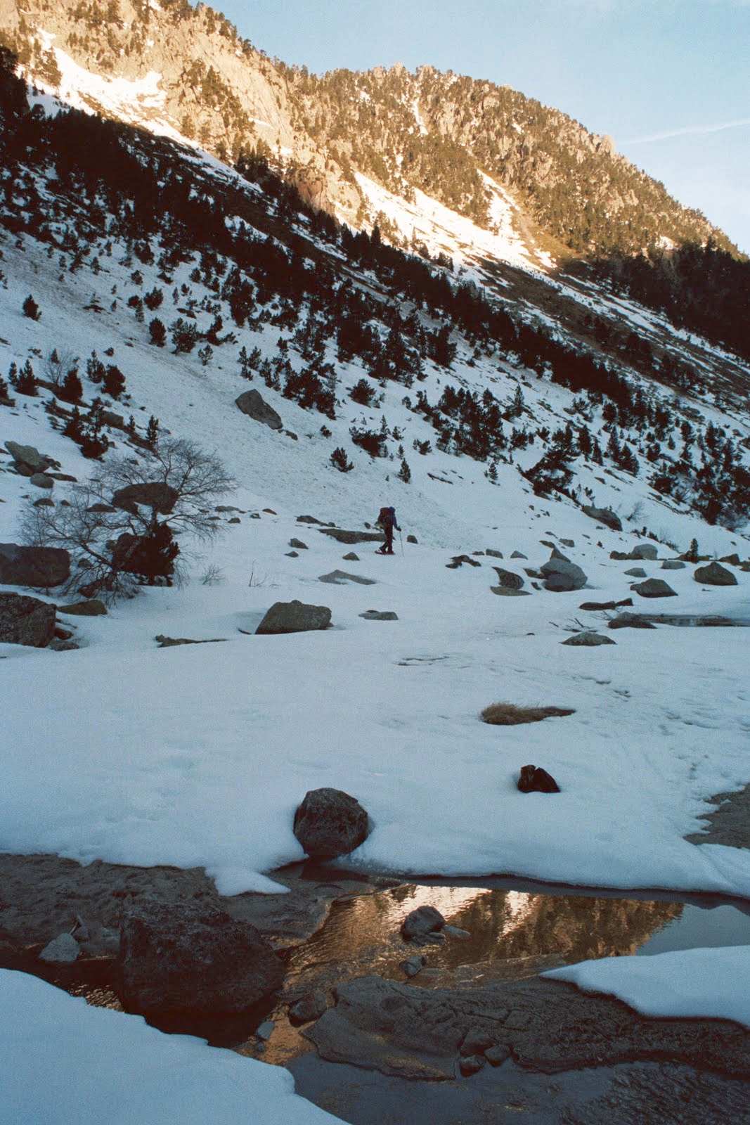 Sam Pont Espagne, wysoko zawieszony, łukowaty kamienny most, zdecydowanie ginie w porównaniu z sąsiadującym z nim parkingiem, kolejką linową i restauracją o łudzącej nazwie schronisko, gdzie nikt nawet nie wiedział jak wejść na GR10. Ścieżka wciąż była pod śniegiem, w tym miejscu przybrudzonym i zdeptanym rakietami. Na parking podjeżdżały pierwsze samochody. Zaczął działać wyciąg …. i uciekliśmy stamtąd jak najszybciej. W Chalet du Cloth nie było nic do jedzenia. Ciekawi byliśmy jak będzie na drugim końcu Val Jeret.