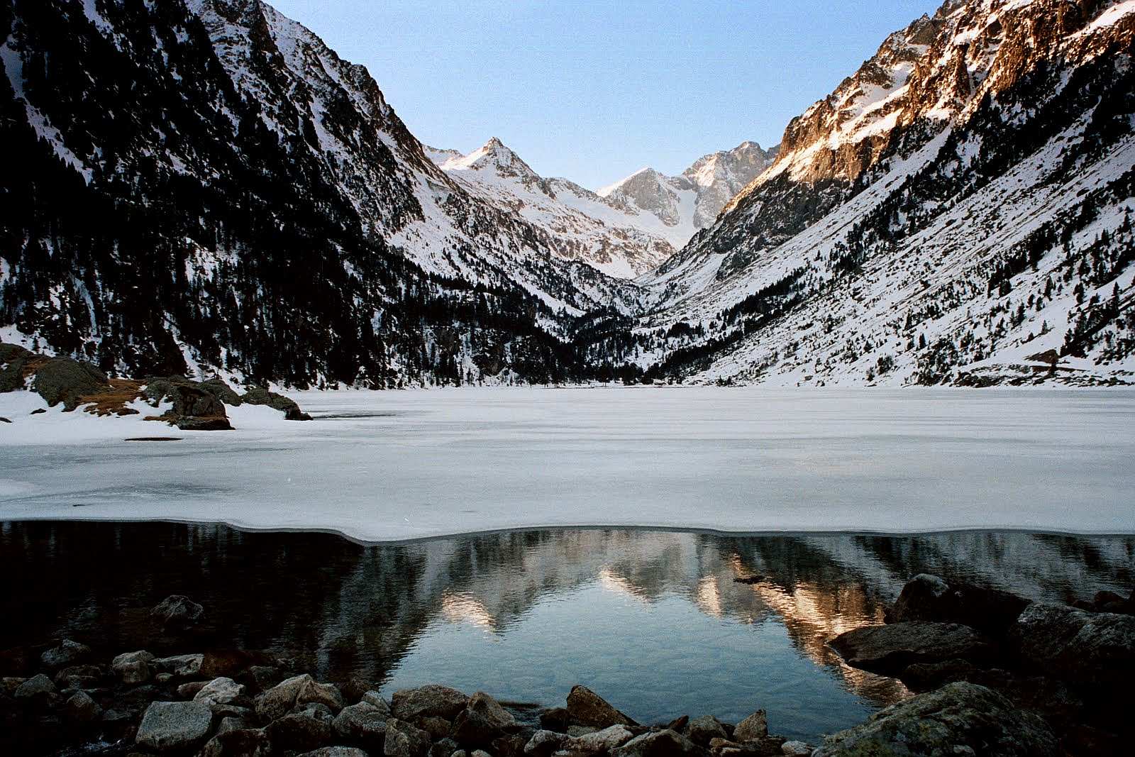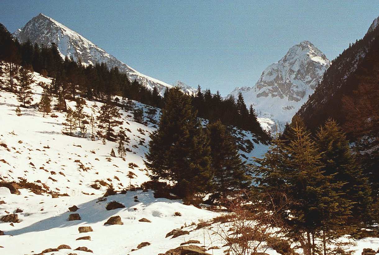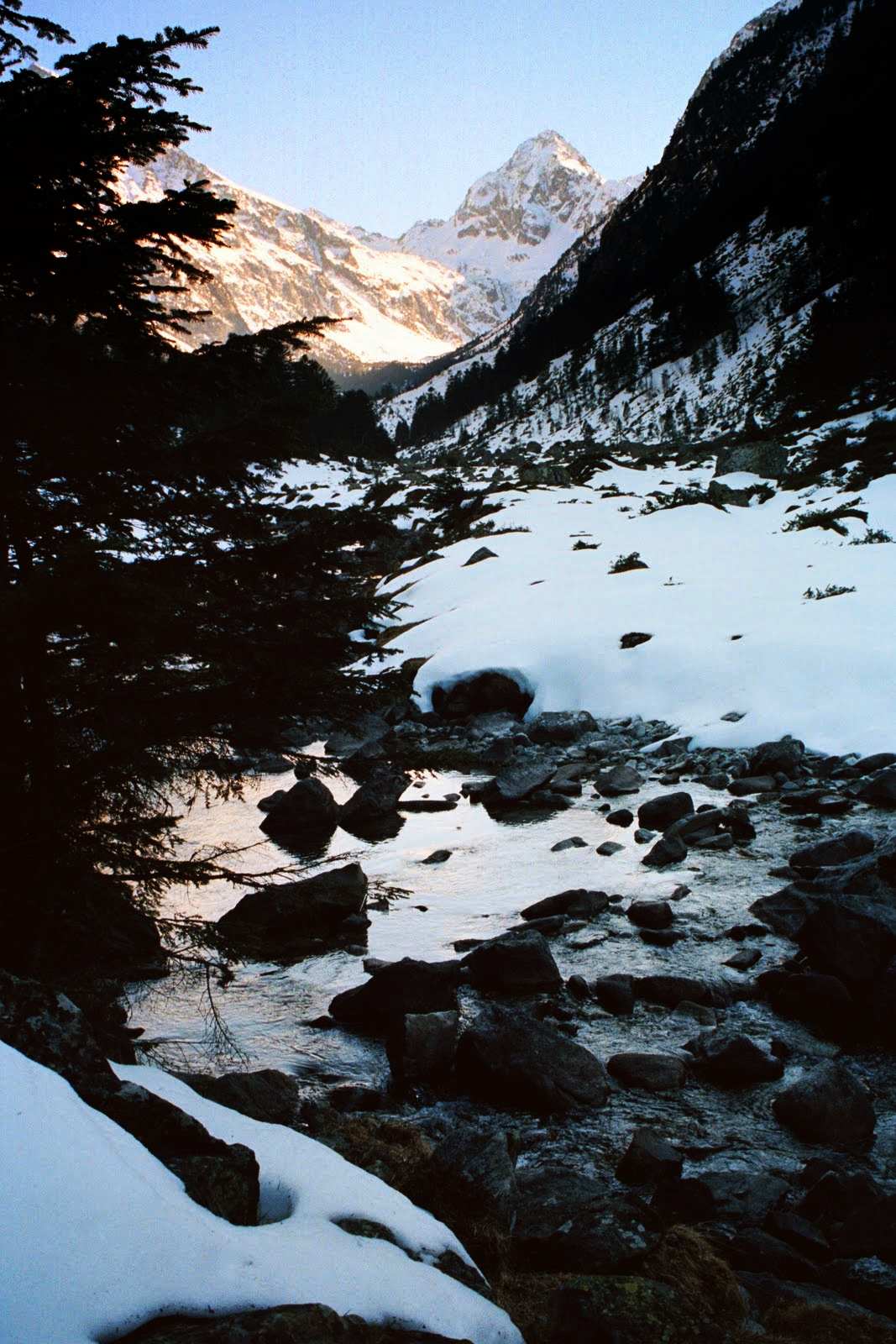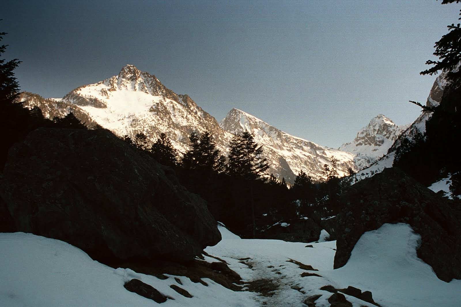 To ostatnie zdjęcie ze schroniska Russel na wierzchołki Vignemale…., wydaje mi się, że z tego miejsca nie widać przełęczy Col Arraille. Ten szczyt po lewej to jest pewnie Pic de la Sede, grań schodzi do małego siodełka, dalej jest „garb” i moim zdaniem ten „garb” schodzi do Col Arraile. Przełęcz zasłania grań po środku zdjęcia, która schodzi w kierunku stawu Estom. Tak bym obstawiał ;). Ale w zimie to całkiem inaczej wygląda niż latem.