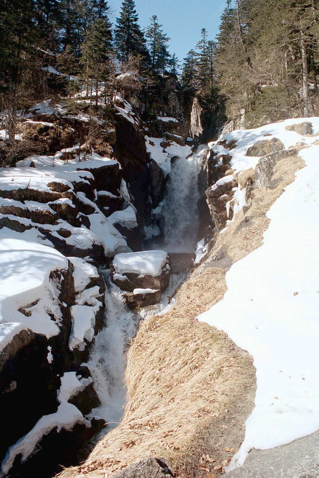 Śnieg skończył się dopiero na końcu doliny. Malownicza rzeka rozszerzyła się w paśmie pięknych wodospadów… które jednak niespodziewanie zaczęły intensywnie cuchnąć jajkami. Dopiero na dole przeczytaliśmy wyjaśnienie. Odór powodowały naturalne siarkowe źródła. Nad wodospadami stał budynek Centrum Reumatologii, a po drugiej stronie rzeki, sklepy z pamiątkami i bar. Kupiliśmy wszystkie możliwe jadalne pamiątki (z wyjątkiem pasztetu z gęsich wątróbek, pomijając cenę, nie mieliśmy otwieracza do puszek), zjedliśmy coś w barze, ja nawet zdążyłam umyć włosy i obładowani zapasem sera i domowej roboty landrynek ruszyliśmy do góry Doliną Lutour.
