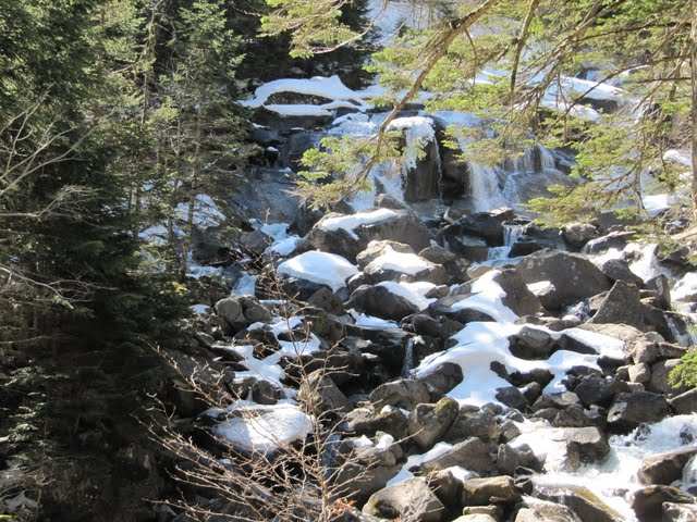 Droga prowadząca drugą stroną potoku była zasypana i widzieliśmy na niej grupki spacerowiczów w rakietach. Minęła nas też spora grupa Francuzów z plecakami. Szli z góry i byłam bardzo ciekawa którędy przeszli. Dolinę zalewało słoneczne ciepło. Ziemia rozmiękła, po stokach spływały setki strumyczków. Rozebrałam się aż do samej wełny :)