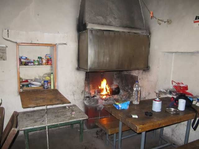 Chwilę później zrobiło się ciemno. Nie znaleźliśmy wody. Być może strumień zasypało. Wrzuciliśmy do skrzynki po 3 Euro (tyle kosztuje nocleg) i rozpaliliśmy ogień. W wielkim garze bardzo szybko topił się śnieg, działały baterie słoneczne, mieliśmy światło.