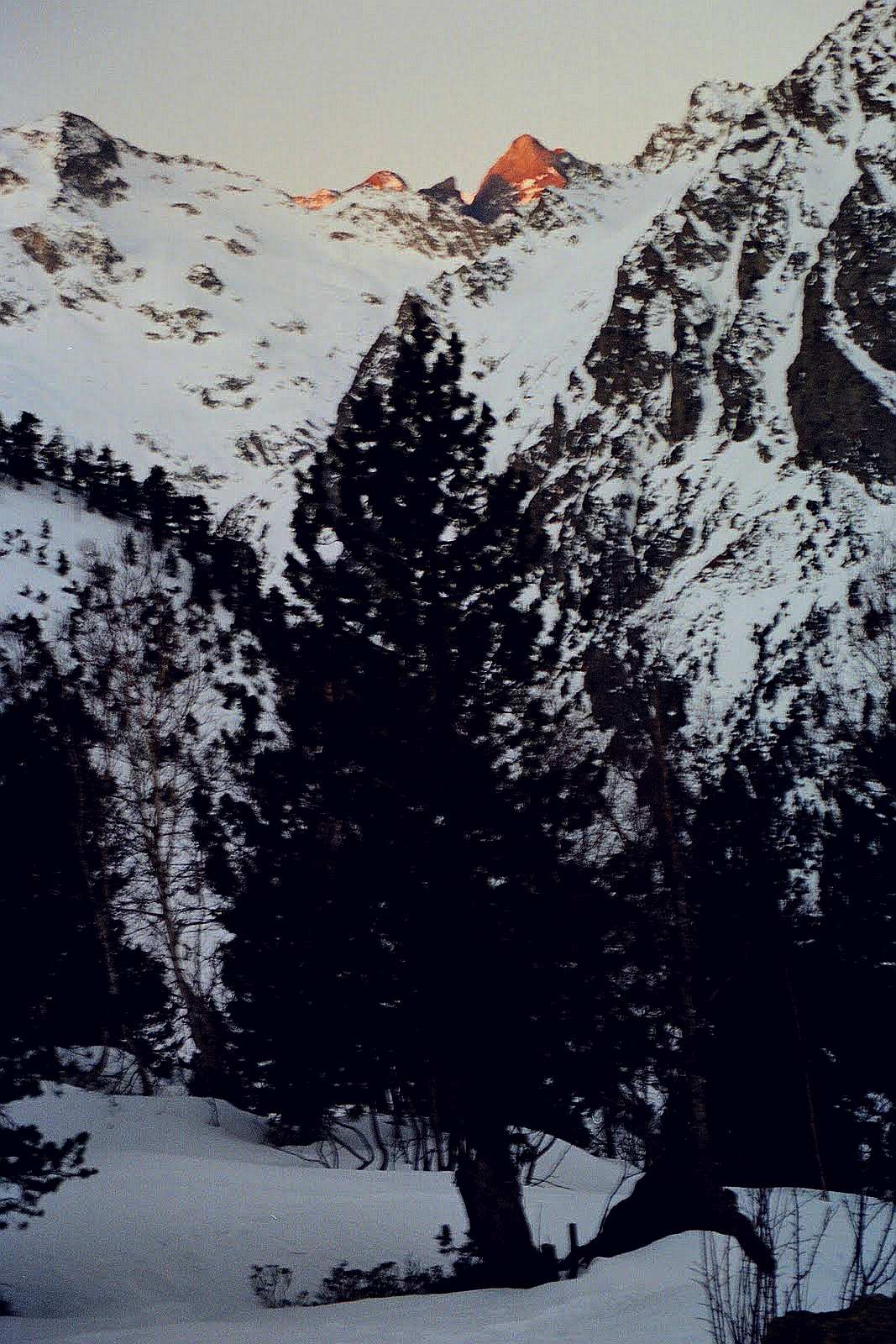 To Vignemale o świcie. Jej wierzchołek przewyższa okoliczne szczyty o kilkaset metrów i tam słońce pojawia się najwcześniej. Poniżej widać ocienioną grań- najprawdopodobniej to odradzana nam Col d’ Arraile. Nie wygląda wcale najgorzej! …Może sprawdzimy następnym razem :)