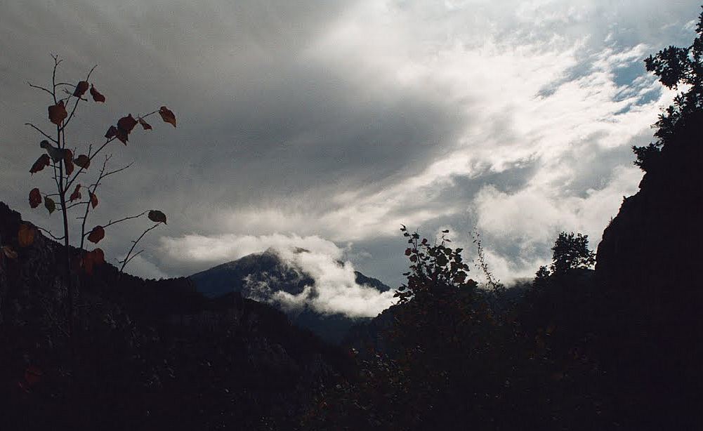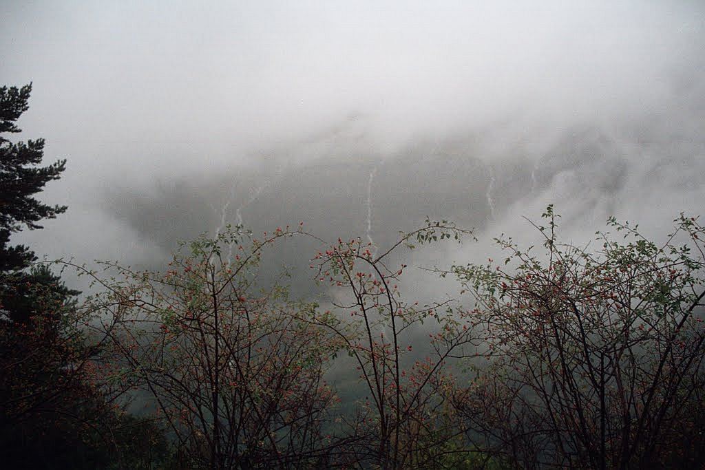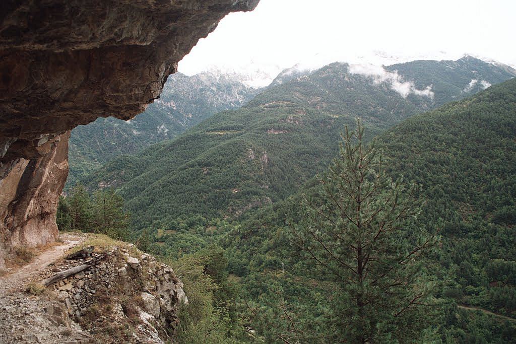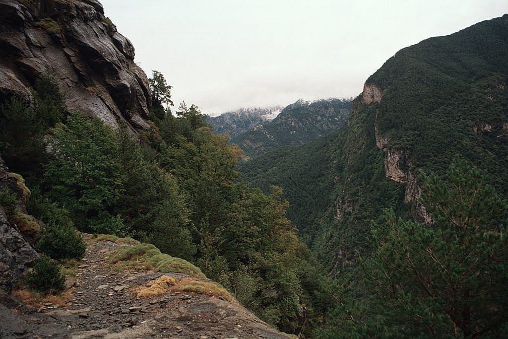 Wyszłam do góry GR19, ale już kilkadziesiąt metrów powyżej Bielsy padał mokry śnieg Nie chciałam powtarzać przejścia przez El Portillo w śniegowej ciapie. Byłam tam kiedyś latem. Pod granią jest plątanina ostrych bloków na stromym stoku, więc zamiast w górę, wybrałam okrężny trawers. Na mapie nie ma takiego szlaku(jest tylko na EP- Bielsa Val de Chistau i to tylko kawałek ), ale są drogowskazy. Nazywało się to „po kanale”. Na początku żadnego kanału nie było widać, ale zapowiadało się ciekawie. Zbocze do strawersowania jest niemal pionowe, a ścieżkę oznakowano jako rowerową.