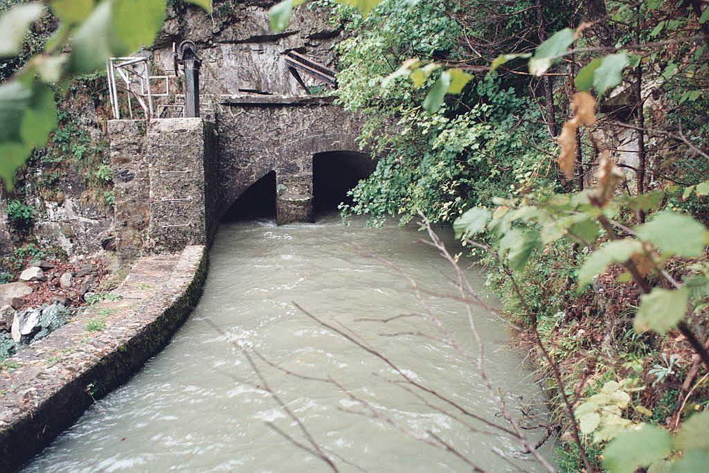 Trochę dalej ujawnia się i sam kanał- na oko chyba dość wiekowy. Jeszcze dalej pojawia się mnóstwo ciekawych wodnych urządzeń, jakichś przepustów i śluz, teraz podczas wielkiego deszczu bardzo widowiskowych – naprawdę fajne fontanny. Wszystko to co jakiś czas znika w zboczu, góra jest podziurkowana jak szwajcarski ser. Kanał na fragmentach wychodzi na zewnątrz i ścieżka prowadzi po gładkich betonowych pokrywach zasypanych gradem dużych kamieni- na rowerze to będzie ciasny slalom :)