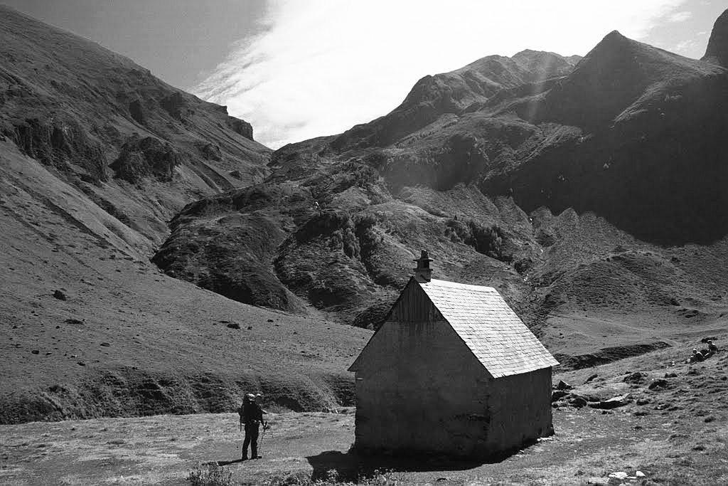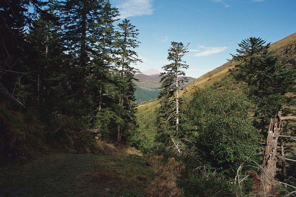 Wyszliśmy GR10 na wschód. Początkowo podchodziliśmy leśną drogą, potem zacienioną wąską ścieżynką. Z tyłu pokazały się dalekie wierzchołki Neouvielle, po jakimś czasie (ponad godzinie) minęliśmy zaporowe jeziorko i wyszliśmy na hale. Niesamowity widok. Cudowny, zwłaszcza, że pojawia się niespodziewanie. Niestety fotograficznie bardzo trudny- wszystko pod słońce. W czerni i bieli jest nie najgorzej, ale kolory wyszły mi słabo.