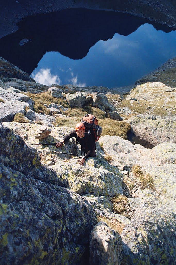 Za progiem pojawiły się płaskie łączki pełne malowniczych zakoli rzeczki, dalej kilka rozrzuconych w skalistym terenie jeziorek. Spotkaliśmy tam faceta z psem. Labrador trochę z nami pogadał (intensywnie machając ogonem). Właściciel- Katalończyk wydawał się bardzo zmęczony. Powiedział, że przyszli z Espingo i idą już od 10 godzin. Trochę nas to zdziwiło, bo do Espingo nie jest aż tak daleko, my mieliśmy zamiar dojść do cabany Arrouge przed zmrokiem. Jose nawet się zaśmiał, że skoro przeszedł to pies, to i nam na pewno się uda i poszliśmy dalej pod górę według opisów kolegów z forum, wspomagani jeszcze mapką Olliviera i jego wyceną trudności -T5 (dla pocieszenia -miałam też opis, że „wszystko na nogach”). Podejście znad Lac Nere było strome i chociaż wyglądało groźnie naprawdę okazało się proste. Musi być paskudne jeśli leży śnieg.