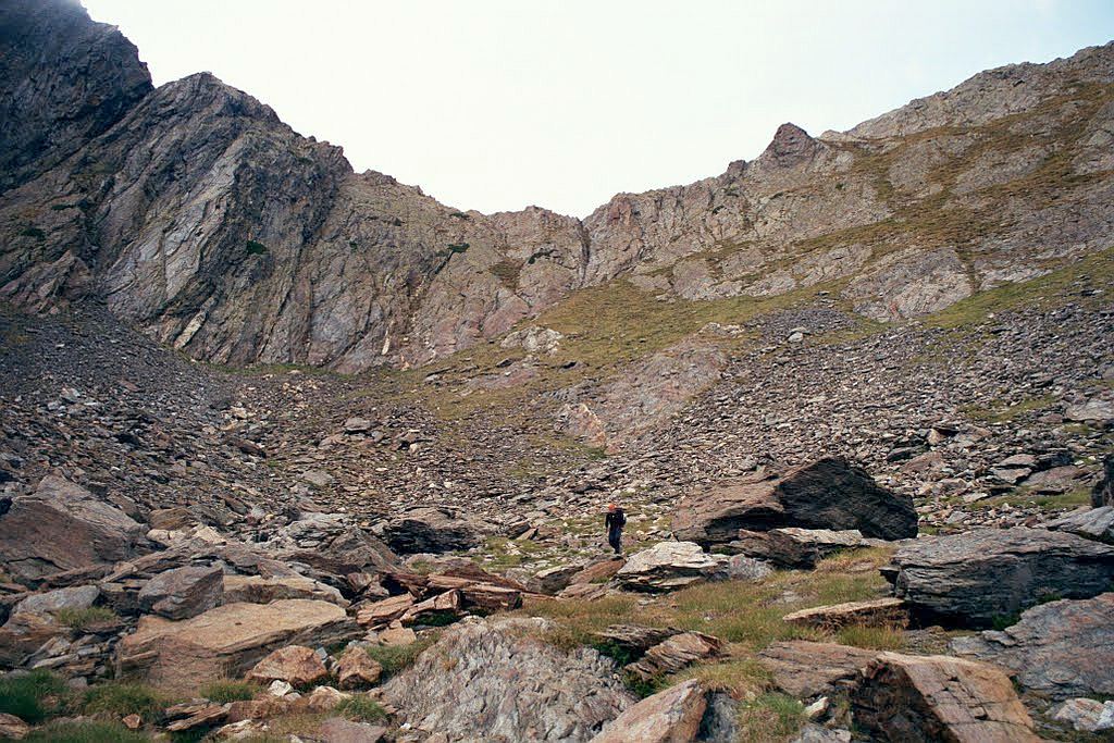 Dalej było już łatwiej, rzeczywiście bez użycia rąk, ale miejscami wyjątkowo stromo. Trawki, trochę kruchych skałek, czasem piarg. Potem łączka z rozlaną szeroko rzeczką i długi trawers prowadzący do Cabane Arrouge. Było kilka starych kopczyków.
