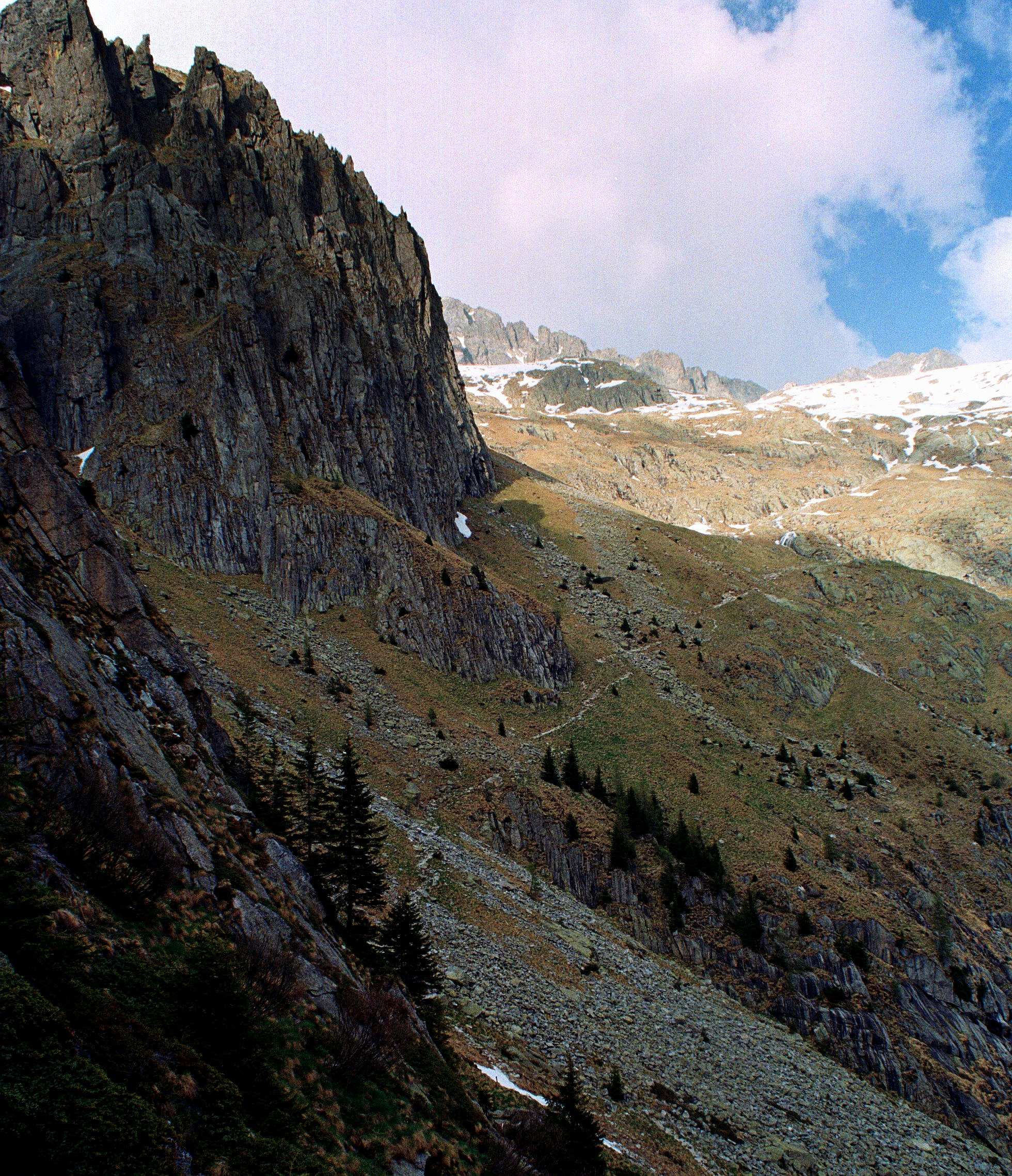 Z Cinque Croci do schroniska pod Cima d’Asta prowadzą dwie drogi. Wyższa – idąca grania via ferrata, była w maju całkowicie zasypana, i nawet nie spróbowałam jej przejść. Niższą ścieżkę co jakiś czas przecinały nieprzyjemne lodowe wały i firnowe nawisy, ale nadawała się do przejścia i nawet nie była trudna. Po wcześniejszych doświadczeniach z Lagorai, bałam się, że może być  gorzej.