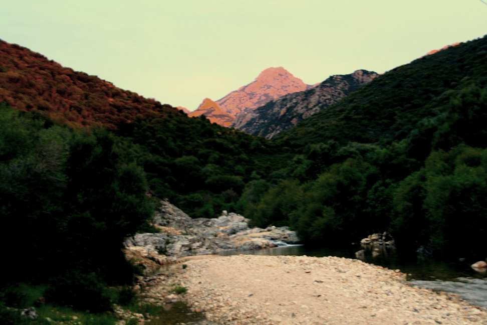 Wszytko to wypatrzyliśmy w świetle latarek.  Padliśmy od razu i Sardynię zobaczyłam w zasadzie dopiero rano. Obudziłam się pierwsza, na chwilę przed świtem.  Wyszłam z namiotu jak zwykle z aparatem, z tym że zamiast tego, który mam zwykle w górach (na film)  zabrałam cyfrowy- dużą i ciężką lustrzankę. Cały świat ginął w czerwonym świetle, niestety chyba jeszcze na wpół spałam i  zdjęcia wyszły mi bardzo nieostre.
