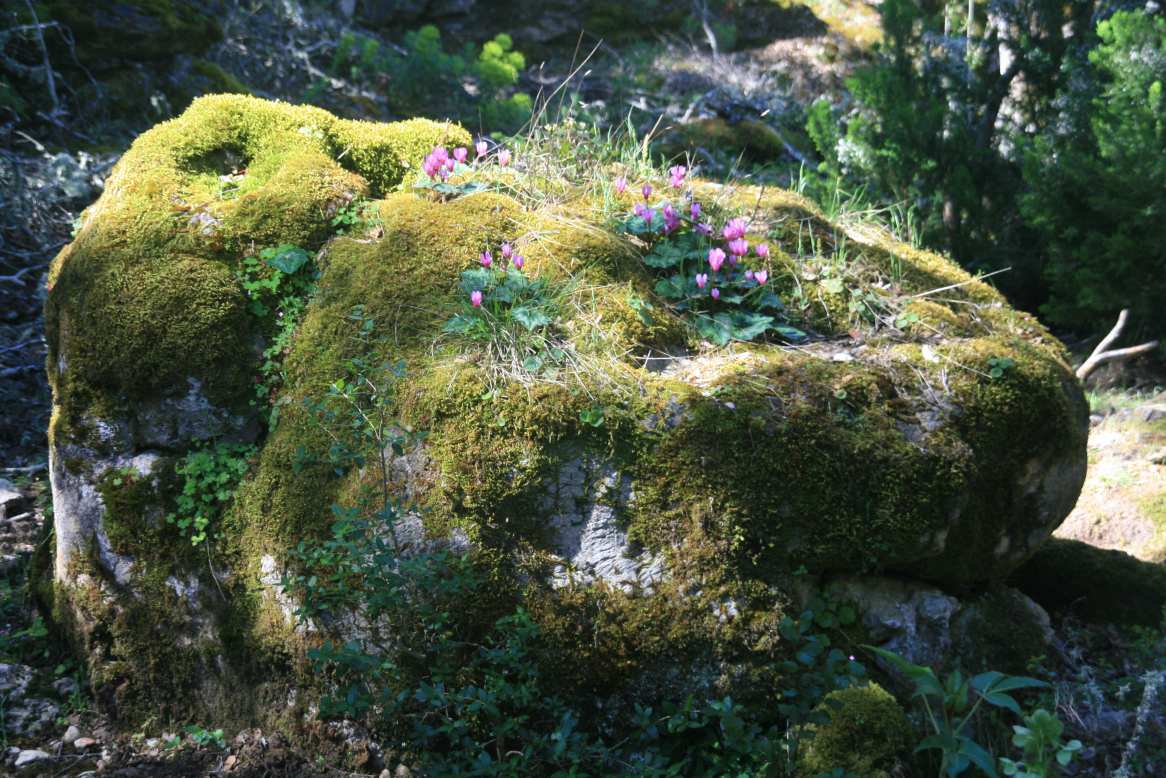 Same góry, chociaż na pierwszy rzut oka suche i jałowe, w wielu miejscach porastają cieniste lasy pełne ogromnych i na pewno bardzo starych drzew, głównie zimozielonych dębów.  Teraz w maju w poszyciu kwitły łany cyklamenów.