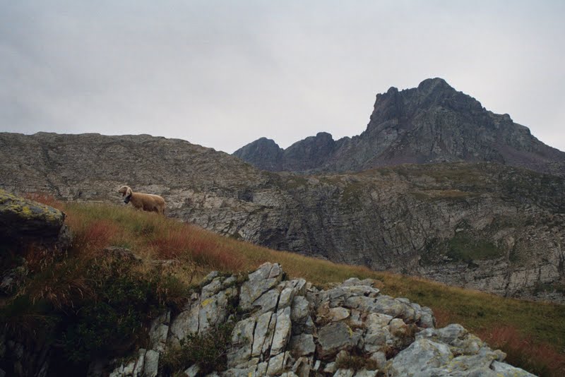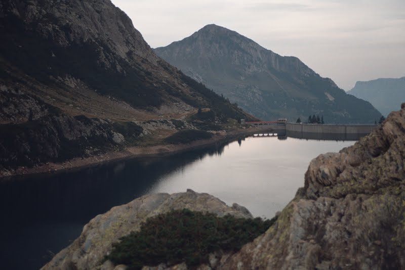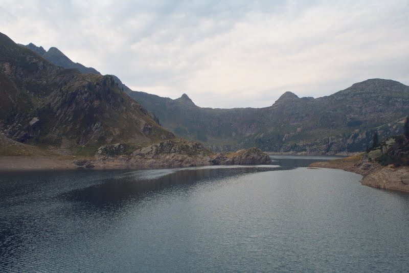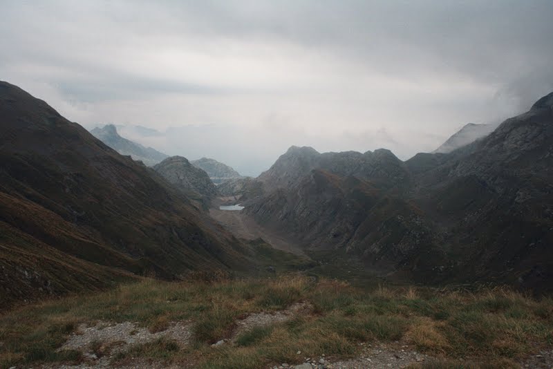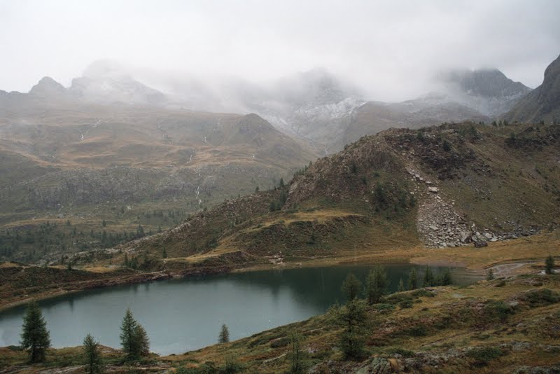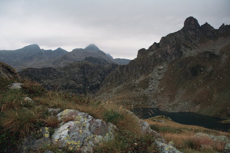 Ponieważ grupa była duża, a pogoda wyraźnie się psuła grożąc deszczem, ustalenie kompromisu wydawało się niemożliwe. Przysłuchiwałyśmy się temu przez jakiś czas, a potem na wysoko zawieszonym trawersie jeziora Colombo pozwoliłyśmy się wyprzedzić i usiadłyśmy na chwilę zostając w tyle. Poprosiłyśmy tylko żeby na przełęczy Avasco ktoś zostawił nam strzałkę gdzie poszli.