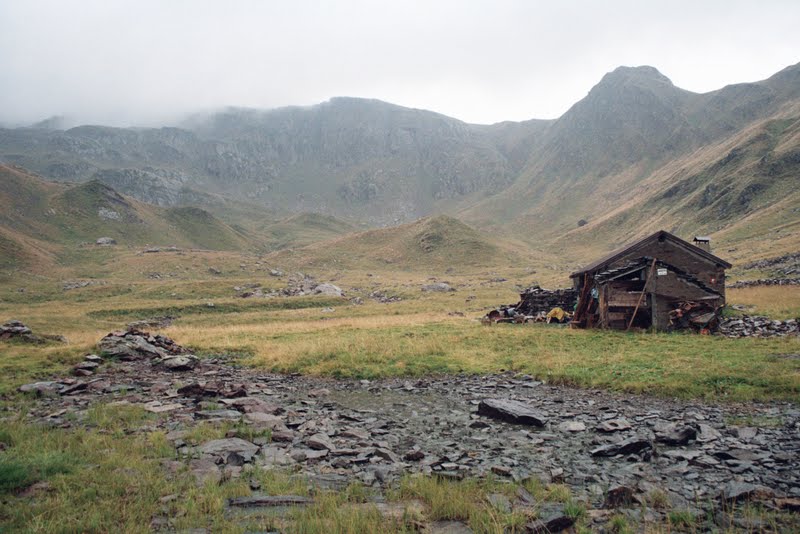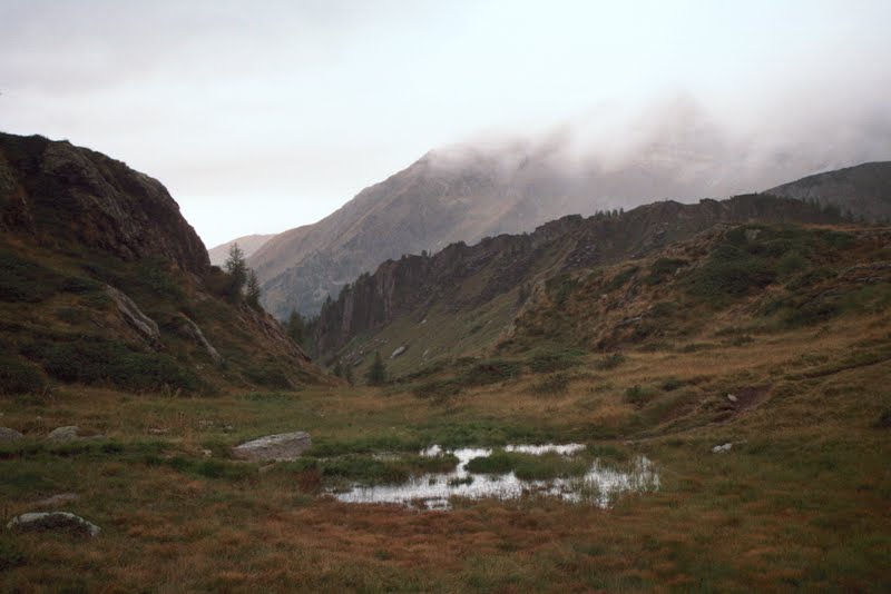 Nie poprawiało się więc założyłyśmy z powrotem mokre rzeczy i powlekłyśmy się trawiastą ścieżką w górę. Na grani dopadła nas gęsta mgła i z trudem udało nam się odszukać szlak. To niedaleko. Po przejściu kamienistej przełączki droga schodzi najpierw stromo przez skały, a potem trawersuje kamienne zwalisko i wychodzi na strome łąki. Dość trudno było się połapać jak iść, ale niżej trochę się rozwidniło i wypatrzyłyśmy zejście z zarośniętej krzakami skarpy. Łąki wokół Refugio Calvi były zalane i kicając z kępy na kępę widziałyśmy już czekający na tarasie tłum. Włosi myśleli, że się zgubiłyśmy!
