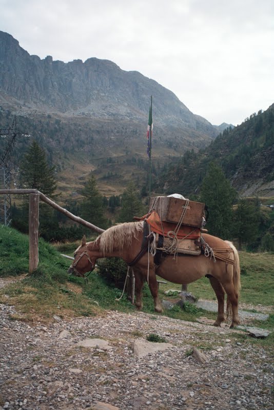 Odcinki są kilkugodzinne (niektóre można jeszcze bardziej podzielić), a noclegi i wyżywienie można sobie zarezerwować w schroniskach. Tak też zrobiła nasza włoska grupa. W Clusone rozdzielono nas i nasze plecaki po różnych samochodach, podjechaliśmy do Valbondione. Trasa według przewodnika powinna zająć ok. 3 godzin, ale do podejścia było ponad 1000 metrów, więc nie czekając aż Włosi się pozbierają wyszłyśmy z Lidką troszkę przed grupą. Wiedziałyśmy, że z cięższymi plecakami będziemy najprawdopodobniej szły wolniej (zresztą z natury jesteśmy powolne- nie śpieszymy się jeśli nie ma takiej potrzeby). Po drodze zatrzymałyśmy się na pół godziny i w pięknej plamie słońca wysuszyłyśmy zalany rosą namiot. W Alpe Corte udało mi się zdobyć mapę (dostałam jakąś reklamową bo na sprzedaż nie było nic), a przy okazji wyminęli nas Włosi.