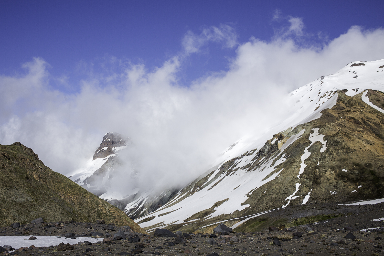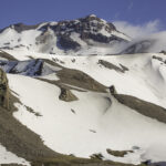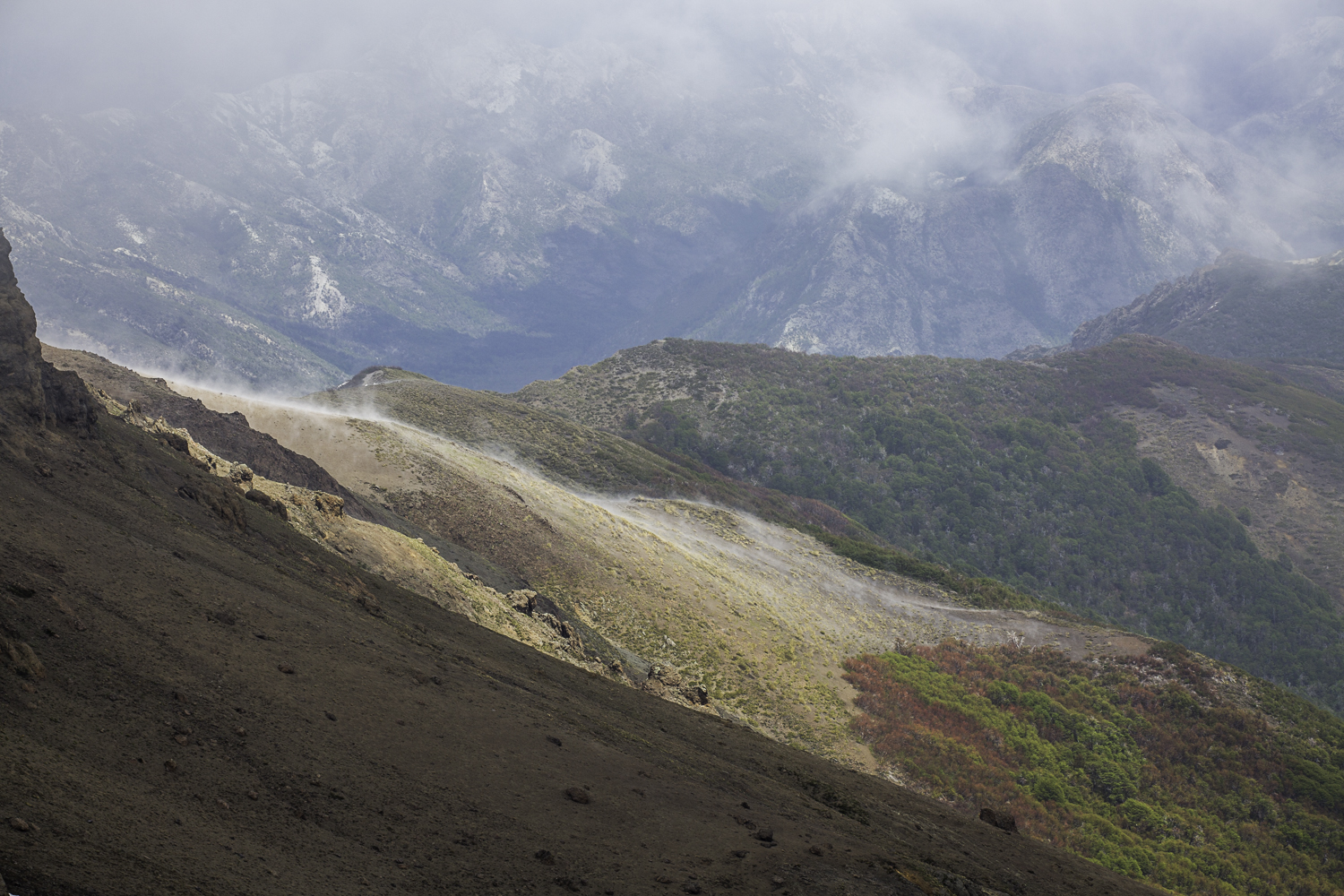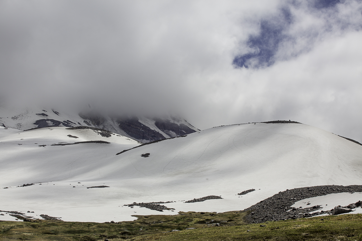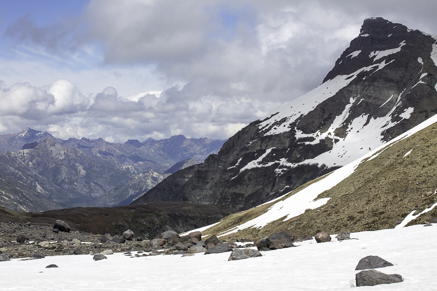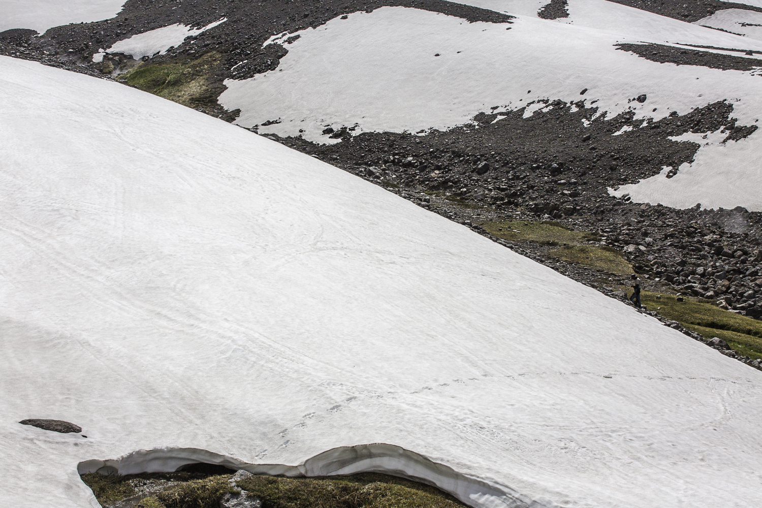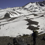 Niebo znów jest bezchmurne, niebieskie, na Antuco bieli się warstwa świeżego śniegu lub gradu? Podchodzimy długim lawowym polem. Nie ma już znaków, nie widać śladów deptania, co jakiś czas znajduję kopczyk. To surowe skały, sporo uskoków i obejść. Wyżej trafiamy na błoto i śnieg, tuż przed przełęczą robi się stromo. Drugą stronę grani nakrywa śnieg gruby nawet na kilka metrów. Pod nami naderwane nawisy, nadciąga chmura. Stąd na pewno nie da się zejść. Podchodzimy w stronę wulkanu, grzbietem nawisów, aż do jednego z wytopionych jęzorów opadających aż na dno doliny. Trzeba do niego bardzo stromo zejść, ale śnieg jest tu wystarczająco nośny i szybko stajemy na piarżysku. Nie jest łatwiej. Kamyki są mokre, podłoże rozmiękłe i śliskie. Zsuwamy się na wielką płaską połać śniegu, we mgłę. Kiedy mijamy miejsce gdzie z przełęczy opada nasz szlak, chmura rozrzedza się i widać potężne nawisy i kilka świeżych śladów lawinek. Odchodzimy dalej od zbocza i trochę się gubimy przed zejściem. Szlak opada nad rzekę, to kilkaset metrów stromizny, nie wiemy gdzie i gdyby nie kopczyk na wytopionej już piaszczystej górce być może byśmy się nie dowiedzieli. Dobrze iść ścieżką, choć czasem się rozpływa w skałach i gubi. Jest stromo, bywa grząsko. Oddychamy z ulgą na dole. Teraz tylko kilometry wzdłuż rzeki. Dolinę porastają regularne kępy traw. Granicy z Argentyną strzeże mur kolorowych gór. Za nami kłębi się ogromna chmura, wystaje z niej tylko szczyt Sierra Velluda.