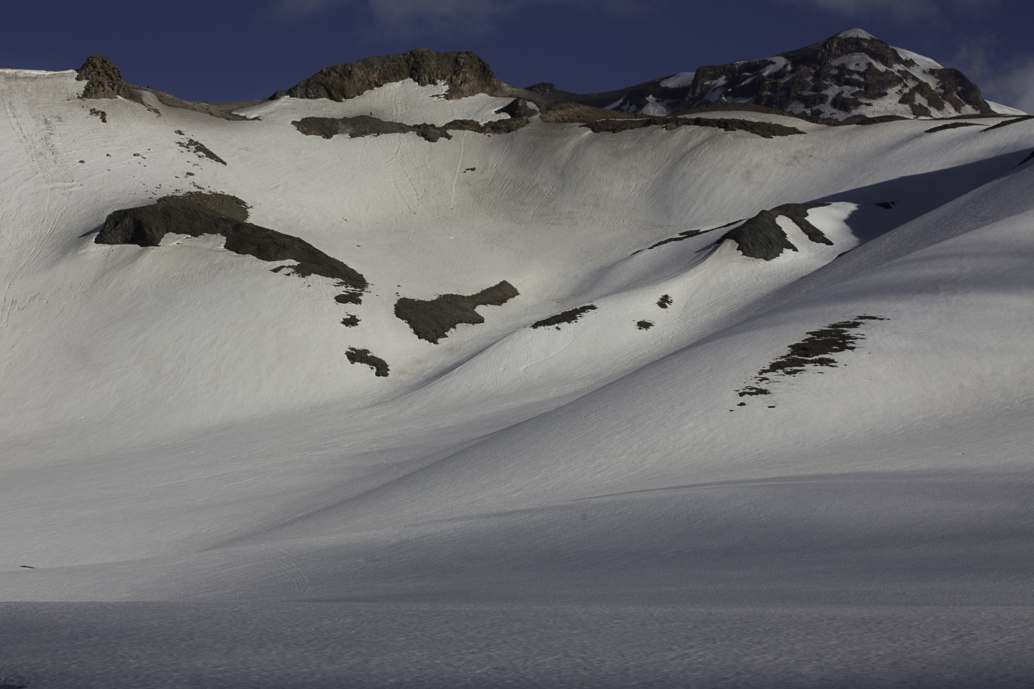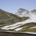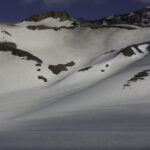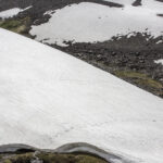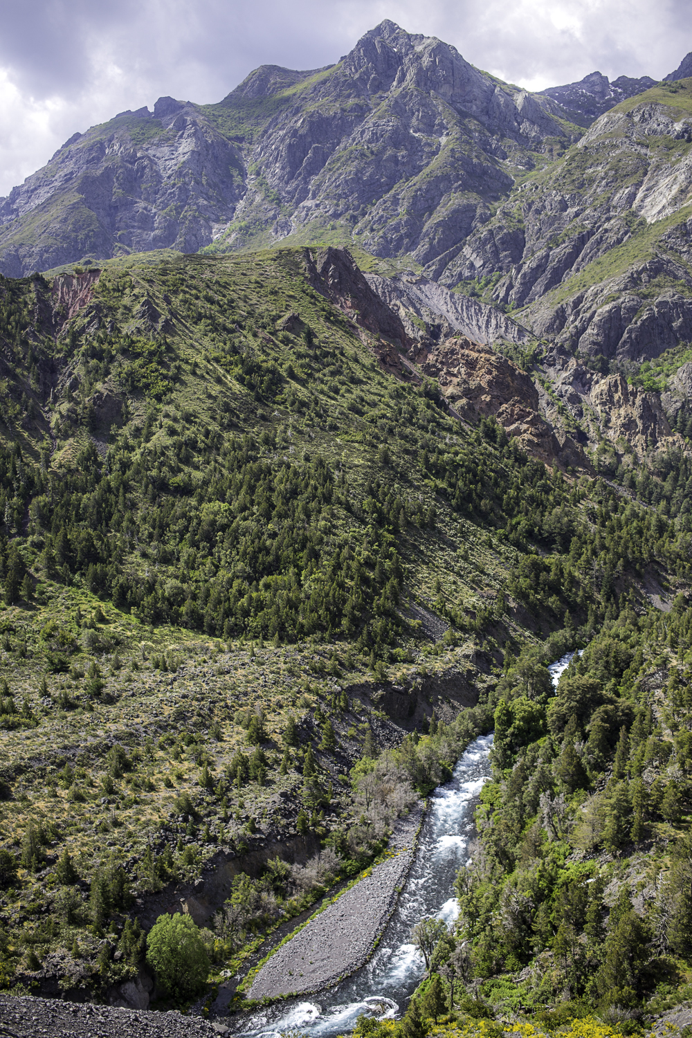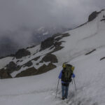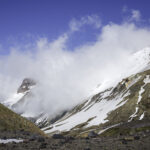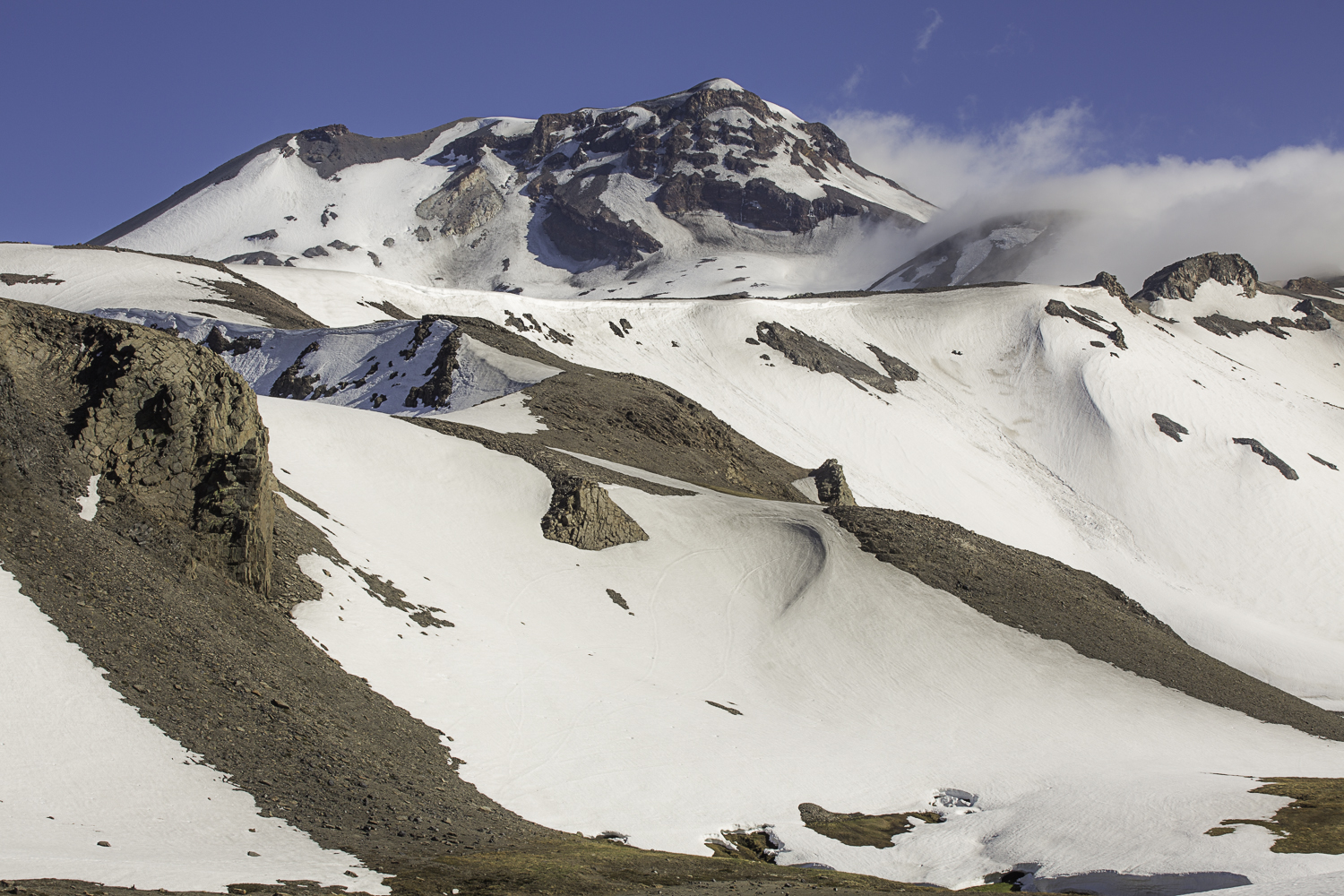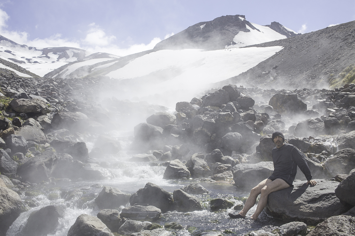 Niebo znów jest bezchmurne, niebieskie, na Antuco bieli się warstwa świeżego śniegu lub gradu? Podchodzimy długim lawowym polem. Nie ma już znaków, nie widać śladów deptania, co jakiś czas znajduję kopczyk. To surowe skały, sporo uskoków i obejść. Wyżej trafiamy na błoto i śnieg, tuż przed przełęczą robi się stromo. Drugą stronę grani nakrywa śnieg gruby nawet na kilka metrów. Pod nami naderwane nawisy, nadciąga chmura. Stąd na pewno nie da się zejść. Podchodzimy w stronę wulkanu, grzbietem nawisów, aż do jednego z wytopionych jęzorów opadających aż na dno doliny. Trzeba do niego bardzo stromo zejść, ale śnieg jest tu wystarczająco nośny i szybko stajemy na piarżysku. Nie jest łatwiej. Kamyki są mokre, podłoże rozmiękłe i śliskie. Zsuwamy się na wielką płaską połać śniegu, we mgłę. Kiedy mijamy miejsce gdzie z przełęczy opada nasz szlak, chmura rozrzedza się i widać potężne nawisy i kilka świeżych śladów lawinek. Odchodzimy dalej od zbocza i trochę się gubimy przed zejściem. Szlak opada nad rzekę, to kilkaset metrów stromizny, nie wiemy gdzie i gdyby nie kopczyk na wytopionej już piaszczystej górce być może byśmy się nie dowiedzieli. Dobrze iść ścieżką, choć czasem się rozpływa w skałach i gubi. Jest stromo, bywa grząsko. Oddychamy z ulgą na dole. Teraz tylko kilometry wzdłuż rzeki. Dolinę porastają regularne kępy traw. Granicy z Argentyną strzeże mur kolorowych gór. Za nami kłębi się ogromna chmura, wystaje z niej tylko szczyt Sierra Velluda.
