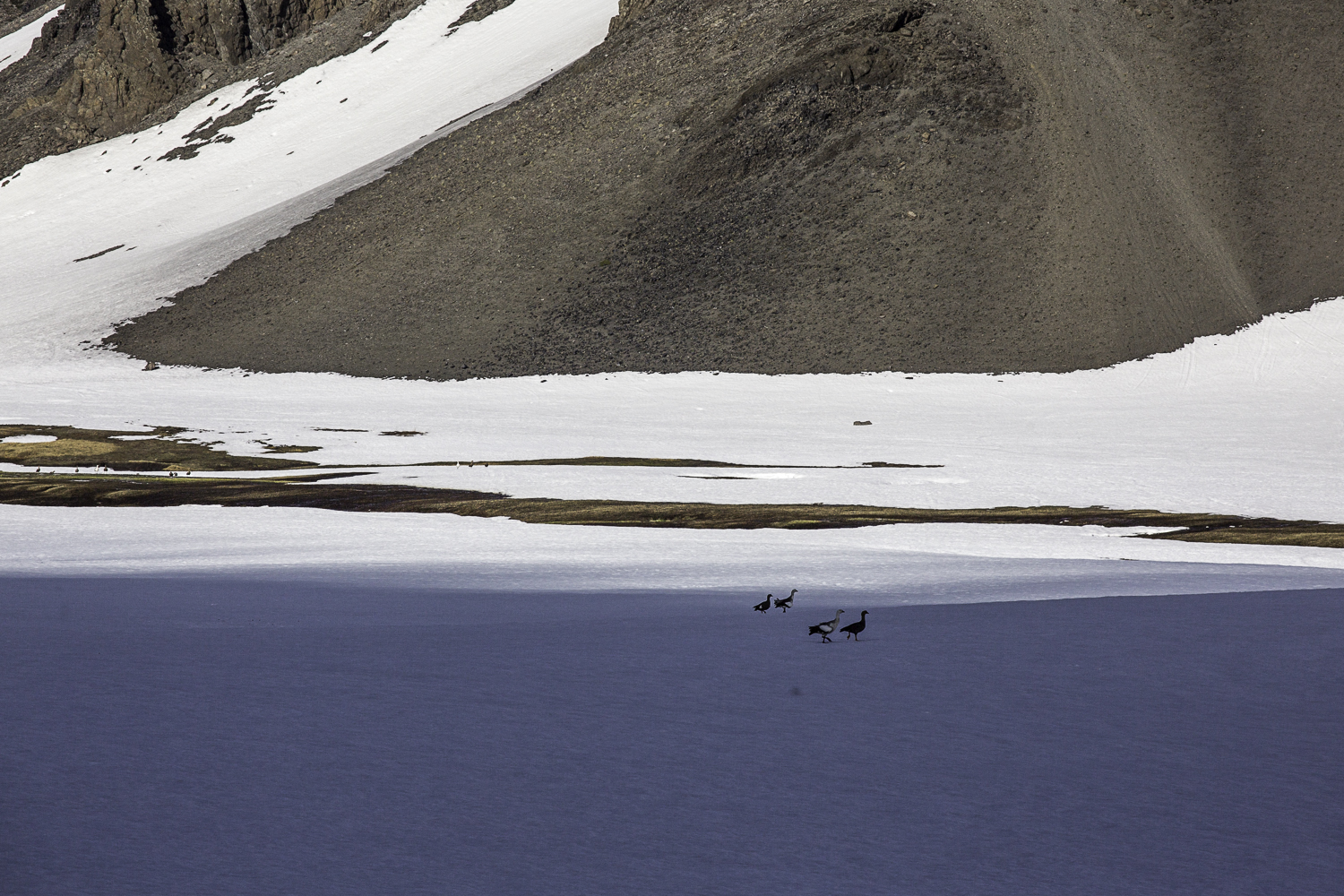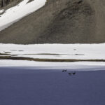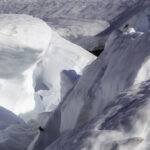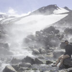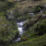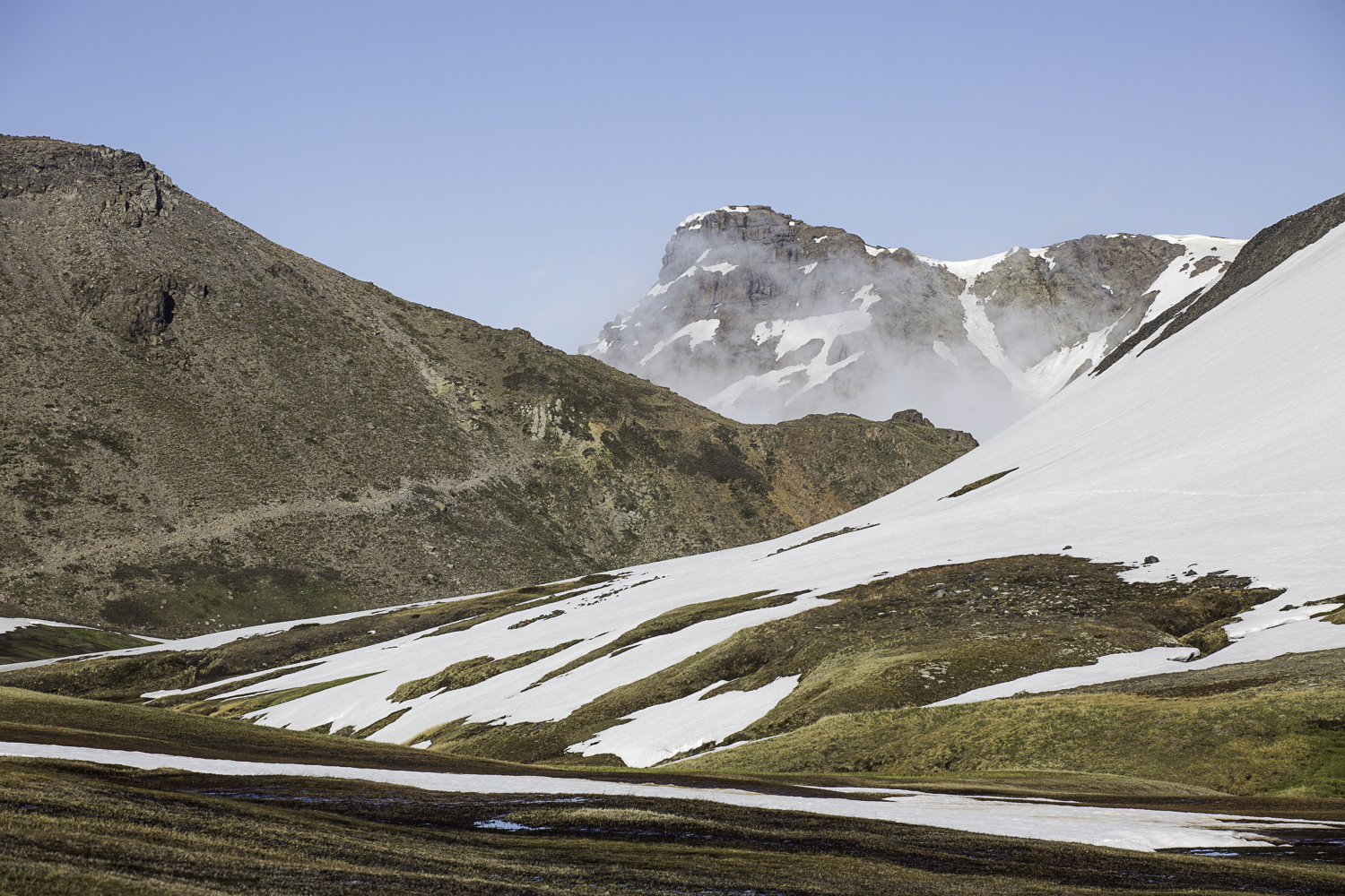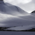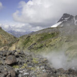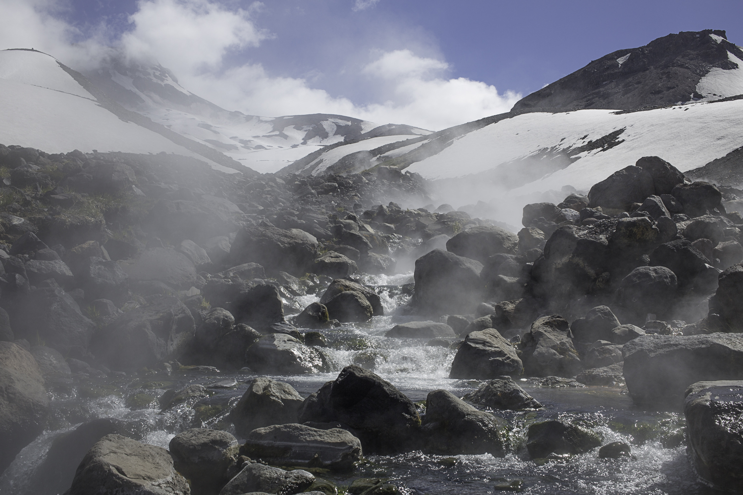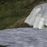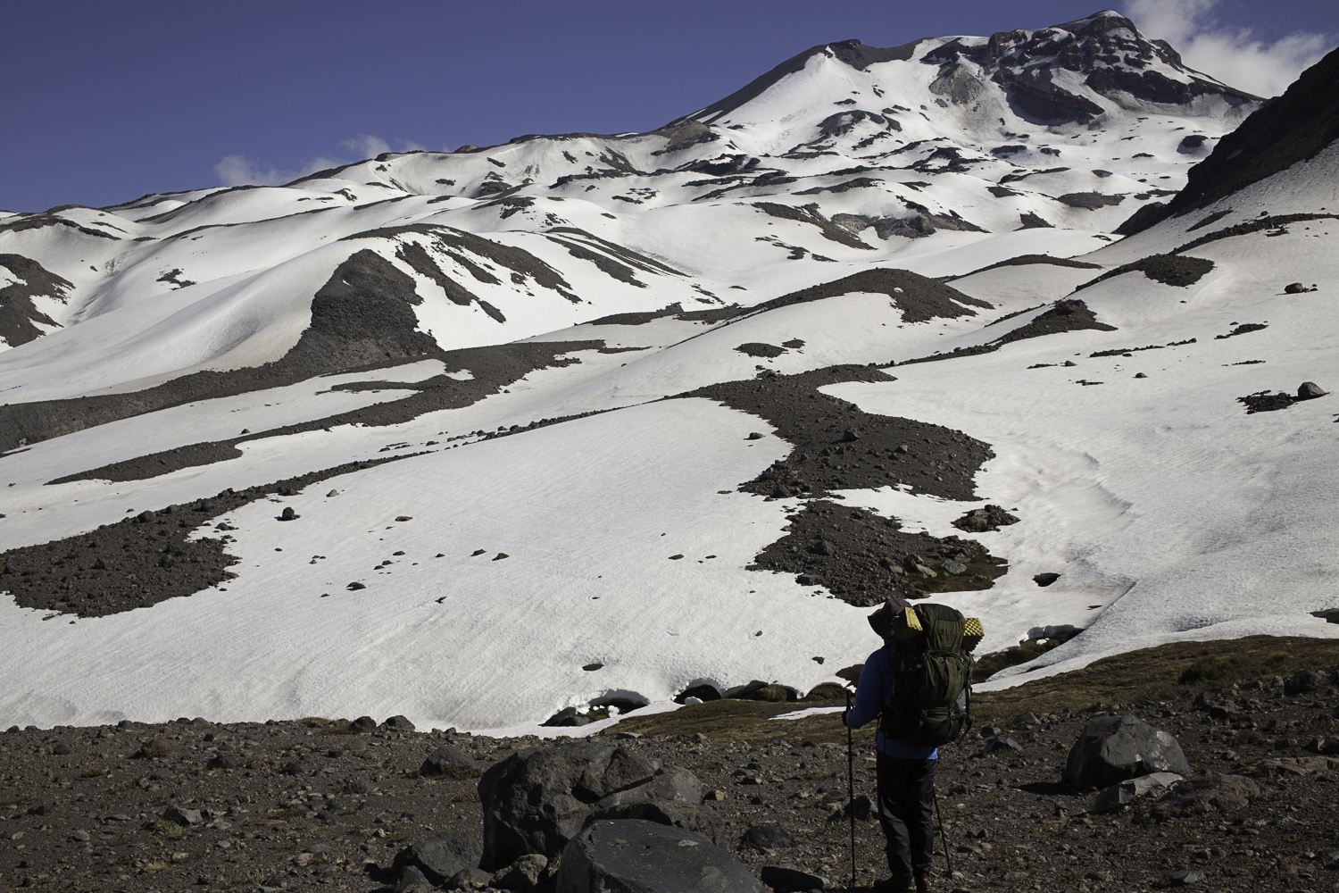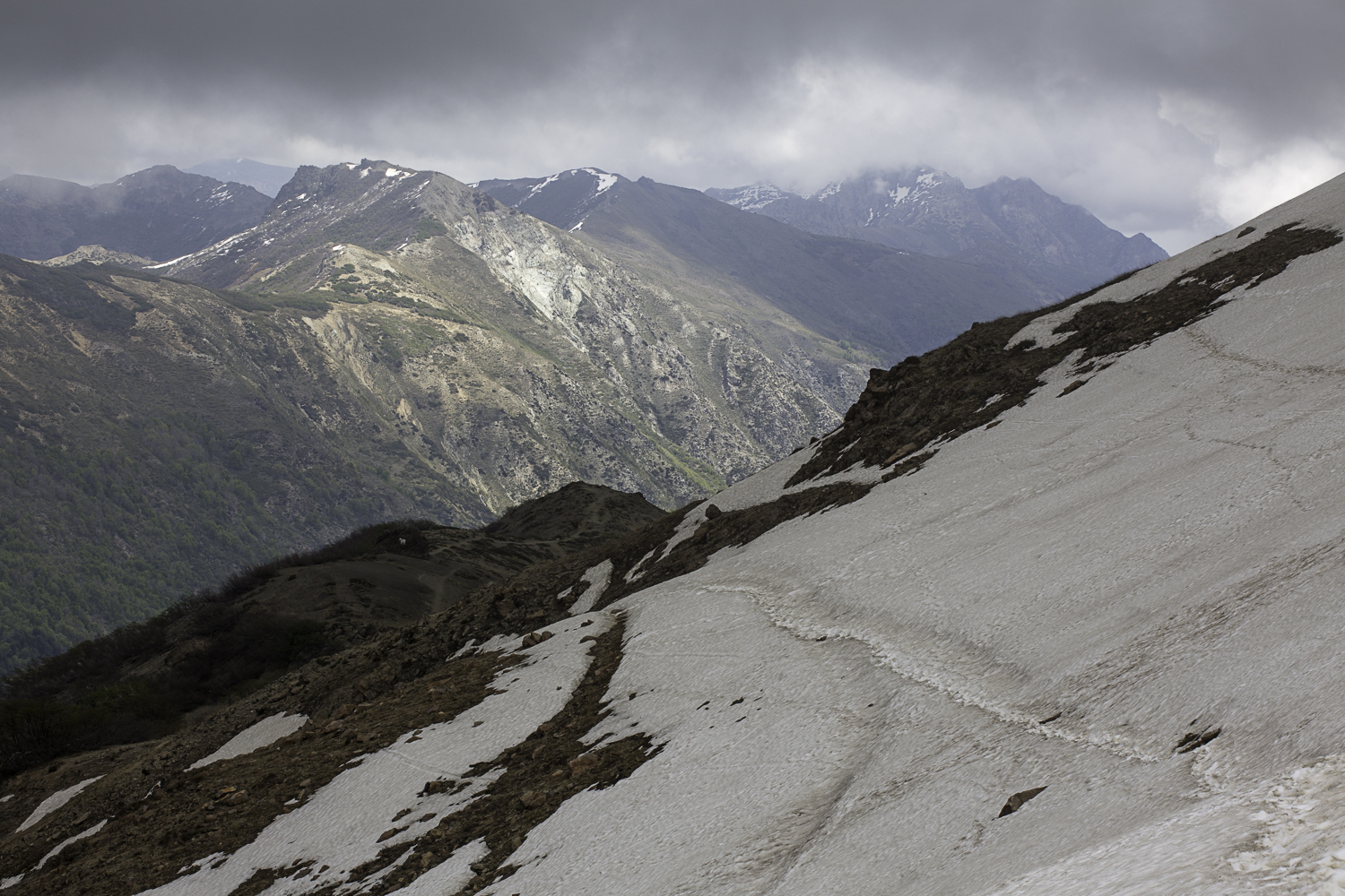 Niebo znów jest bezchmurne, niebieskie, na Antuco bieli się warstwa świeżego śniegu lub gradu? Podchodzimy długim lawowym polem. Nie ma już znaków, nie widać śladów deptania, co jakiś czas znajduję kopczyk. To surowe skały, sporo uskoków i obejść. Wyżej trafiamy na błoto i śnieg, tuż przed przełęczą robi się stromo. Drugą stronę grani nakrywa śnieg gruby nawet na kilka metrów. Pod nami naderwane nawisy, nadciąga chmura. Stąd na pewno nie da się zejść. Podchodzimy w stronę wulkanu, grzbietem nawisów, aż do jednego z wytopionych jęzorów opadających aż na dno doliny. Trzeba do niego bardzo stromo zejść, ale śnieg jest tu wystarczająco nośny i szybko stajemy na piarżysku. Nie jest łatwiej. Kamyki są mokre, podłoże rozmiękłe i śliskie. Zsuwamy się na wielką płaską połać śniegu, we mgłę. Kiedy mijamy miejsce gdzie z przełęczy opada nasz szlak, chmura rozrzedza się i widać potężne nawisy i kilka świeżych śladów lawinek. Odchodzimy dalej od zbocza i trochę się gubimy przed zejściem. Szlak opada nad rzekę, to kilkaset metrów stromizny, nie wiemy gdzie i gdyby nie kopczyk na wytopionej już piaszczystej górce być może byśmy się nie dowiedzieli. Dobrze iść ścieżką, choć czasem się rozpływa w skałach i gubi. Jest stromo, bywa grząsko. Oddychamy z ulgą na dole. Teraz tylko kilometry wzdłuż rzeki. Dolinę porastają regularne kępy traw. Granicy z Argentyną strzeże mur kolorowych gór. Za nami kłębi się ogromna chmura, wystaje z niej tylko szczyt Sierra Velluda.