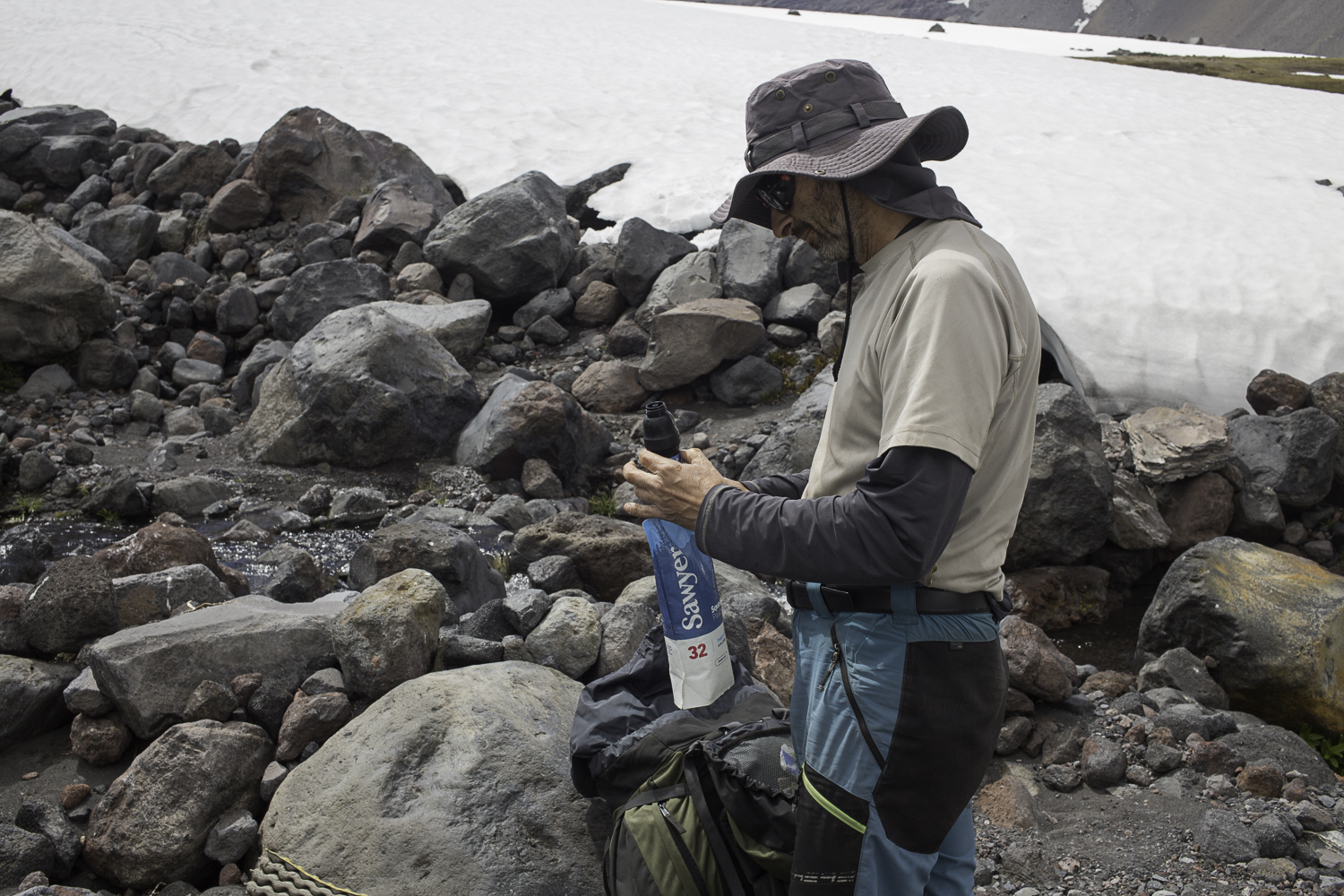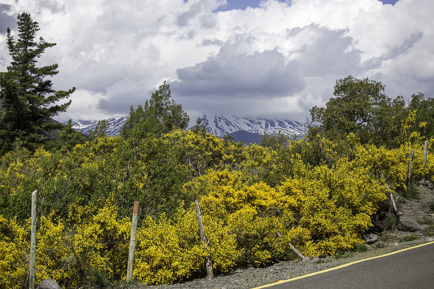 -Wróć- mówię- zaczekam, tak tu pięknie. Jose zrzuca plecak i zbiega. Tracę go szybko z oczu więc odwracam się w górę doliny. Lawowe pole jest pozarastane. Kępy traw, kolczaste kwitnące na żółto krzewy i łachy piachu podeptane racicami. Nie wiem może bywają tu krowy? Na grani ciągnącej się wzdłuż Laguna del Laja wiesza się warstwa szarawych chmur. Nie potrafię rozpoznać zboczy, miejsce, którym wtedy zeszłyśmy zasłania grzbiet. Kiedy znów wyglądam w stronę ścieżki Jose jest już blisko. Z daleka widzę, że nie ma kapelusza i zaczynam myśleć czym go zastąpić. Rondo z bambusa (szkoda, że tu nie rosną) z naciągniętą skarpetą?… Rondo z karimaty?…Daszek z tektury? Mam tylko mapy, może gdyby je zszyć? Promieniowanie UV jest bardzo wysokie w Chile, smarujemy się kremami z filtrem, powtarzamy to kilkukrotnie w ciągu dnia, ale to zdecydowanie za mało, Jose jest prawie łysy, spali się. Tymczasem naciąga na głowę buffa, a słońce bezlitośnie praży jego baskijski nos. Źle to wygląda.