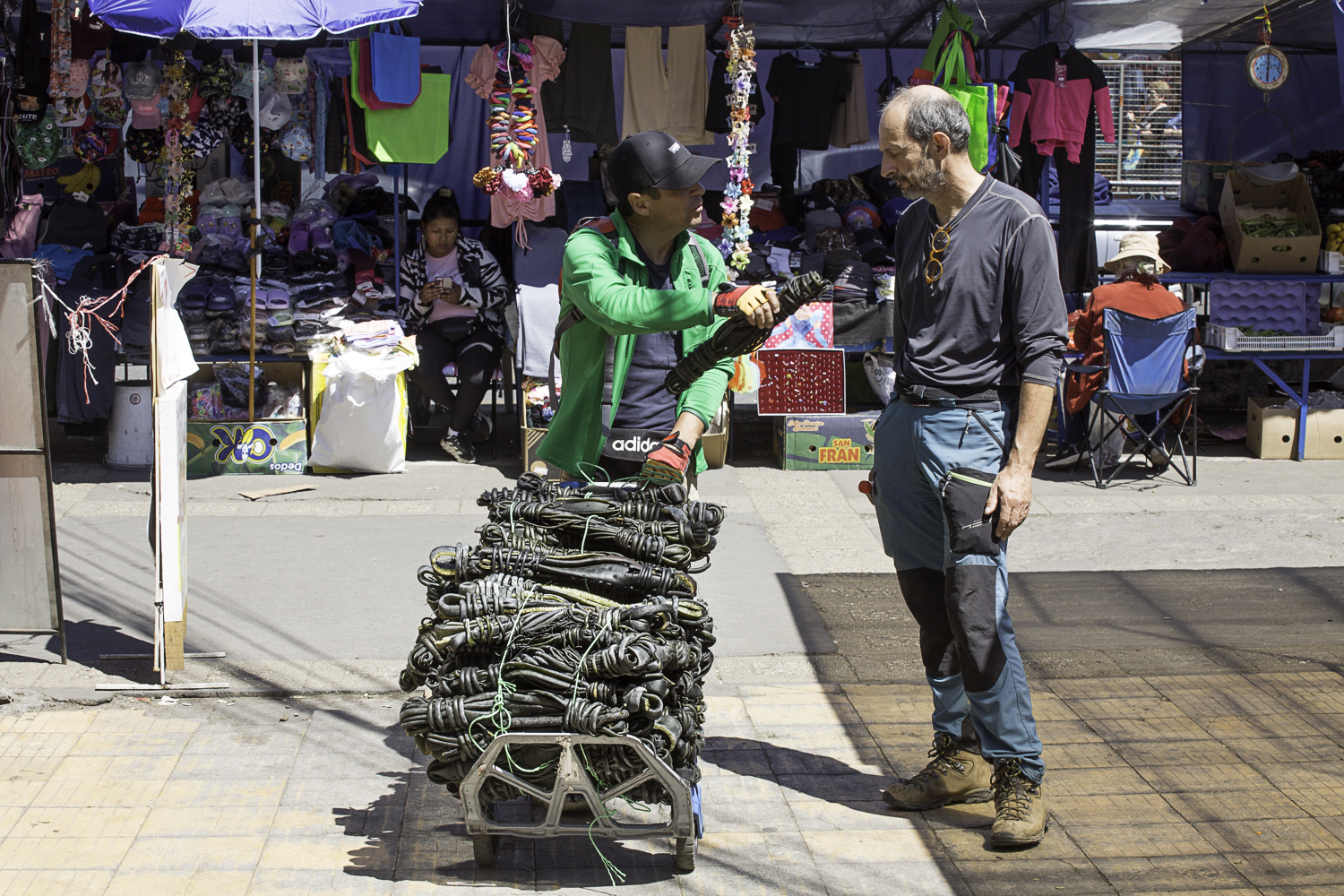 Za brodem znów znajdujemy lepszy szlak, i choć gubimy go jeszcze kilka razy sprawnie schodzimy niemal na sam dół. Widać już wieś. Z dołu podjeżdża mężczyzna. Ubrany w poncho i czyste białe spodnie (z odwróconych na drugą stronę kozich skór) z siodłem ozdobionym kolorową wełną wygląda przy nas jak model. Jesteśmy brudni, zmęczeni. Mężczyzna staje i rozmawia z Jose.