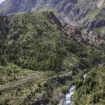 Niżej szlak zbliża się do rzeki, wbija w krzaki, a potem w rzadki las. Przybywa araukarii, ale rosną też bardzo trudności. Wielokrotnie przebijamy się przez potok, i naniesione przez powodzie sterty zwalonych drzew. Wspinamy na zbocza, obchodzimy po grząskich skarpach. Już blisko noc, widać że nie zejdziemy do wsi. Jose znajduje dobre miejsce na skarpie w zakolu rzeki. Po wodę trzeba daleko zejść, ale jest płasko, zacisznie. Wokół sterty chrustu i suszonych krowich kup (na opał). Przed nocą na moment błyska słońce. Od rana pada.