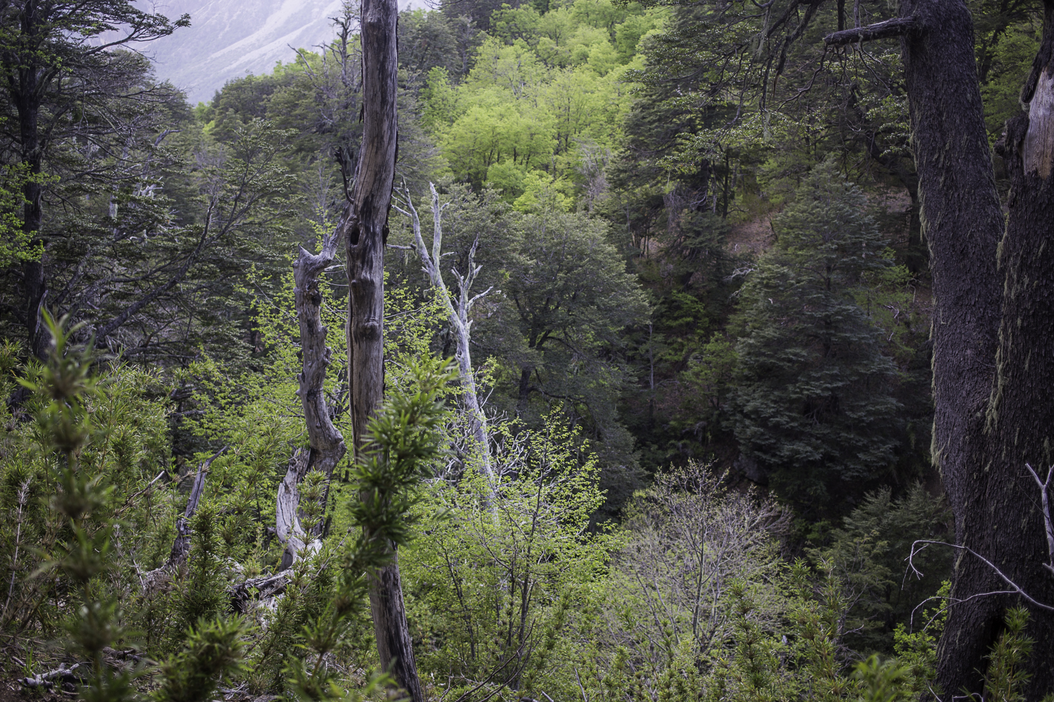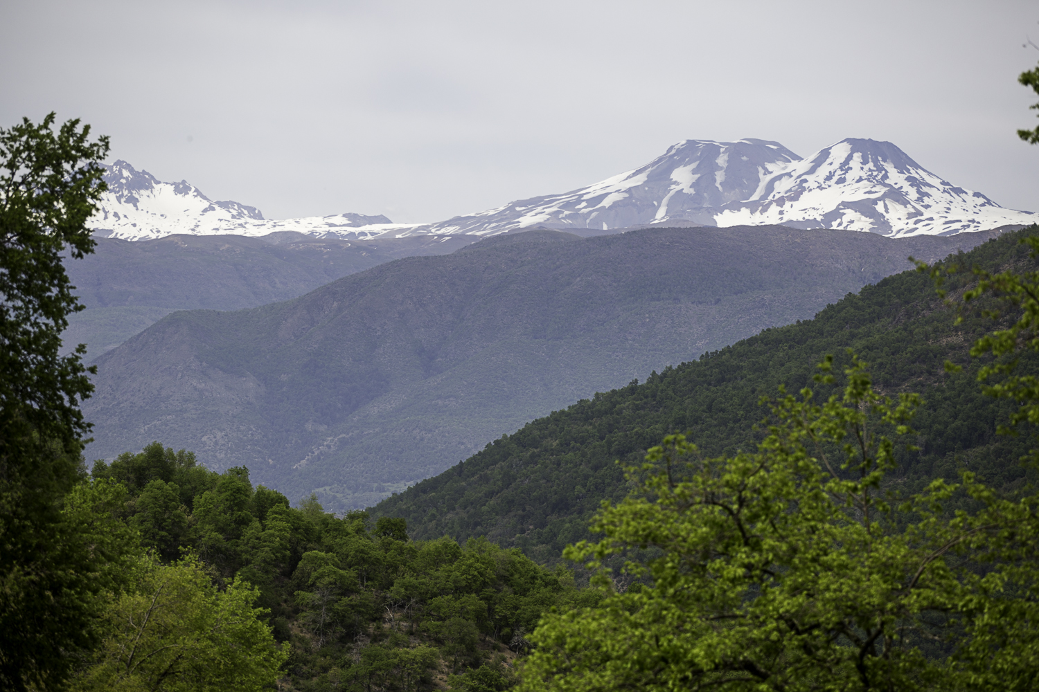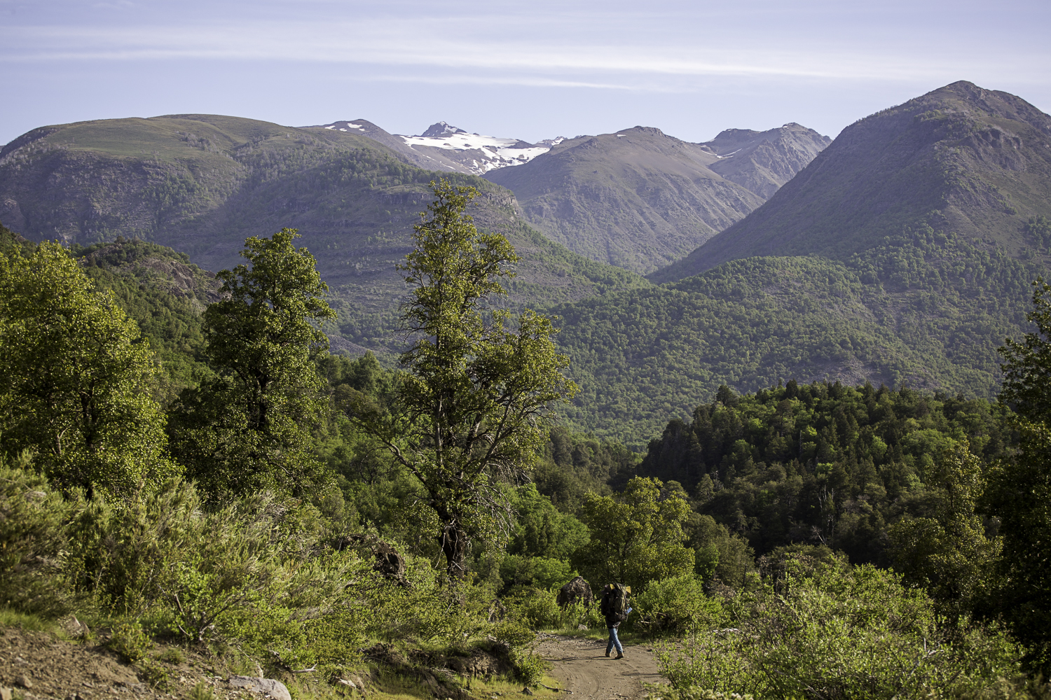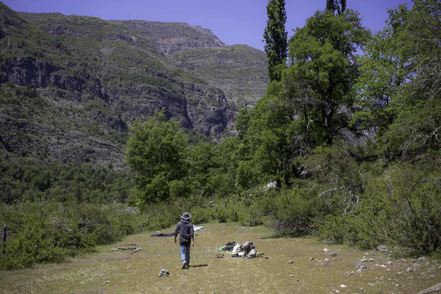 Do przedpołudnia wędrujemy labityntem pozwalanych pni, aż teren zaczyna się lekko wypołaszczać. Ślad w nawigacji jest już tuż tuż. Docieramy do niego za brodem zimnym, ale zupelnie nietrudnym. Tu na halach Estero Quebrado jest zwykłą rzeczką. Z zadowoleniem zakładam z powrotem górskie buty, nie myśląc że zaznaczony w nawigacji ślad zaraz zniknie i przez kilka godzin będziemy co i rusz przekraczać nurt szukając najłatwiejszych miejsc. Rzeczka naniosła zwalonych drzew, porozmywała stok, porozlewała się w odnogi i wypełniła bagienka. Wszystko to rozdeptały krowy. Zostało mnóstwo zeszłorocznych placków i połamanych krzaków. Wolno nam idzie. Za halą przedzieramy się przez bezlistny lasek i krowie tropy zbierają się w jeden trakt. Wspina się na strome piaszczyste zbocze. Z góry otwiera się wspaniały widok na dolinę, z przełęczy zasypanej ponad metrowym śniegiem też na dwa piękne wulkany. Nevado de Chillan i Chillan Nuevo.