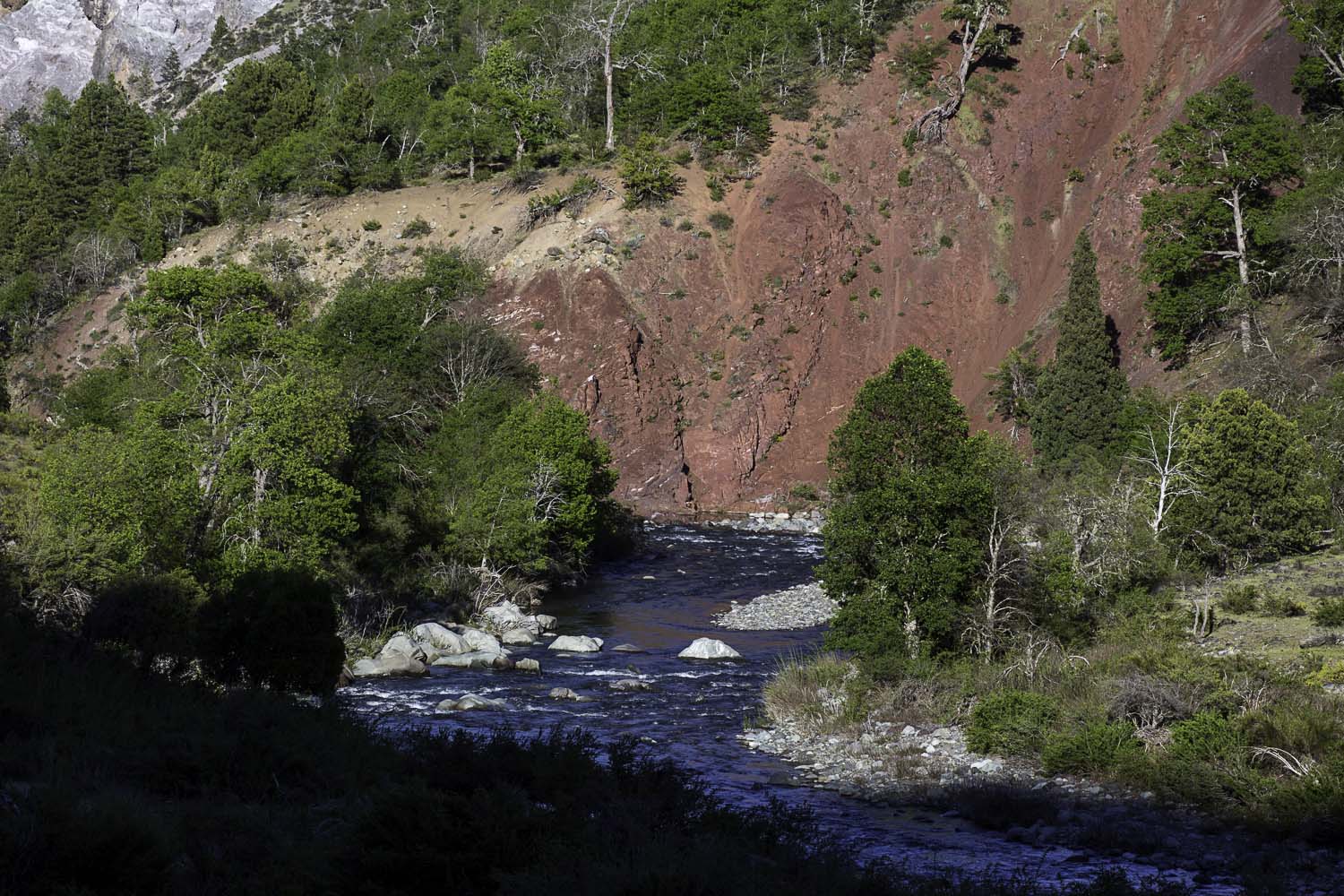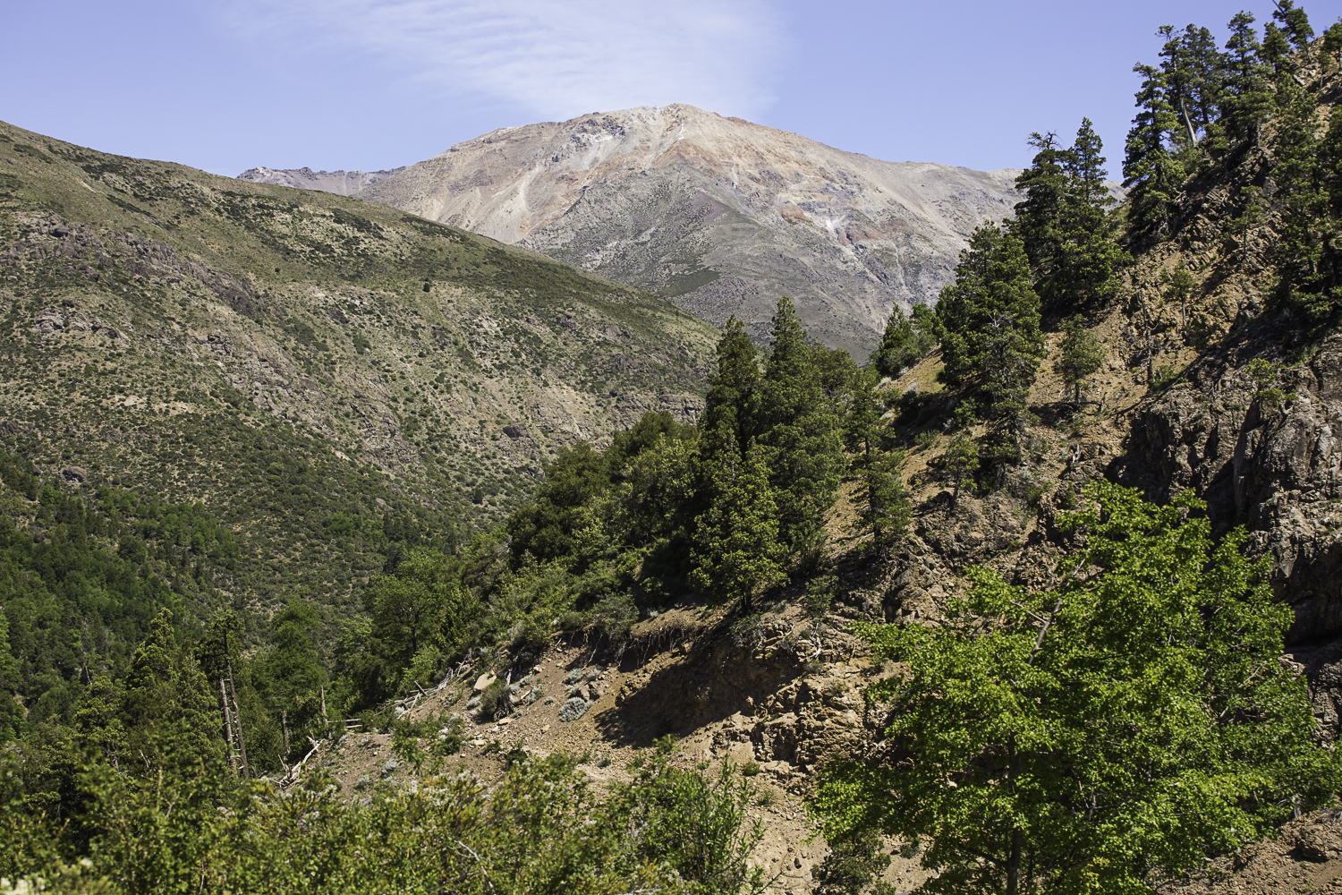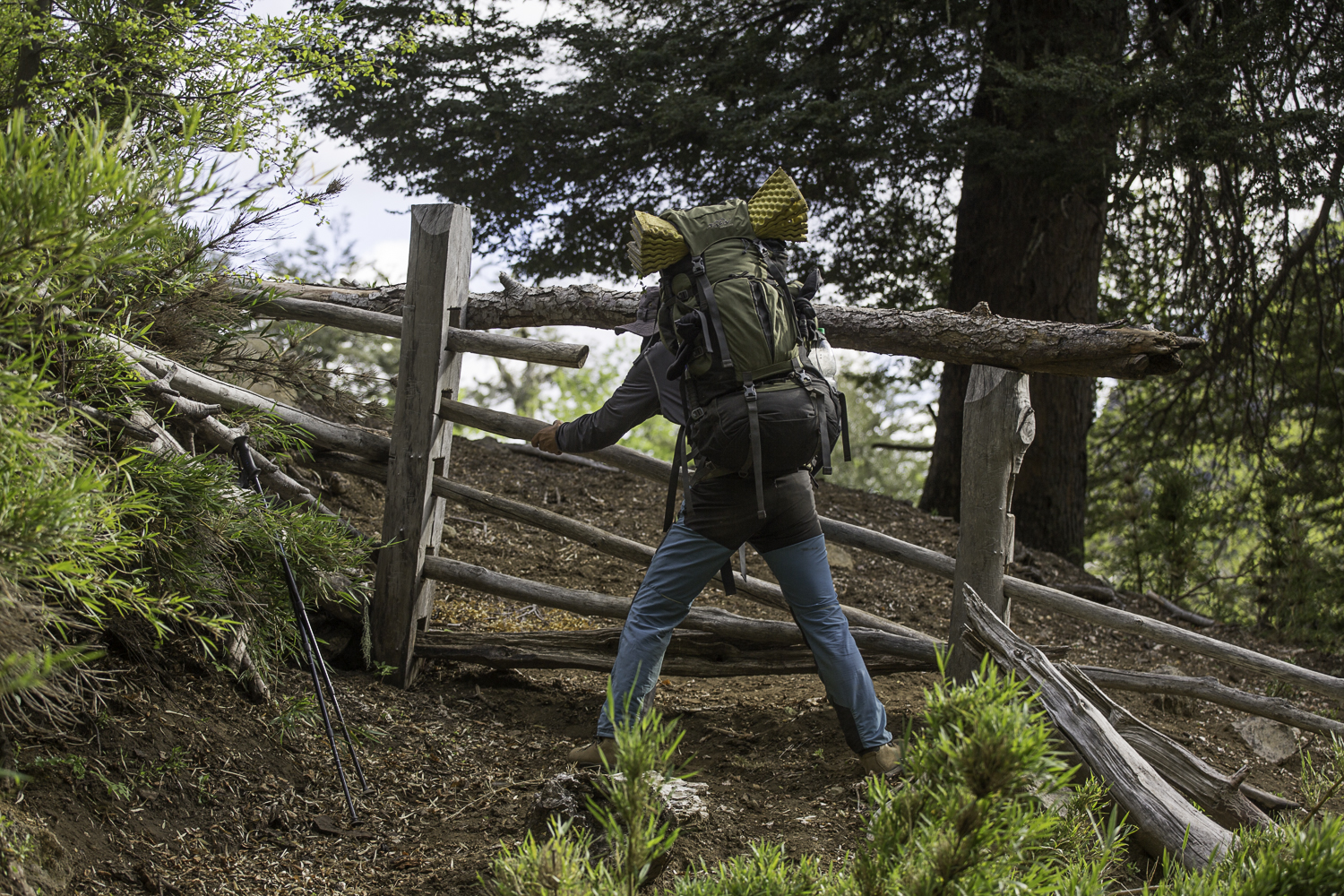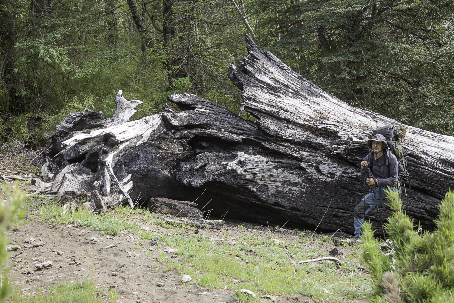 Do przedpołudnia wędrujemy labityntem pozwalanych pni, aż teren zaczyna się lekko wypołaszczać. Ślad w nawigacji jest już tuż tuż. Docieramy do niego za brodem zimnym, ale zupelnie nietrudnym. Tu na halach Estero Quebrado jest zwykłą rzeczką. Z zadowoleniem zakładam z powrotem górskie buty, nie myśląc że zaznaczony w nawigacji ślad zaraz zniknie i przez kilka godzin będziemy co i rusz przekraczać nurt szukając najłatwiejszych miejsc. Rzeczka naniosła zwalonych drzew, porozmywała stok, porozlewała się w odnogi i wypełniła bagienka. Wszystko to rozdeptały krowy. Zostało mnóstwo zeszłorocznych placków i połamanych krzaków. Wolno nam idzie. Za halą przedzieramy się przez bezlistny lasek i krowie tropy zbierają się w jeden trakt. Wspina się na strome piaszczyste zbocze. Z góry otwiera się wspaniały widok na dolinę, z przełęczy zasypanej ponad metrowym śniegiem też na dwa piękne wulkany. Nevado de Chillan i Chillan Nuevo.