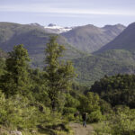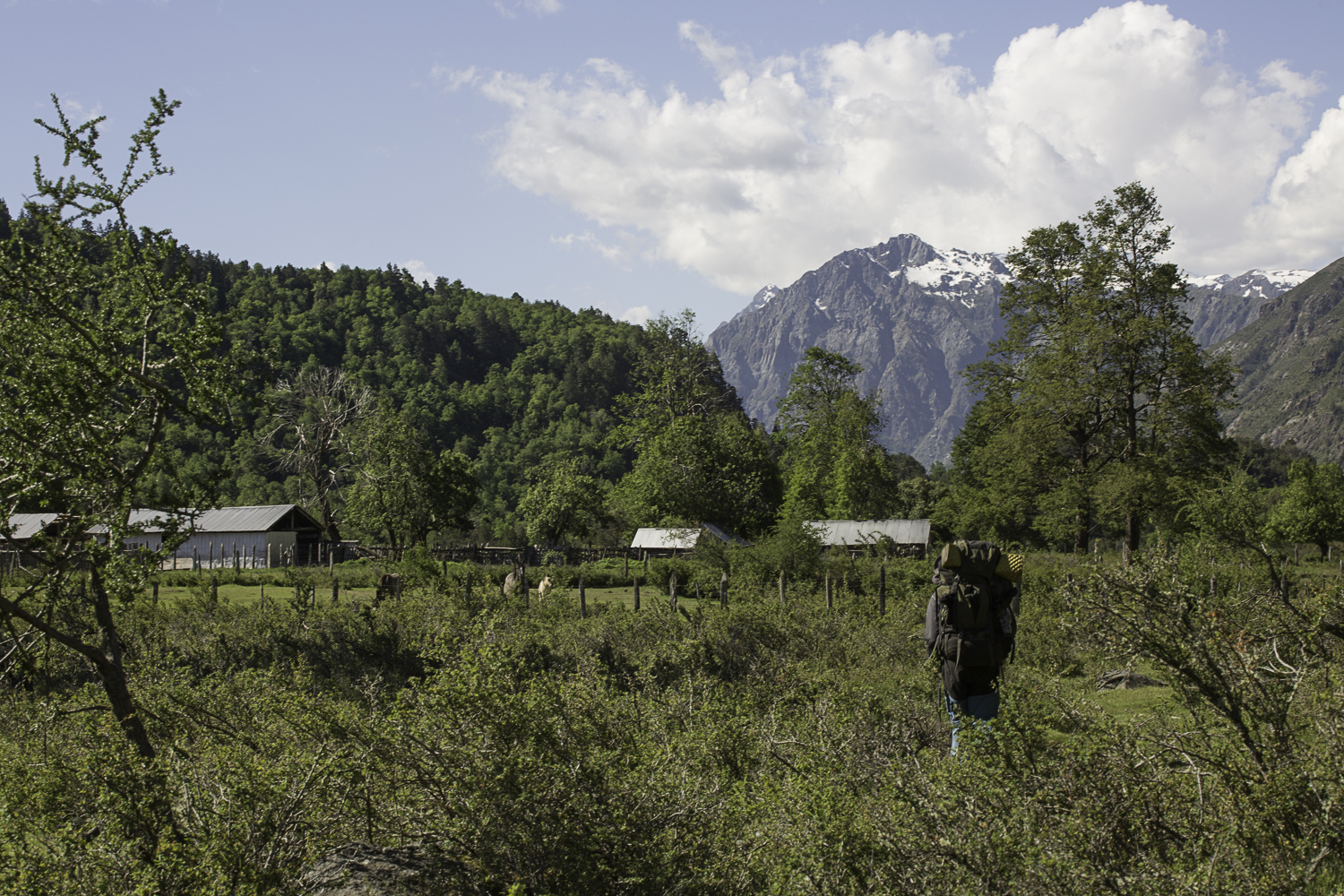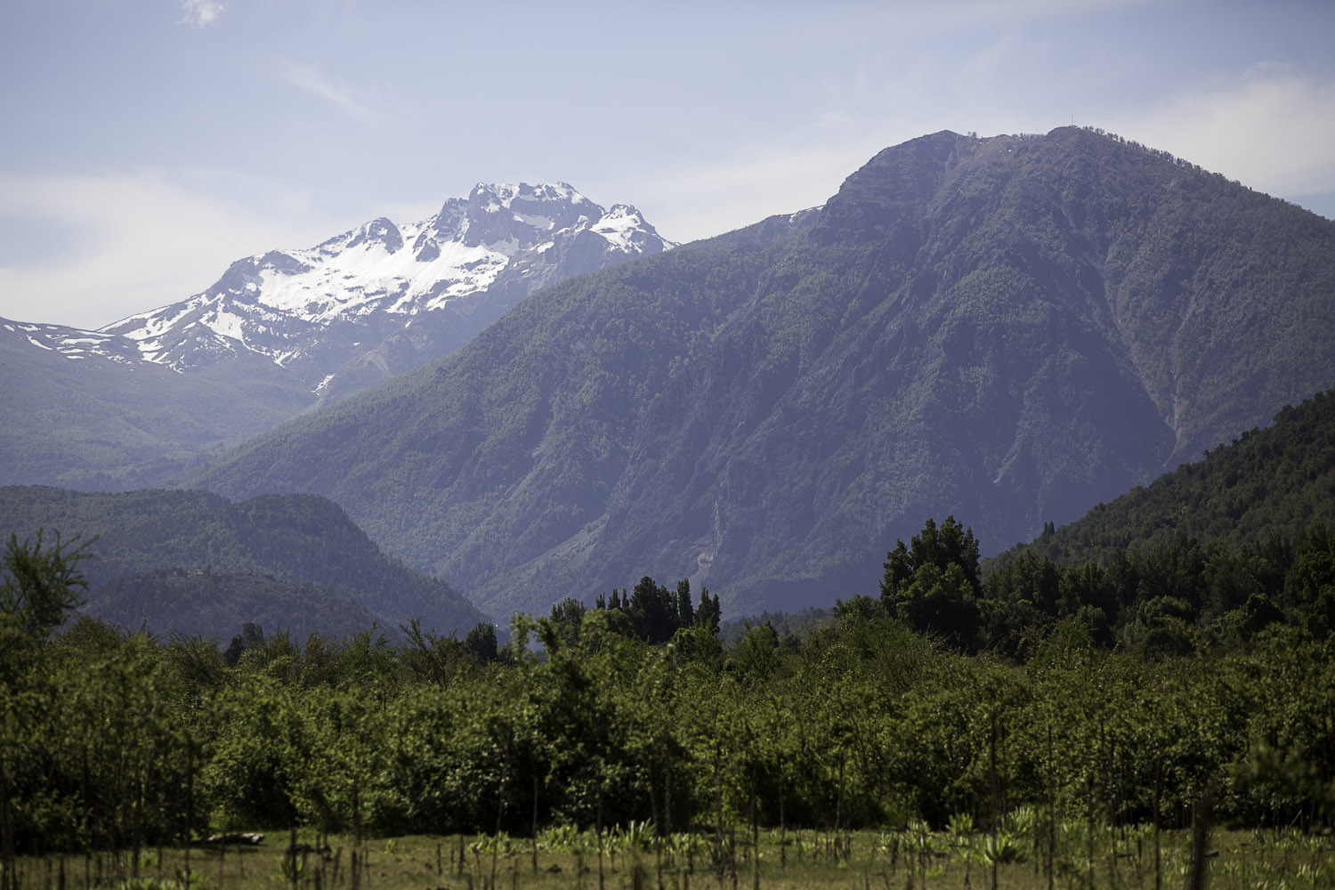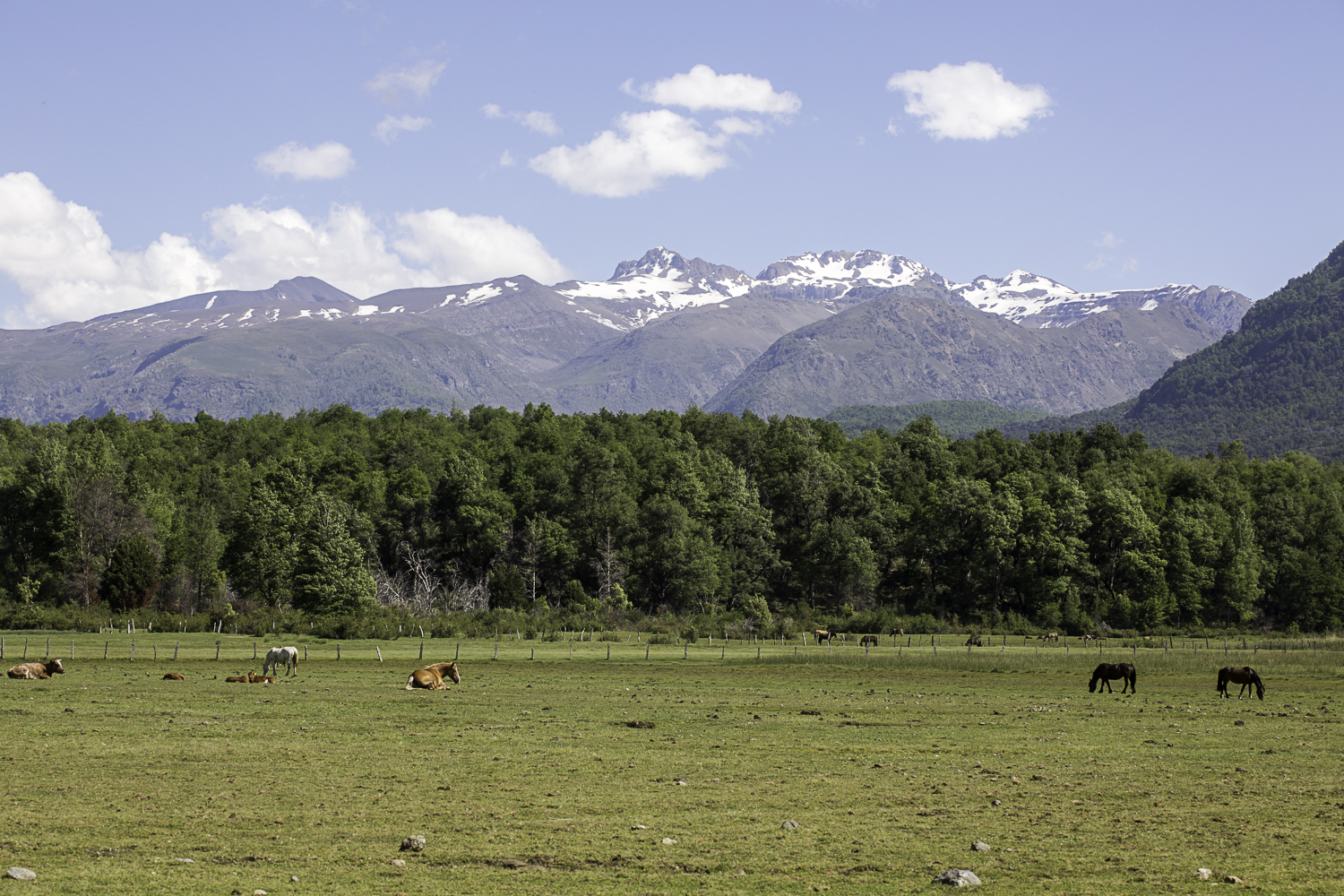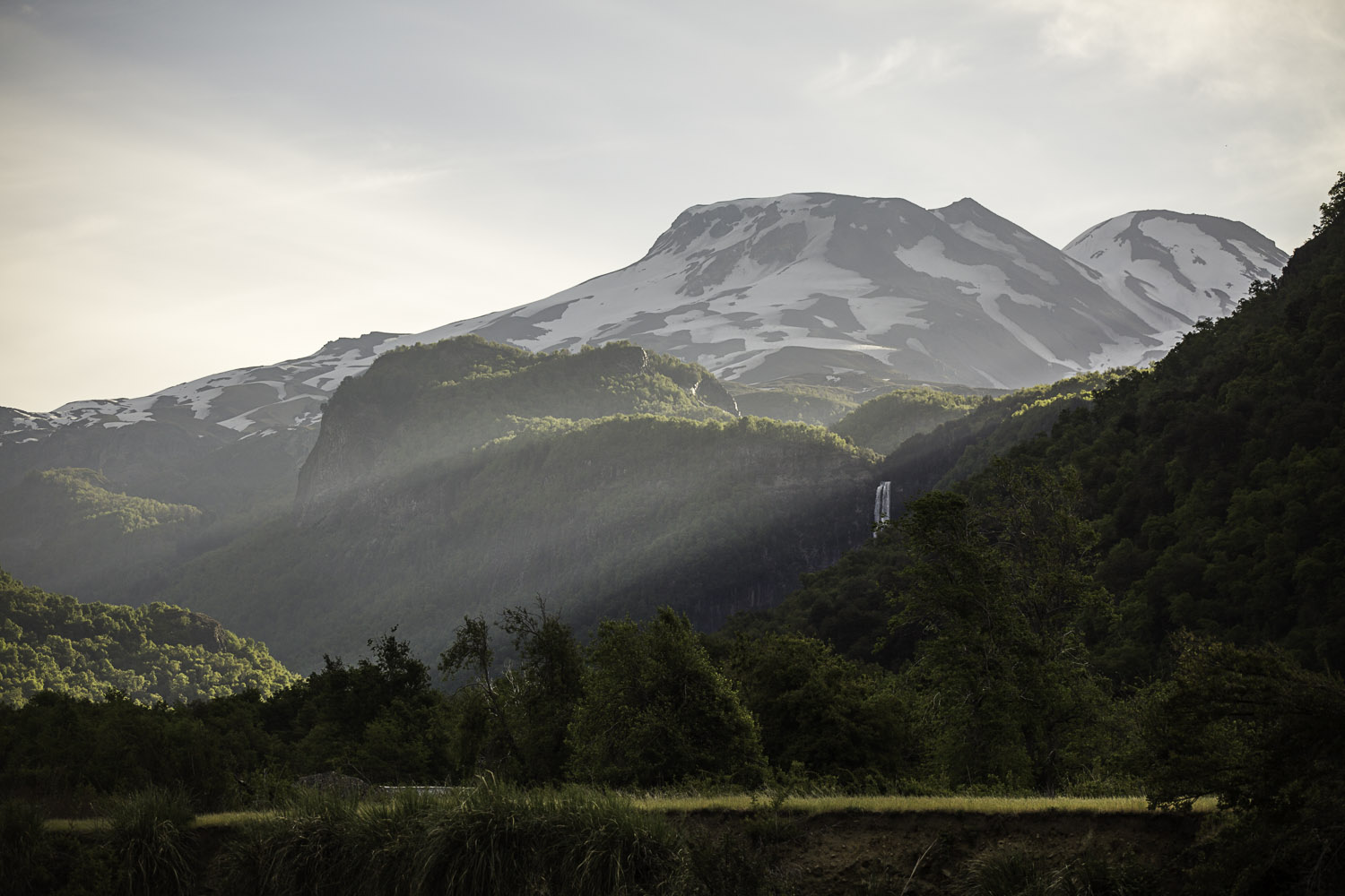 Do przedpołudnia wędrujemy labityntem pozwalanych pni, aż teren zaczyna się lekko wypołaszczać. Ślad w nawigacji jest już tuż tuż. Docieramy do niego za brodem zimnym, ale zupelnie nietrudnym. Tu na halach Estero Quebrado jest zwykłą rzeczką. Z zadowoleniem zakładam z powrotem górskie buty, nie myśląc że zaznaczony w nawigacji ślad zaraz zniknie i przez kilka godzin będziemy co i rusz przekraczać nurt szukając najłatwiejszych miejsc. Rzeczka naniosła zwalonych drzew, porozmywała stok, porozlewała się w odnogi i wypełniła bagienka. Wszystko to rozdeptały krowy. Zostało mnóstwo zeszłorocznych placków i połamanych krzaków. Wolno nam idzie. Za halą przedzieramy się przez bezlistny lasek i krowie tropy zbierają się w jeden trakt. Wspina się na strome piaszczyste zbocze. Z góry otwiera się wspaniały widok na dolinę, z przełęczy zasypanej ponad metrowym śniegiem też na dwa piękne wulkany. Nevado de Chillan i Chillan Nuevo.