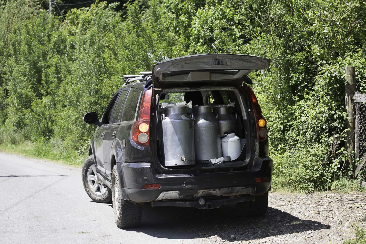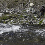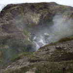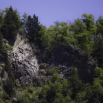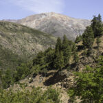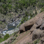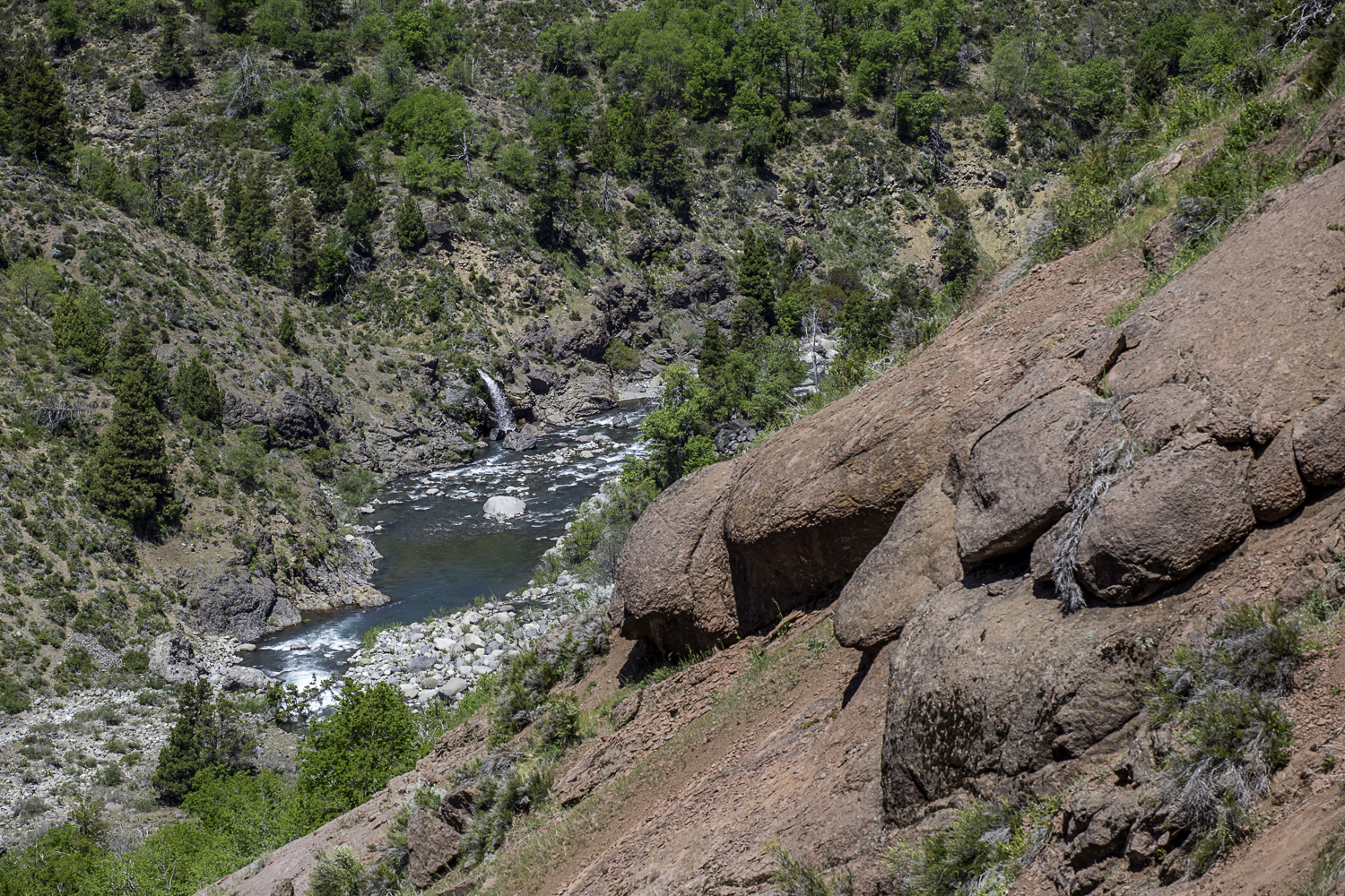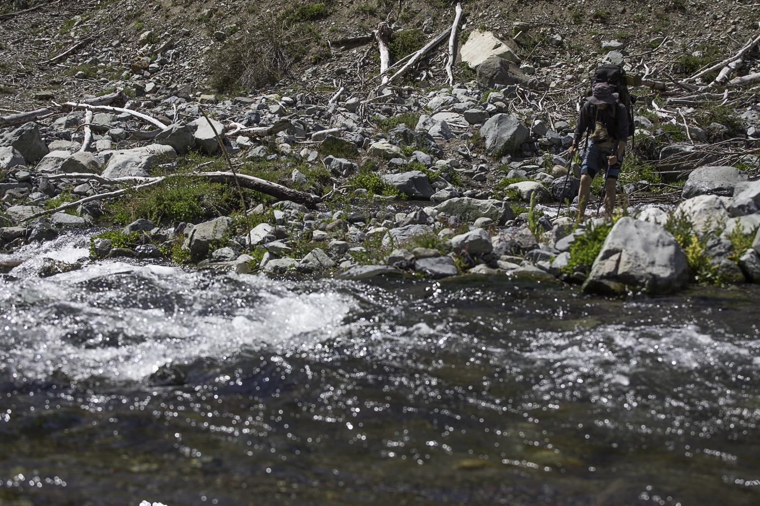 Idziemy ścieżką zdziwieni, że nam o niej nie powiedział jest wyraźna. Las pachnie rozgrzanymi igłami, rzeka wbita w skalne koryto jest biała. Przed potokiem wchodzimy na kamienistą górkę, ścieżka opada z niej bardzo stromo, schodzę kawałek ostrożnie, zostawiam plecak. Potok huczy jeszcze z 10 metrów niżej, ostatnie 3 czy 4 to skała. W zasadzie pion. Jest już południe i strumień wygląda jak pospieszny pociąg.