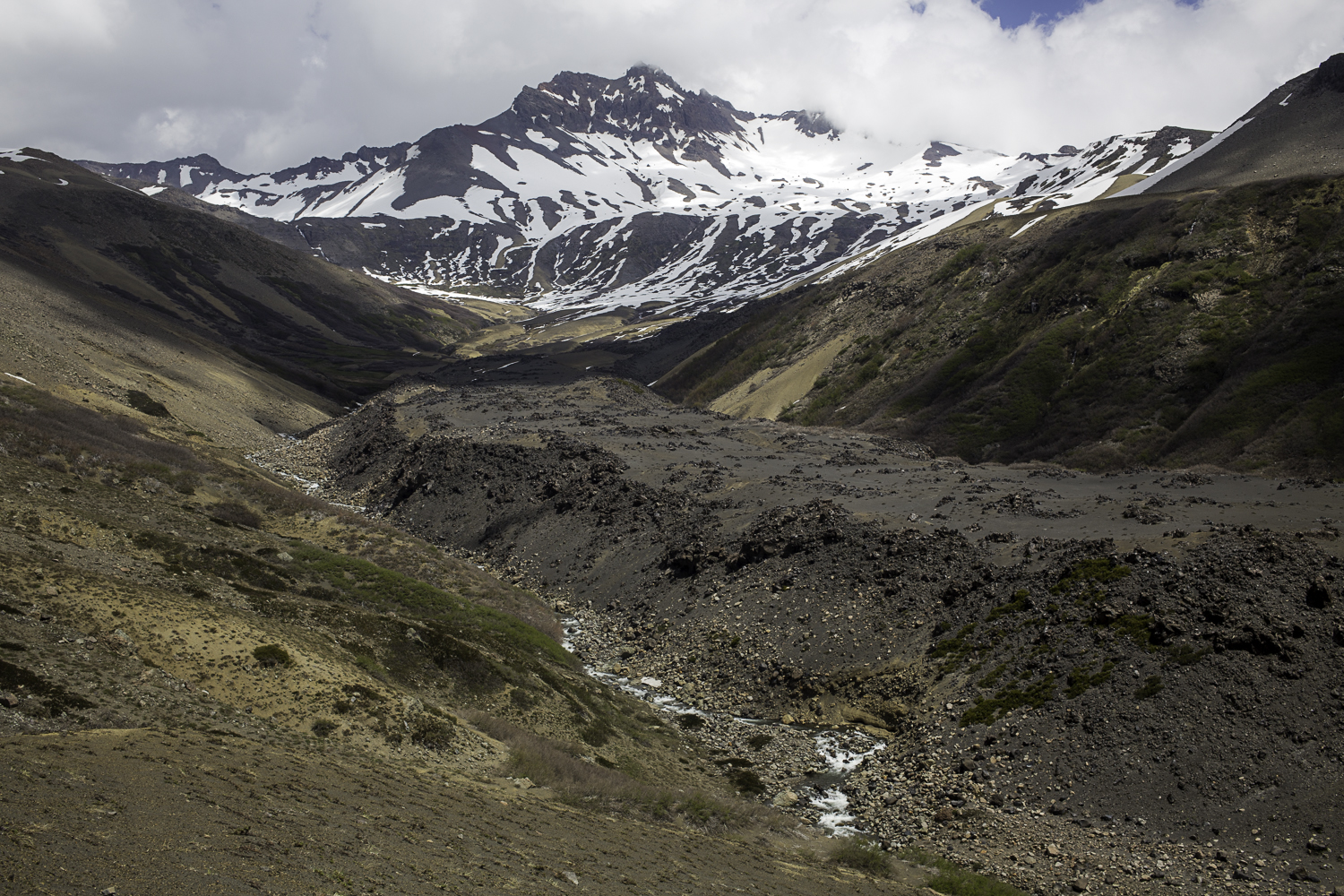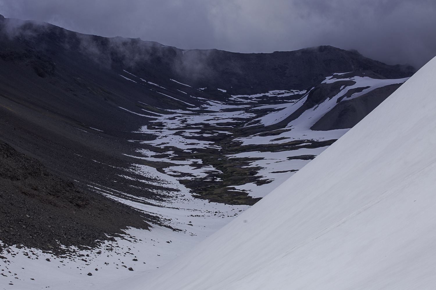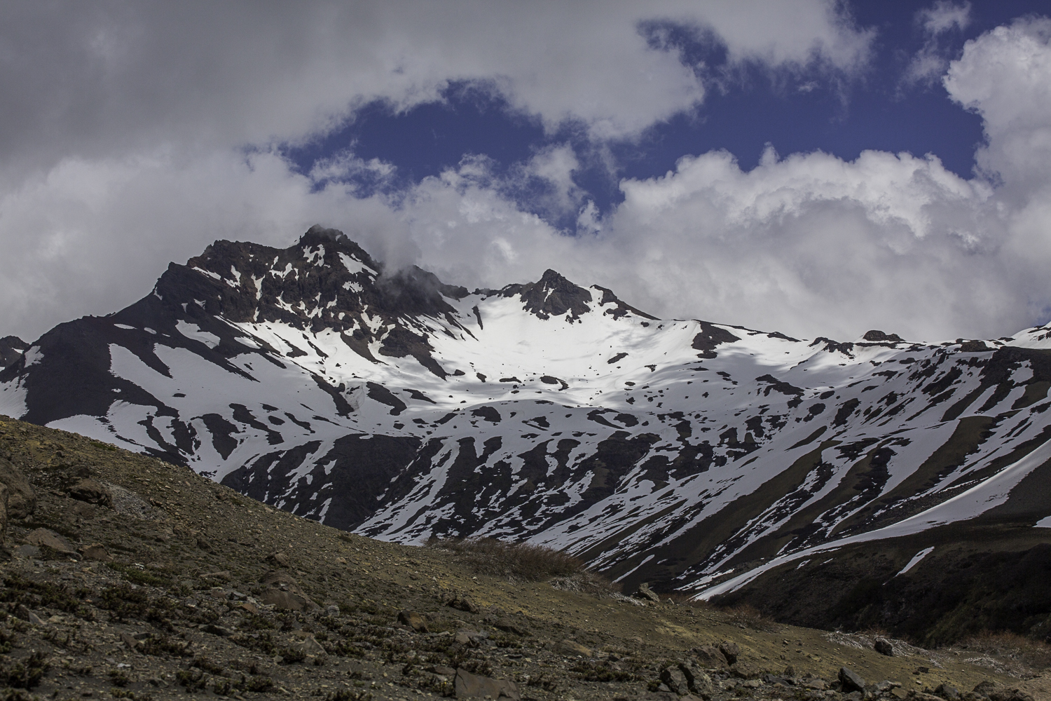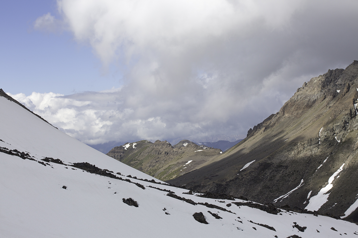 Zejścia nie widać, ale mam nawigację. Ścieżka po zimie zawiana, wyrównana przez wiatr schodzi trawersem po miękkim piachu. Nie ma roślin, niżej pojawia się galimatias skał. Bród na Rio las Minas jest głęboki i lodowaty, nietrudny. Podejścia na lawowe pole nie widać i sporo tam kluczymy w stromiznach z ruchomych skał przysypanych śnieżnymi mostami. Potem jeszcze więcej na łączkach nasiąkłych jak bagna, bo dopiero co z nich zeszedł śnieg. Zbocze rozmiękło. Jest stromo, wieje zimny wiatr. Wspinamy się krok po kroku. Jestem zmęczona. Przed nami kilometry przez głęboki śnieg. Z grani widać ośnieżone wulkany. Chmury rwą się, razi rozproszone światło. Jest lodowato i pięknie.