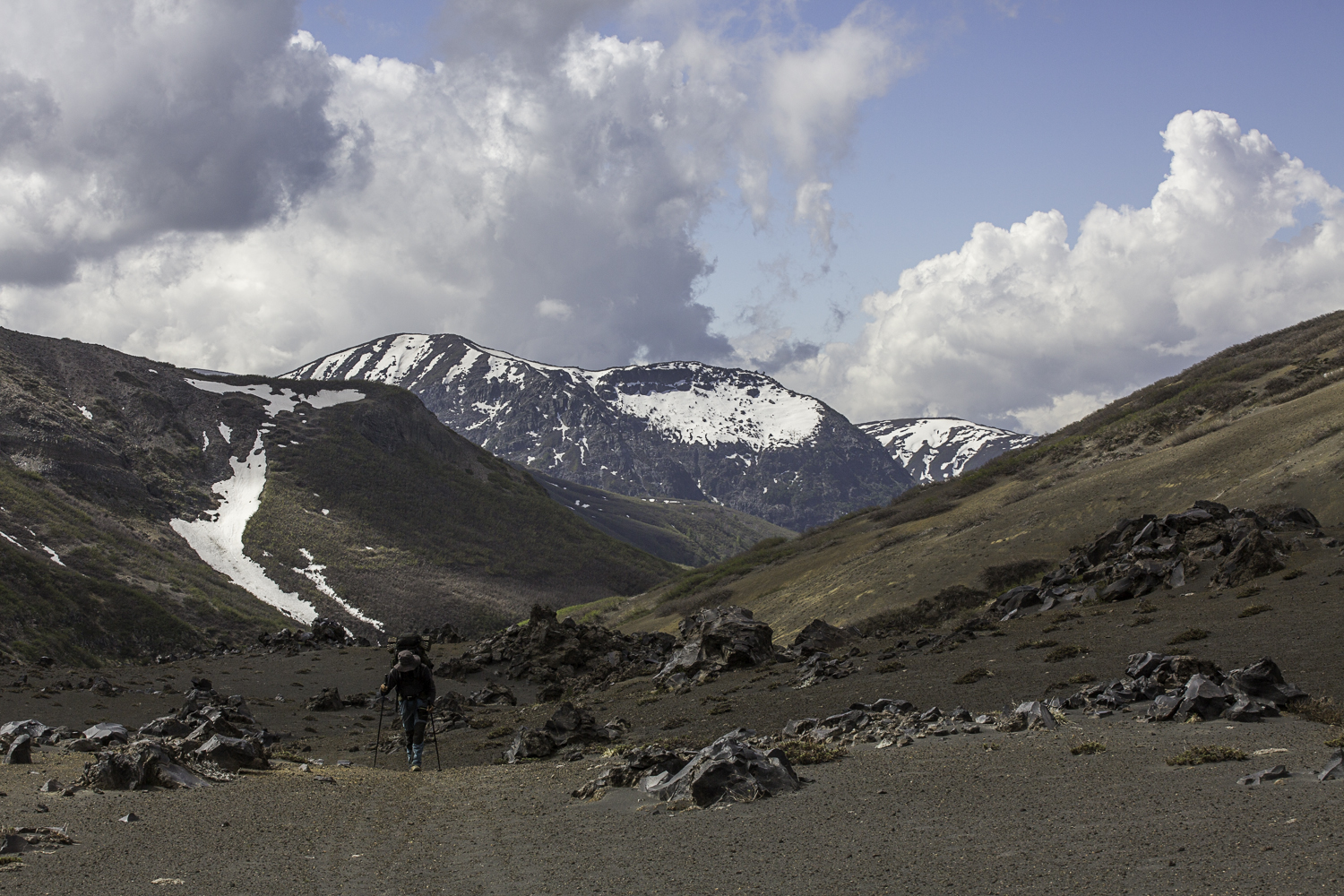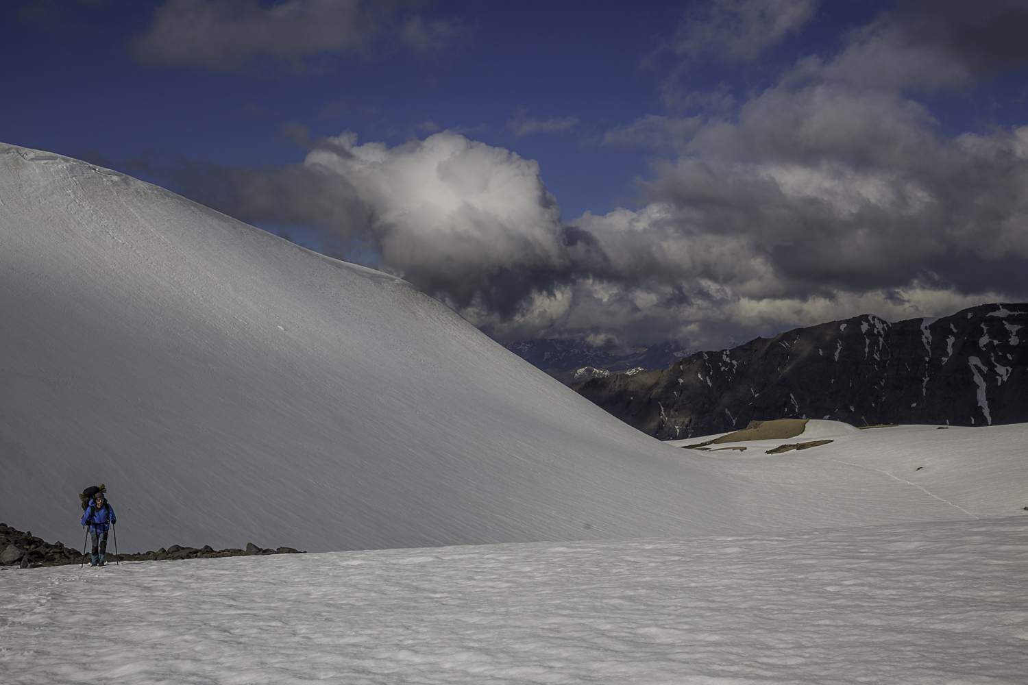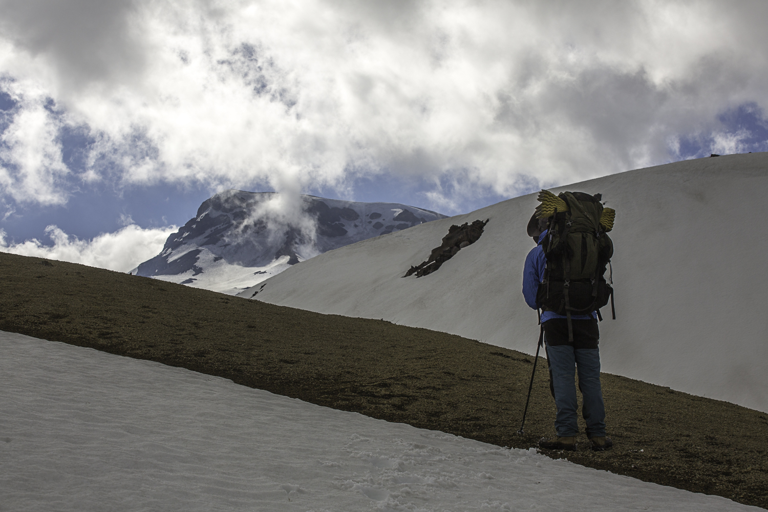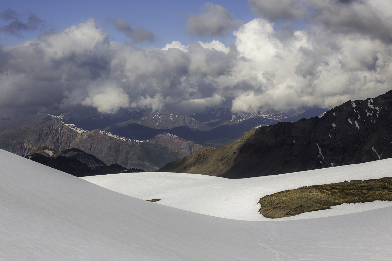 Zejścia nie widać, ale mam nawigację. Ścieżka po zimie zawiana, wyrównana przez wiatr schodzi trawersem po miękkim piachu. Nie ma roślin, niżej pojawia się galimatias skał. Bród na Rio las Minas jest głęboki i lodowaty, nietrudny. Podejścia na lawowe pole nie widać i sporo tam kluczymy w stromiznach z ruchomych skał przysypanych śnieżnymi mostami. Potem jeszcze więcej na łączkach nasiąkłych jak bagna, bo dopiero co z nich zeszedł śnieg. Zbocze rozmiękło. Jest stromo, wieje zimny wiatr. Wspinamy się krok po kroku. Jestem zmęczona. Przed nami kilometry przez głęboki śnieg. Z grani widać ośnieżone wulkany. Chmury rwą się, razi rozproszone światło. Jest lodowato i pięknie.