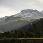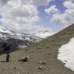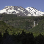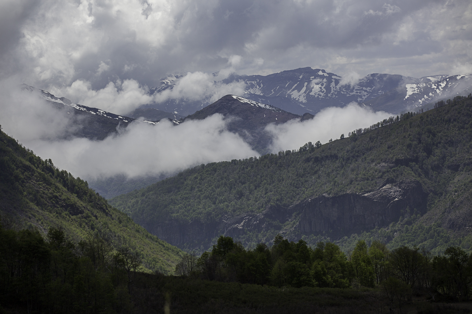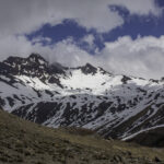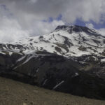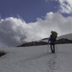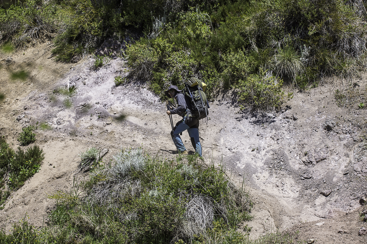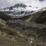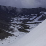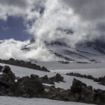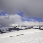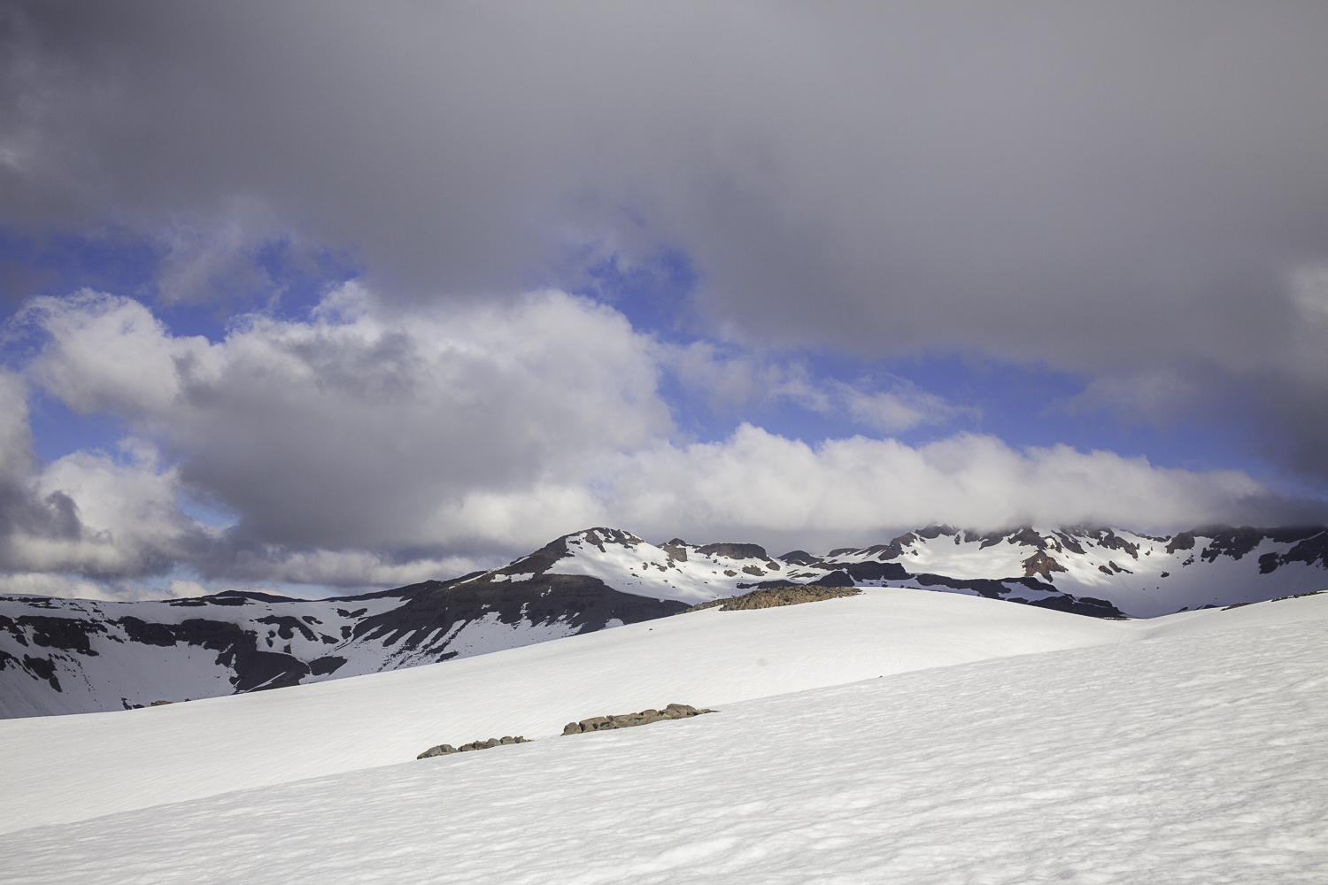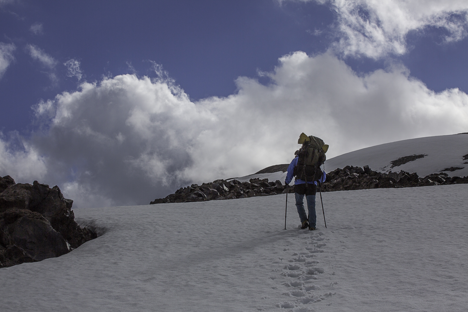 Zejścia nie widać, ale mam nawigację. Ścieżka po zimie zawiana, wyrównana przez wiatr schodzi trawersem po miękkim piachu. Nie ma roślin, niżej pojawia się galimatias skał. Bród na Rio las Minas jest głęboki i lodowaty, nietrudny. Podejścia na lawowe pole nie widać i sporo tam kluczymy w stromiznach z ruchomych skał przysypanych śnieżnymi mostami. Potem jeszcze więcej na łączkach nasiąkłych jak bagna, bo dopiero co z nich zeszedł śnieg. Zbocze rozmiękło. Jest stromo, wieje zimny wiatr. Wspinamy się krok po kroku. Jestem zmęczona. Przed nami kilometry przez głęboki śnieg. Z grani widać ośnieżone wulkany. Chmury rwą się, razi rozproszone światło. Jest lodowato i pięknie.