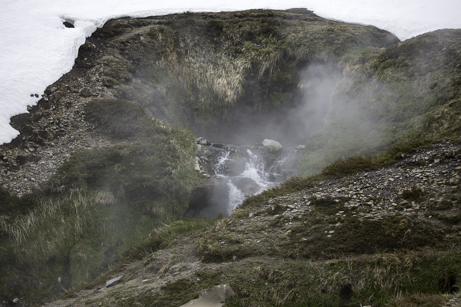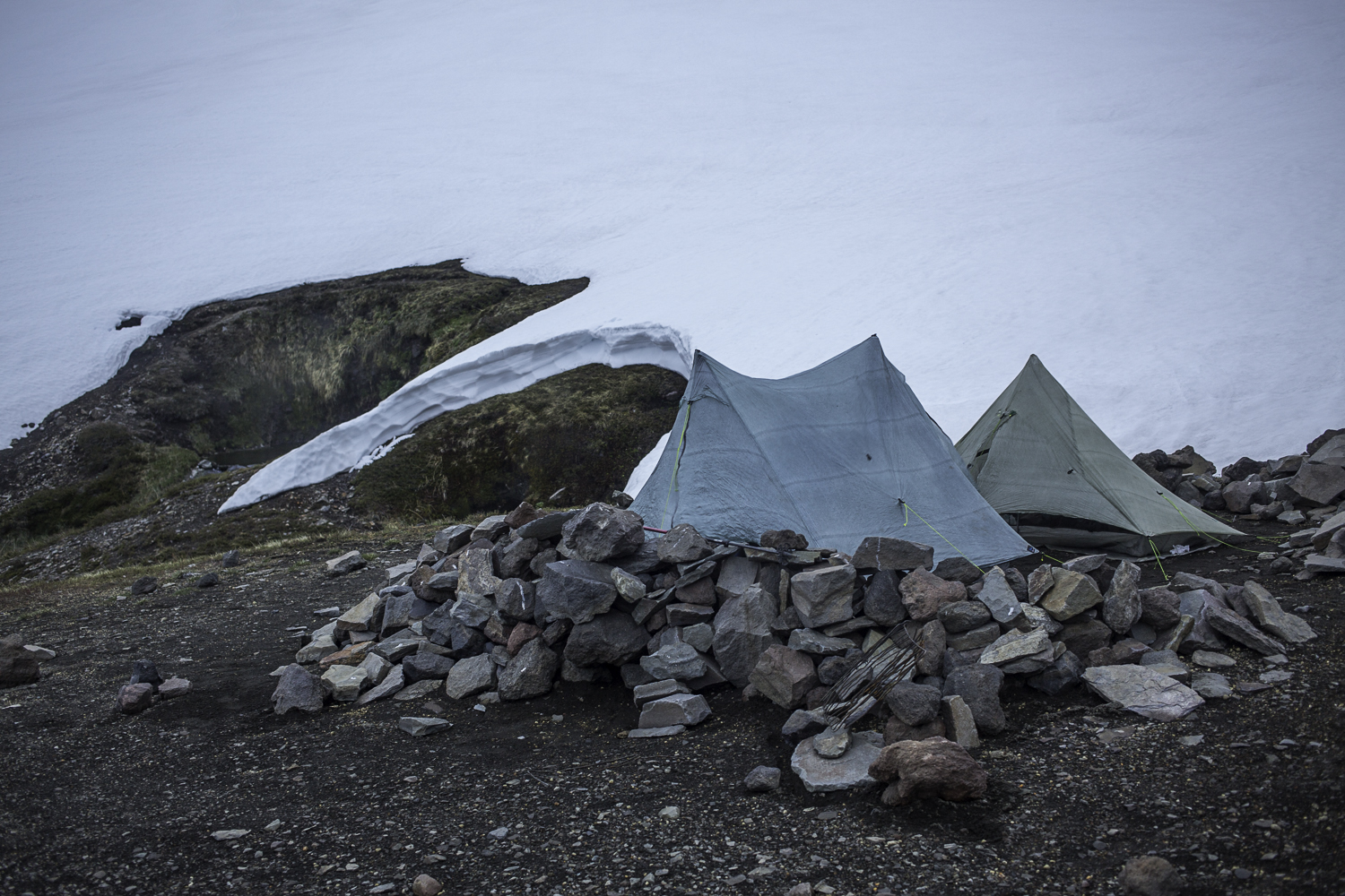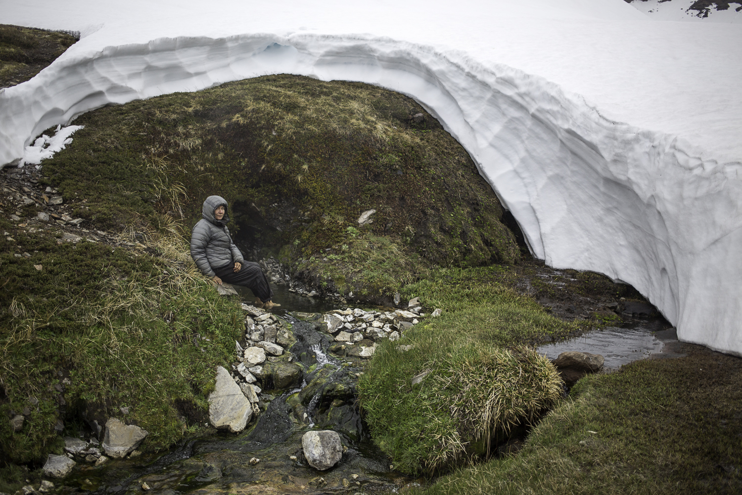 Schodzę aż zobaczę miejsce bez śniegu. Na suchszej górce ktoś wybudował kamienny płot. Wciskamy za nim namioty. Schodzę do potoku po wodę. Jest gorąca. Zimna wypływa z zaspy kilka metrów z boku. Co za luksus!